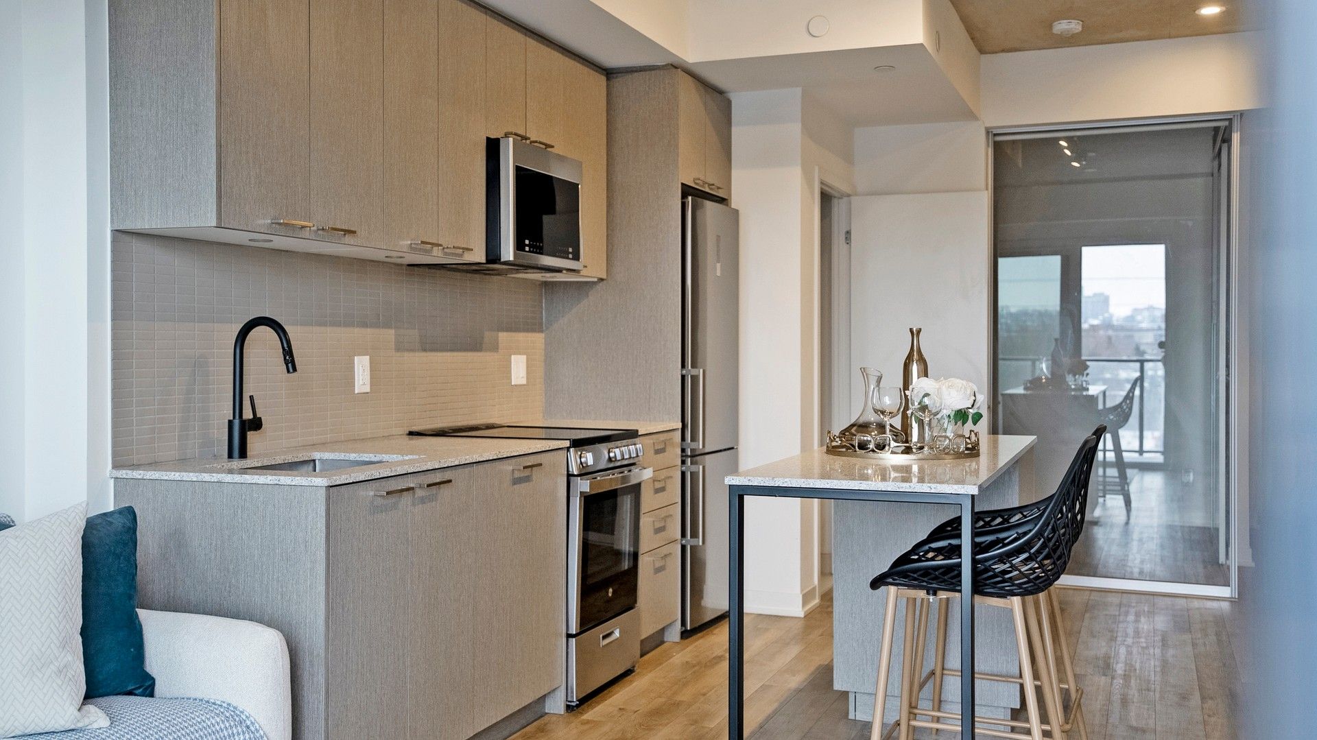 • Stylish kitchen with stainless steel appliances and large island.