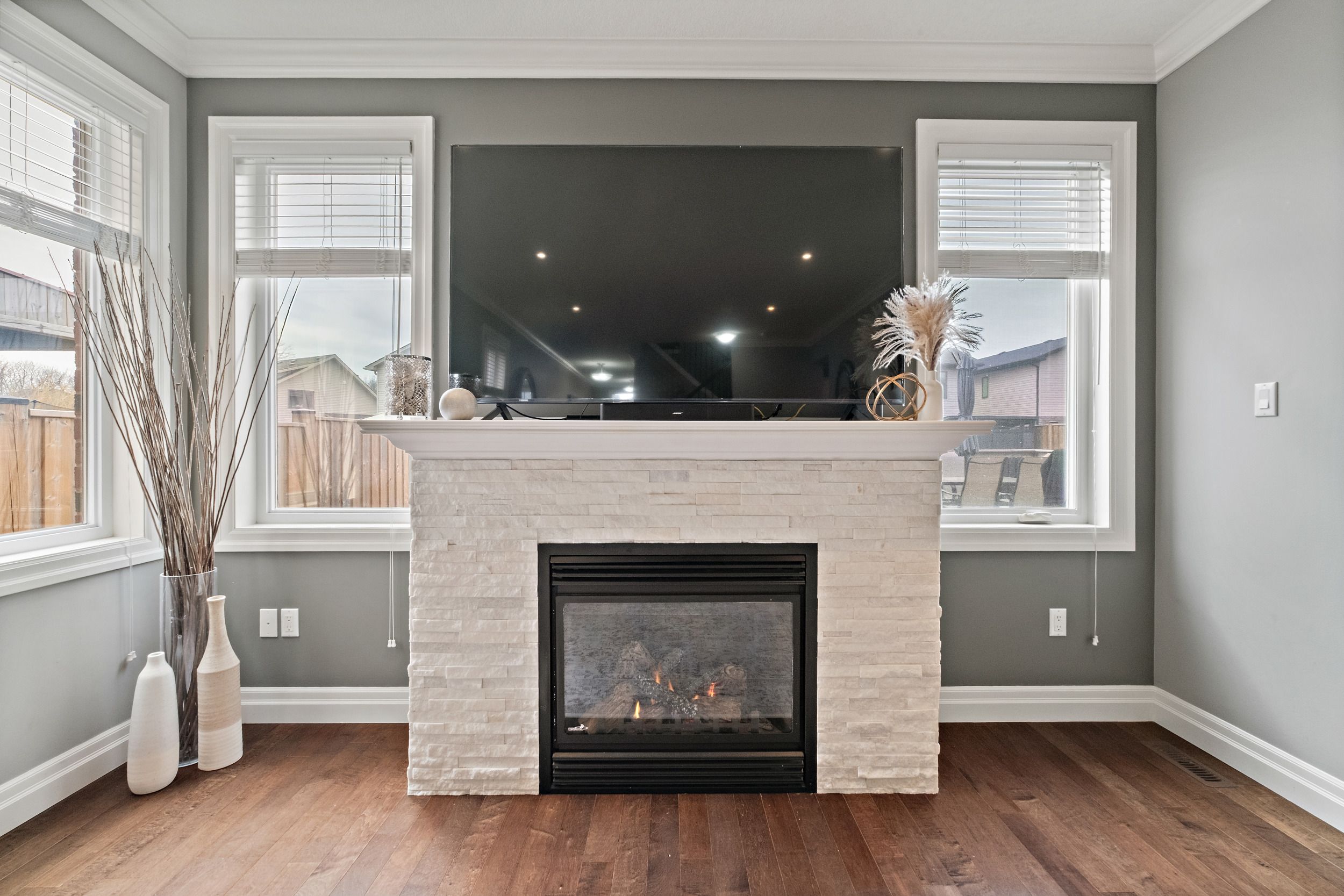 • Cozy living room features a gas fireplace and deck access.