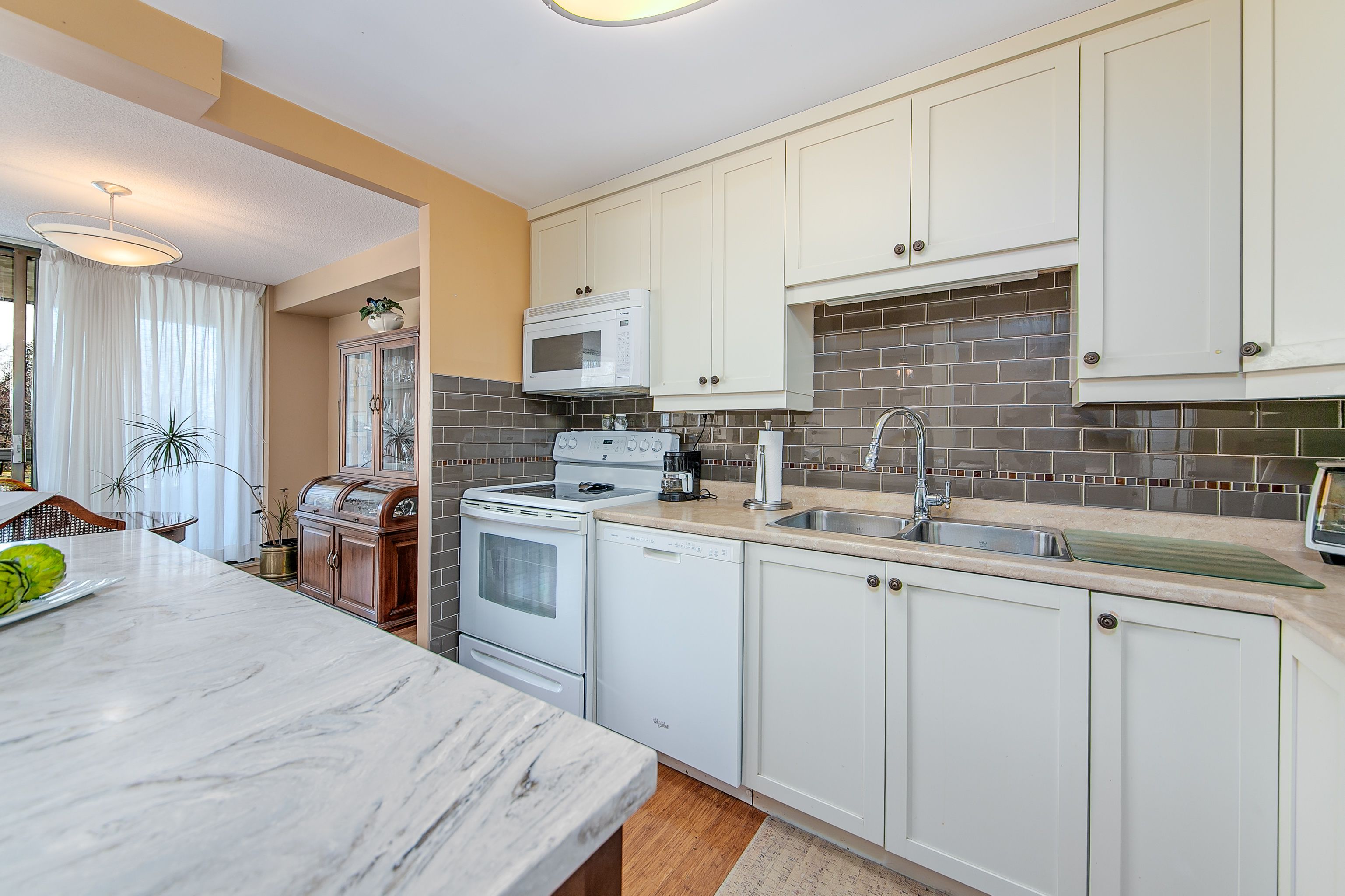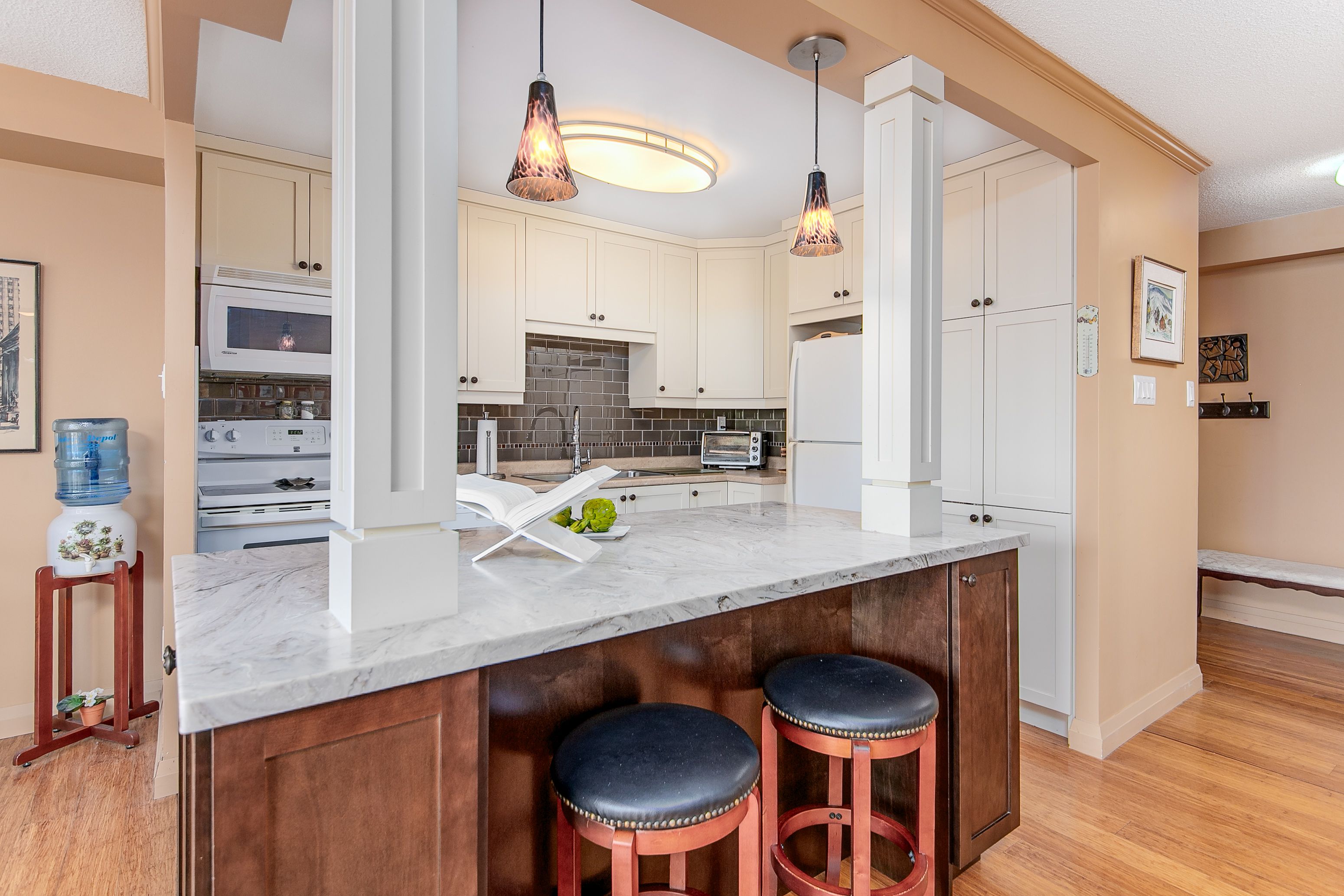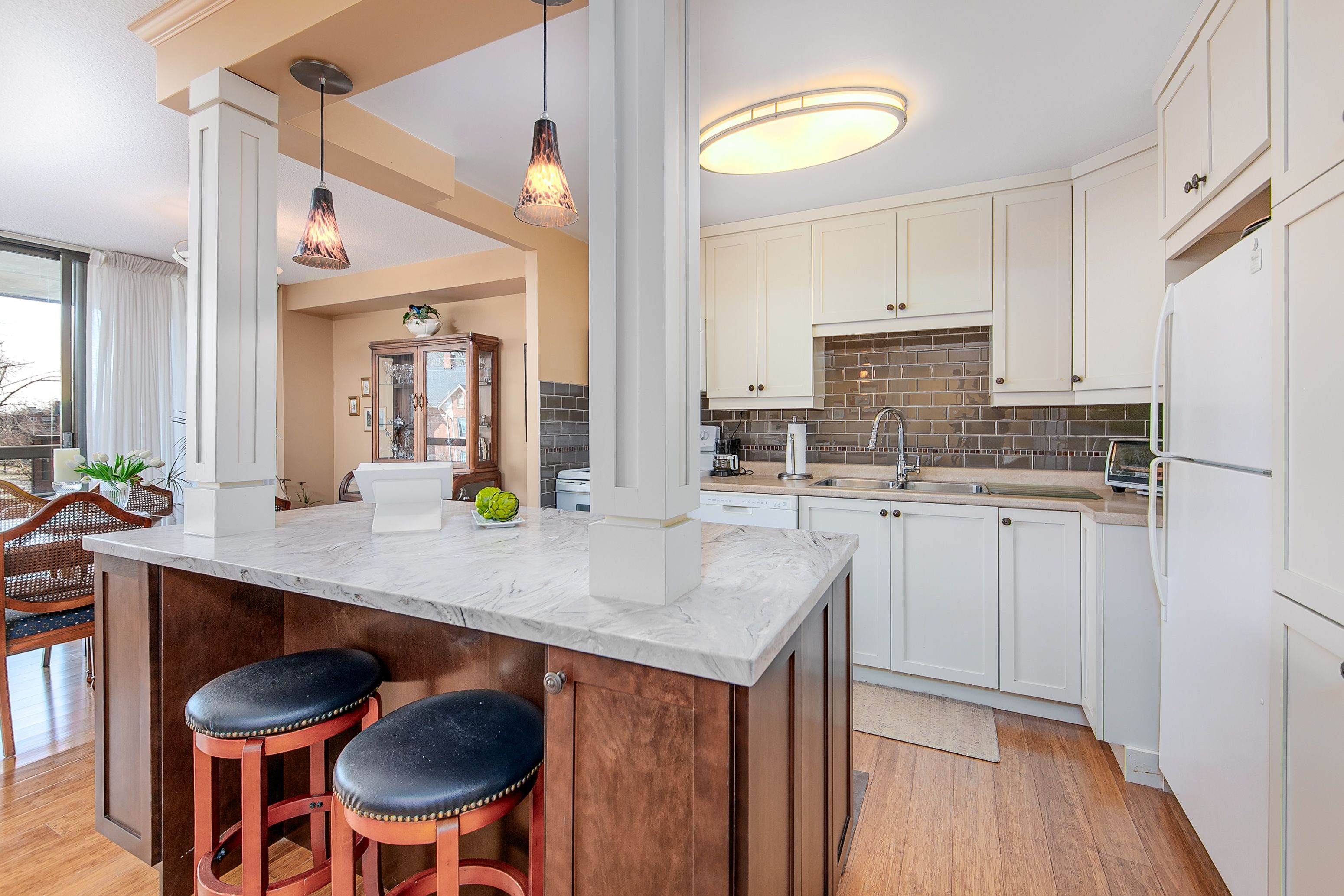 Welcome to an attractively priced opportunity at the bay club, known for its incredible amenities and location. This professionally updated home has an open concept layout with expansive windows. The eastern exposure provides morning sun and afternoon shade which makes the open air balcony pleasant all day. This bright and cheerful unit offers 1,324 square feet of living space. This 3 bedroom, 2 bath home is highlighted by bamboo floors and rich ceramics throughout resulting in a seamless flow from one room to the other. The updated kitchen will delight any chef; it has tons of cupboards and counter space and offers a huge island which works well as a breakfast bar or servery and is complimented by additional storage. The living room, dining room, kitchen and den are open concept making it a breeze to entertain. The bedrooms are generous size with large closets. One bedroom has been opened up and is a sitting room however, it could easily be reversed should the third bedroom be required. The two bathrooms are updated and lovely. There is ensuite laundry and a really handy utility room with shelves. This unit has 3 heat pumps which provides warmth in the winter and cooling in the summer. They are economical to run and keep the expenses down. To complete this package, there is an exclusive underground parking space and locker. The incredible facilities include an indoor pool, sauna, hot tub, fitness center, party room, billiards room, tennis/pickleball court, squash/ping pong room, woodworking shop, potting room where you can leave your plants when you are away, puzzle room, library, and to top it off, a wonderful guest suite with kitchenette. The club is located just outside the downtown core; it is a short walk to restaurants, groceries, art gallery, churches, shops, public transportation and the waterfront walking trails. Condo fees covers hot and cold water, parking, cable, internet, common elements, and management fees. Hydro costs are approximately $74 per month