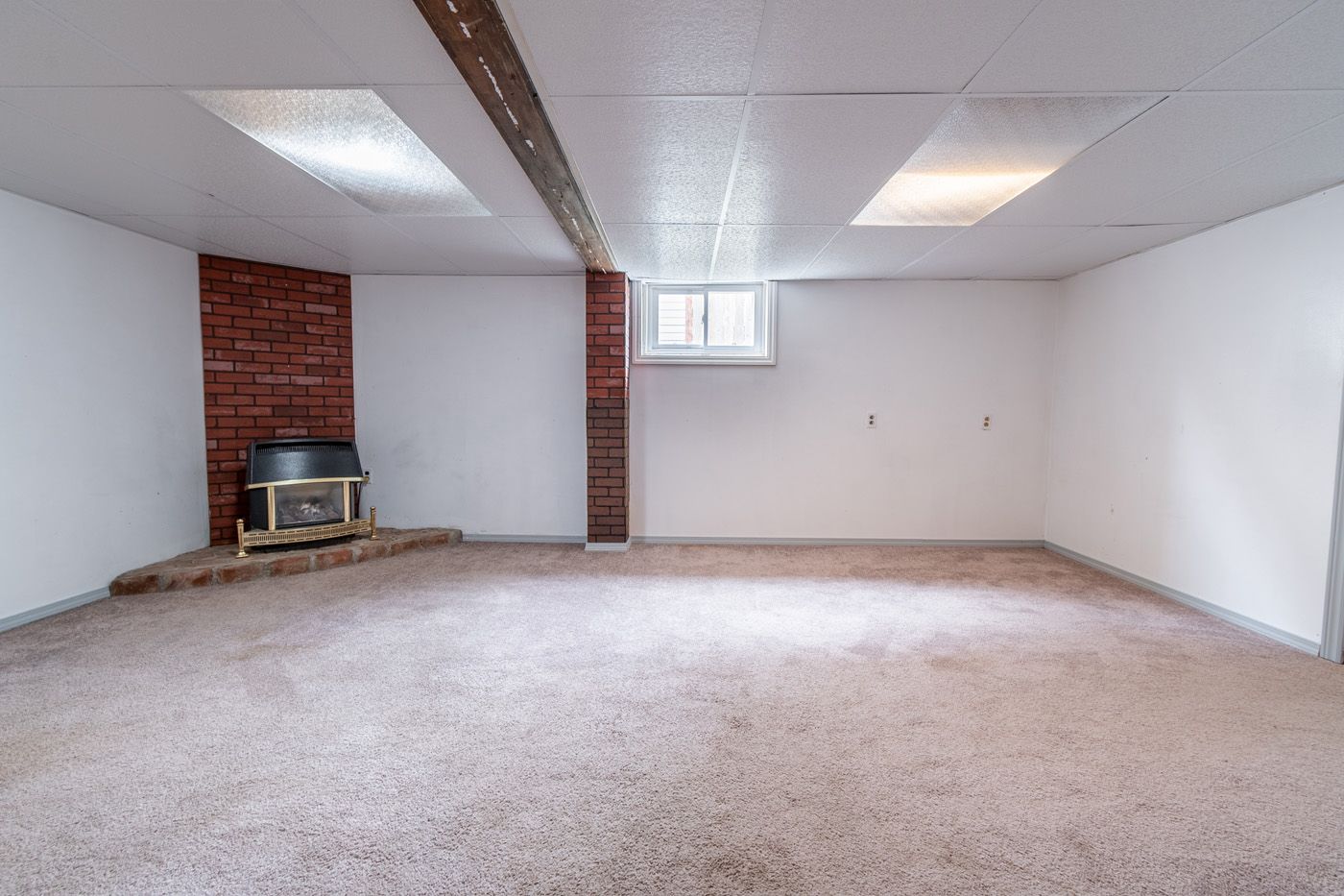 • Cozy in-law suite features a gas fireplace and exposed brick wall.