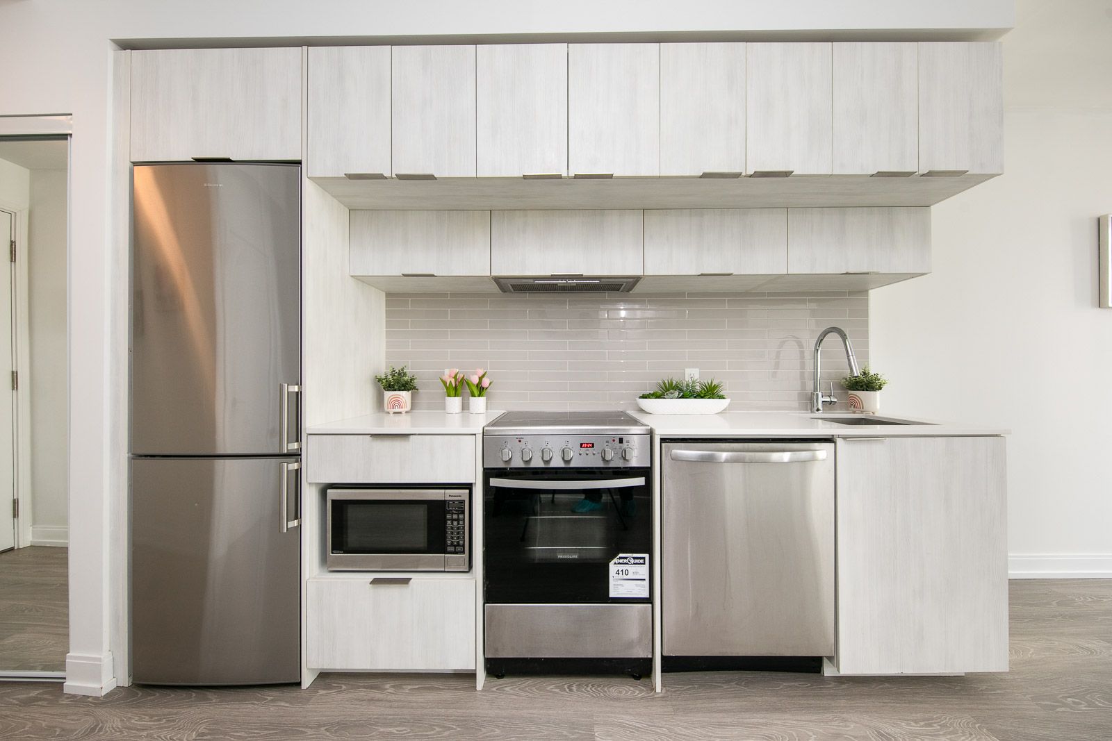 • Modern kitchen featuring stainless appliances and quartz countertops.