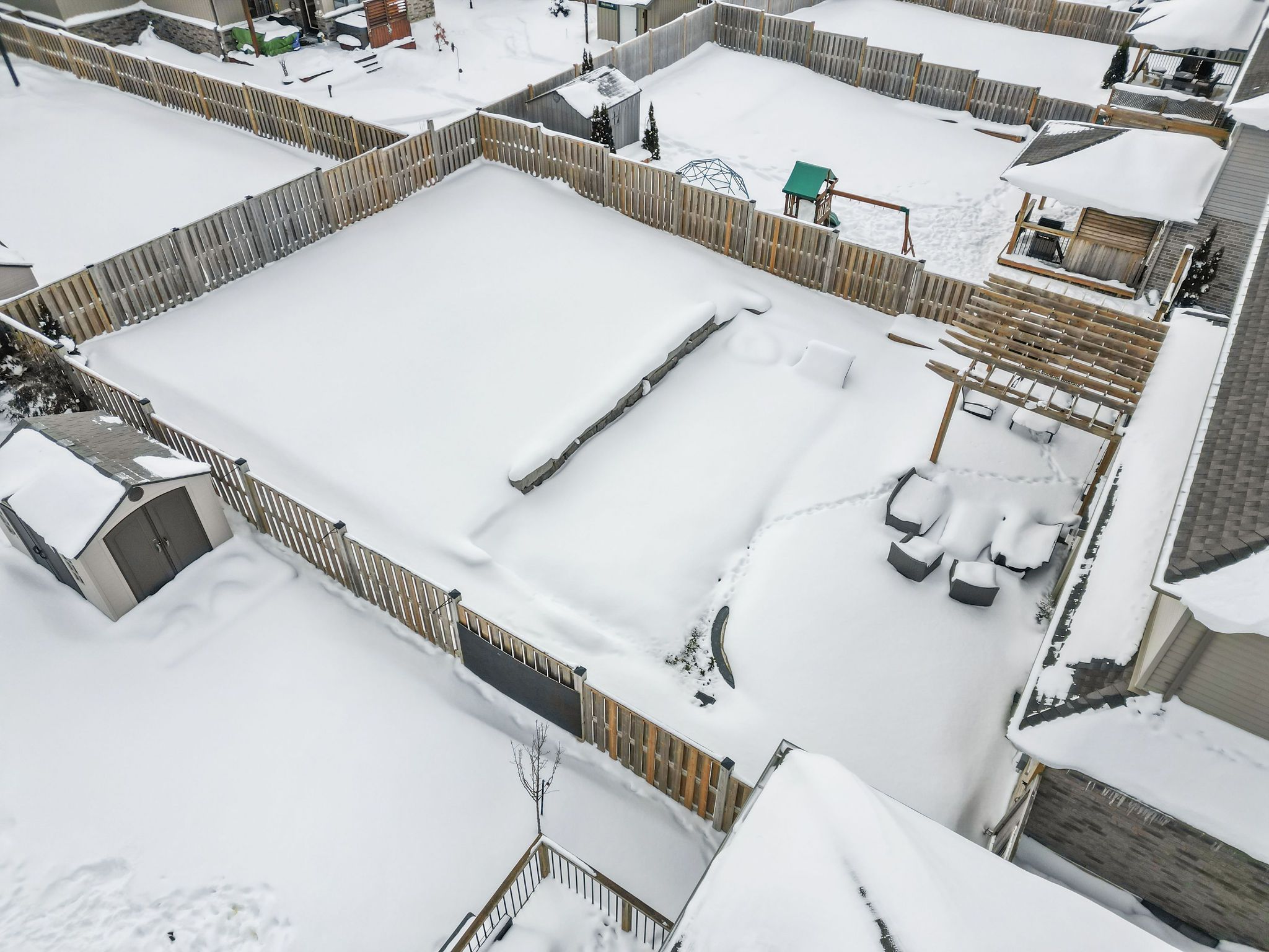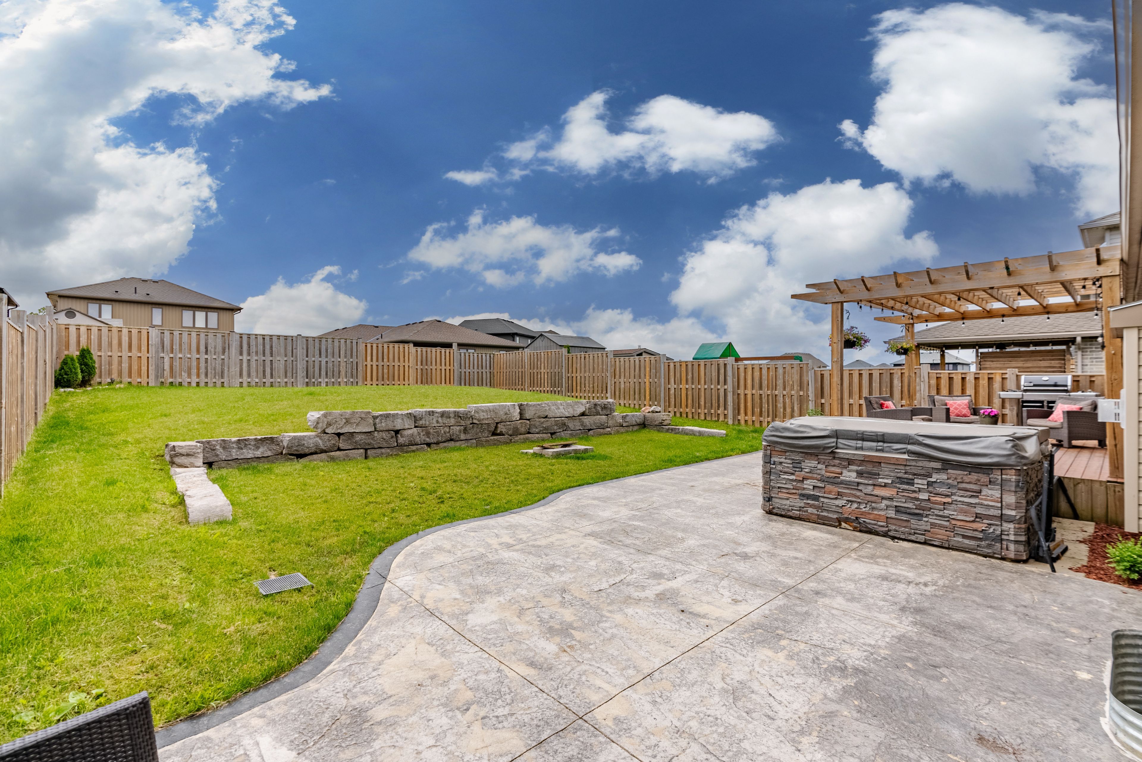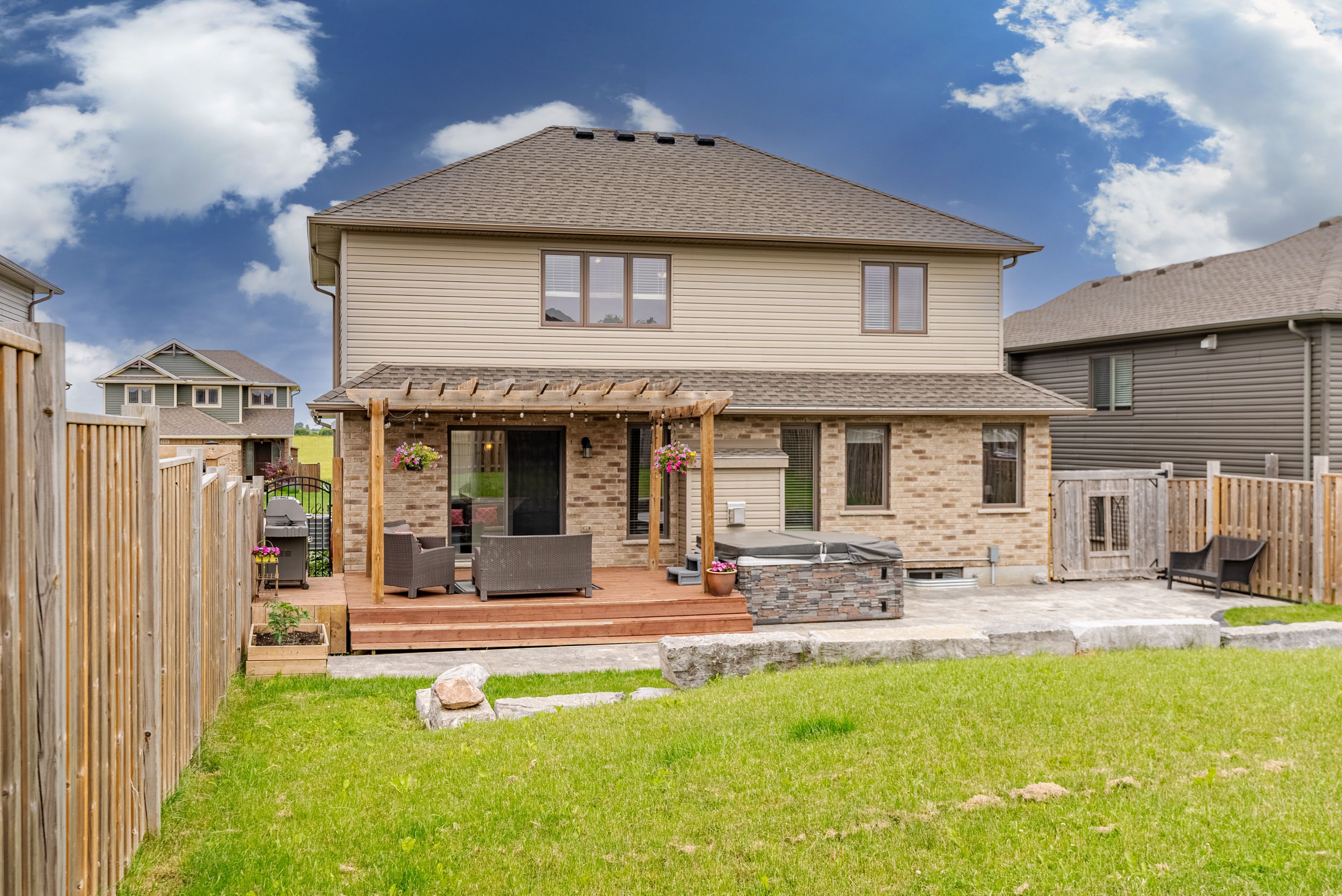• Fully fenced backyard with a deck and landscaped features.