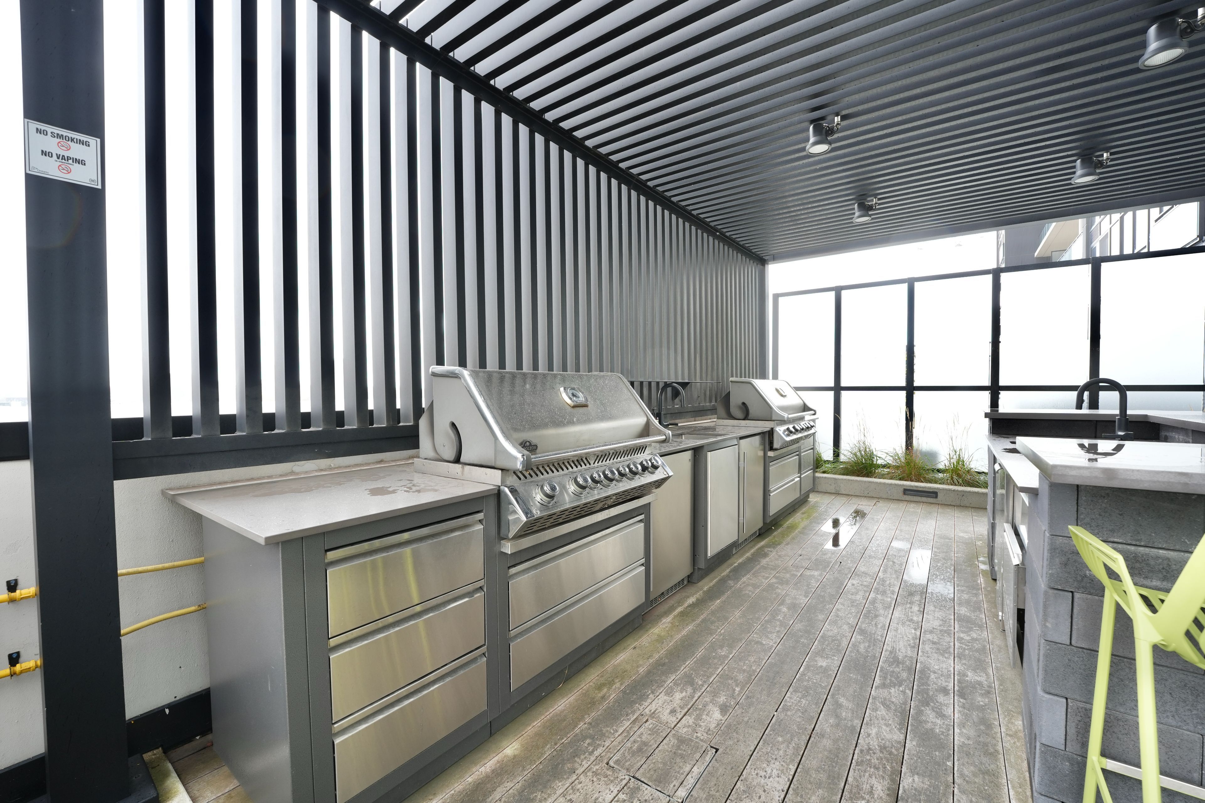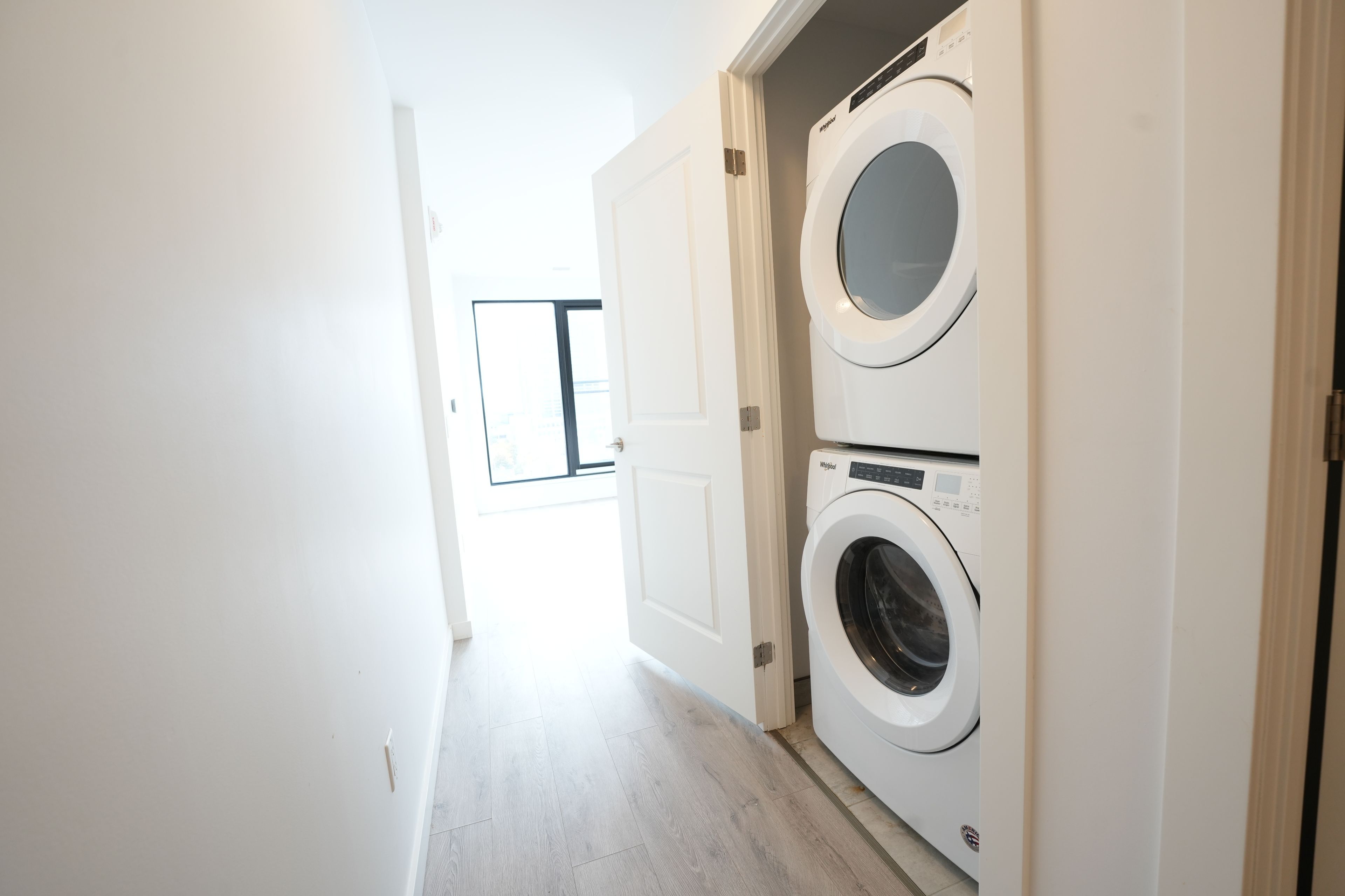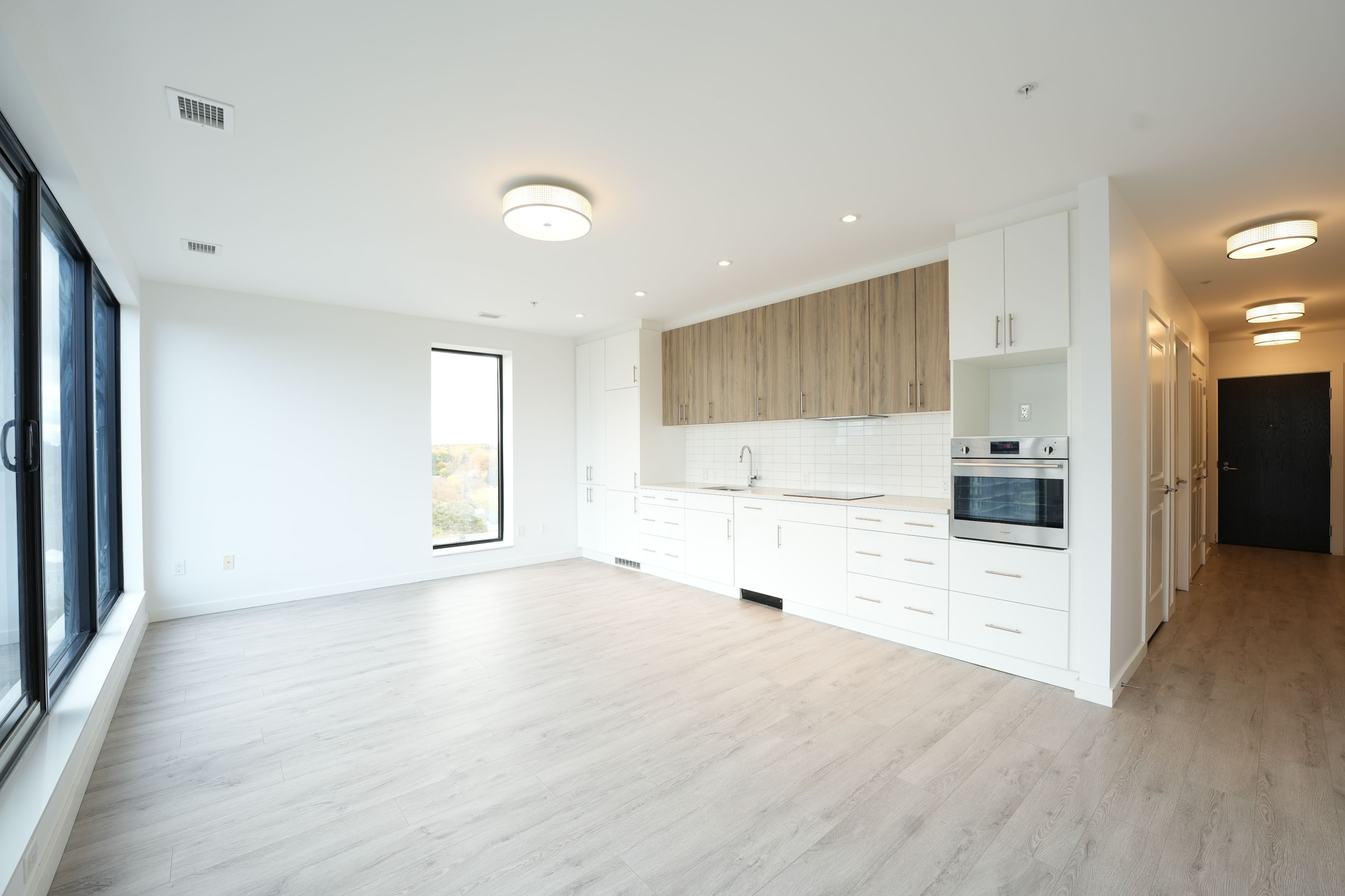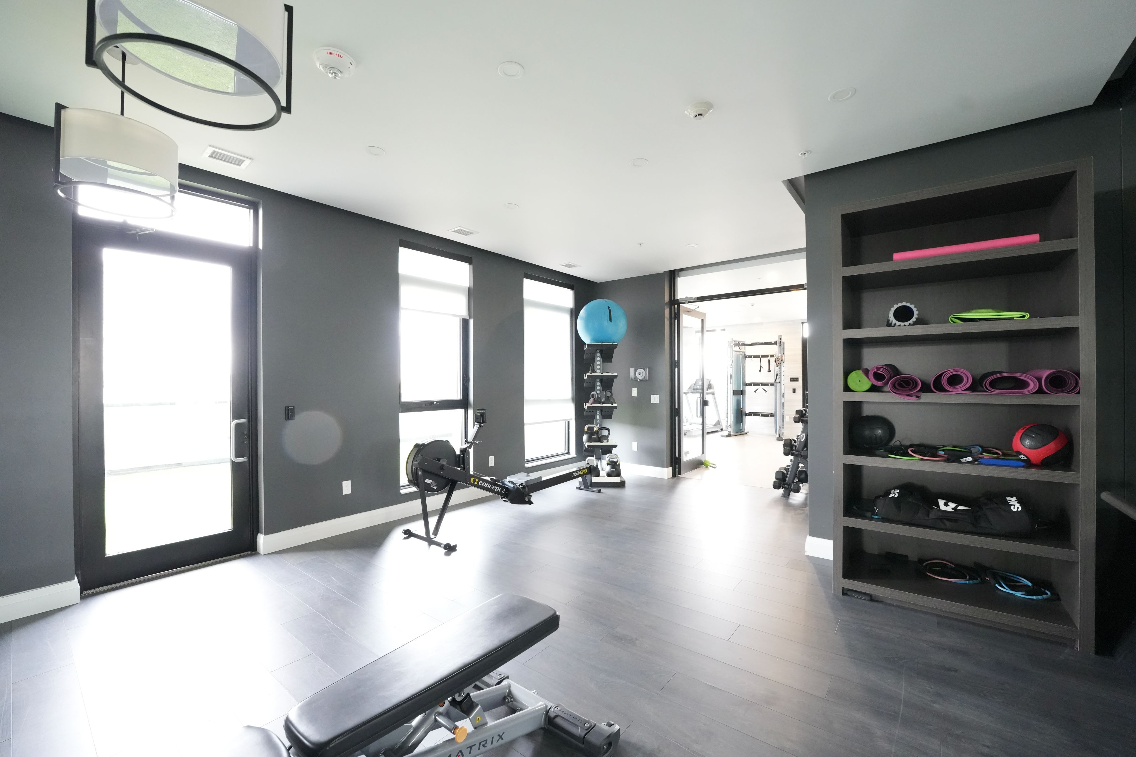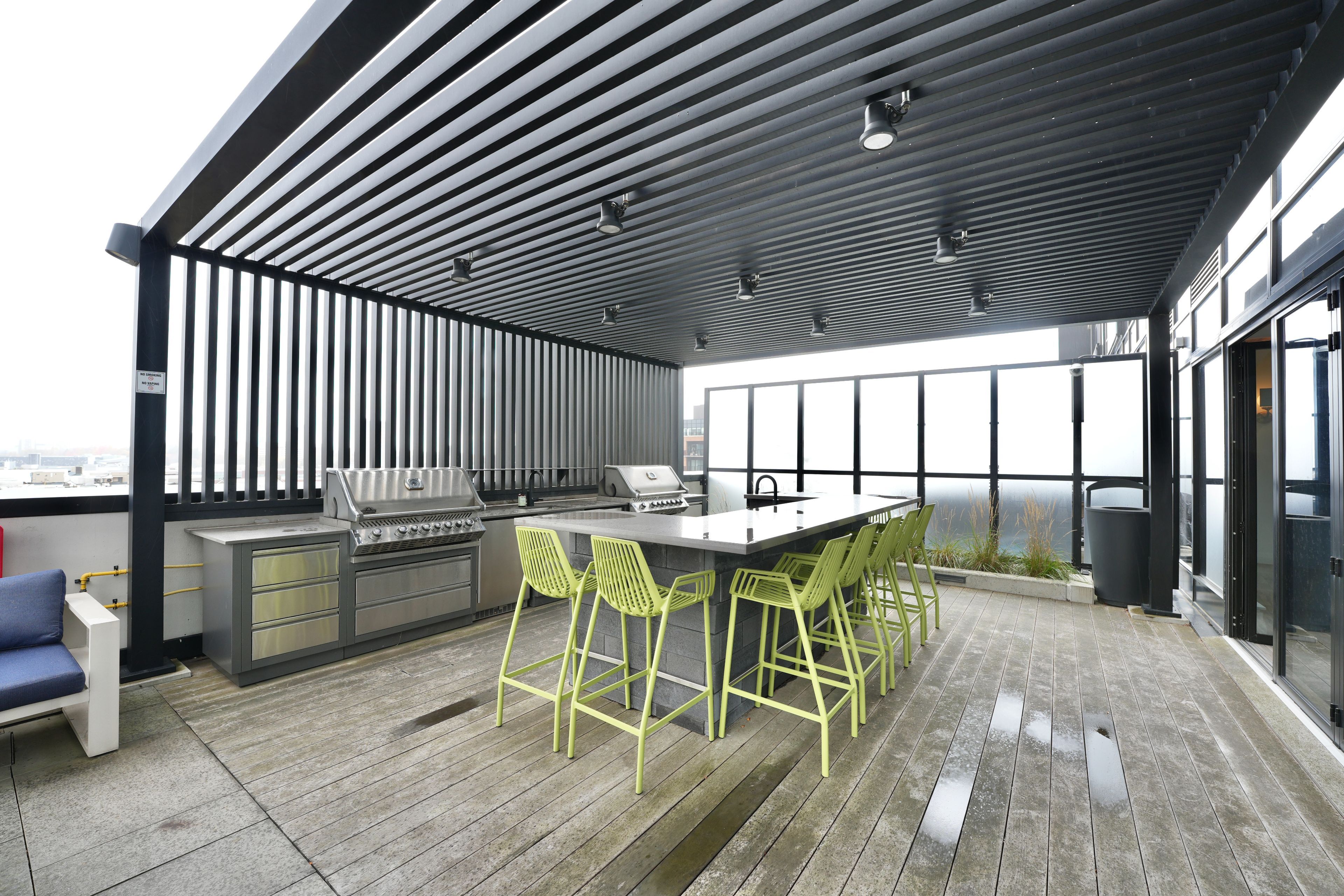 • Rooftop saltwater pool, fitness center, and co-working lounges for residents.