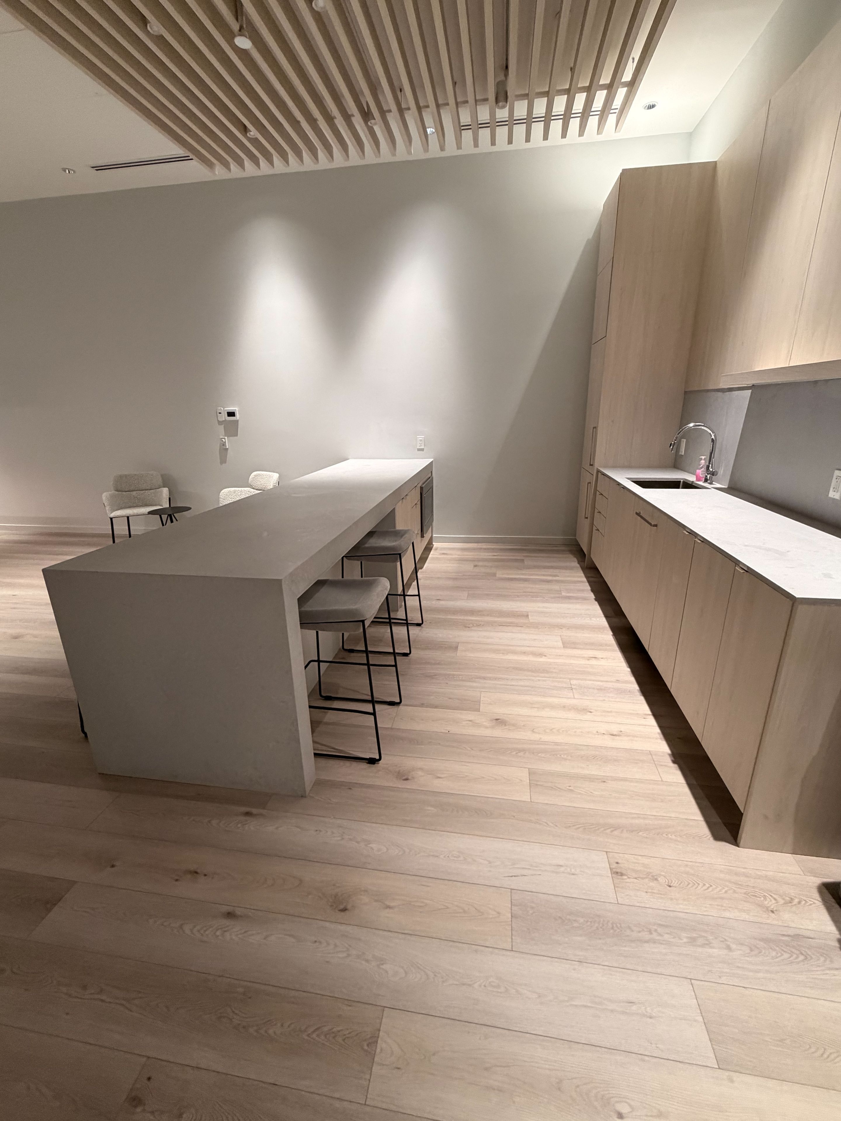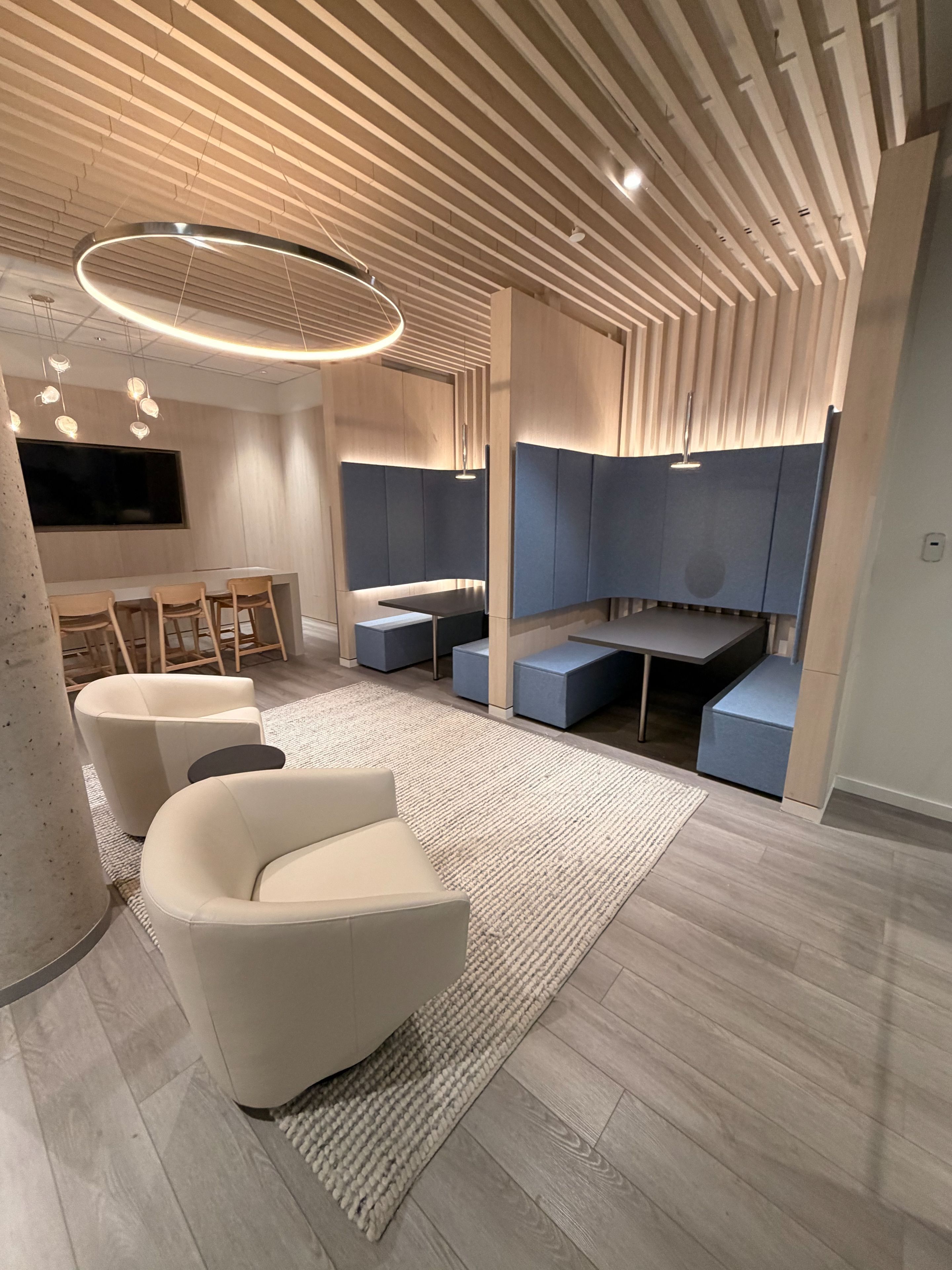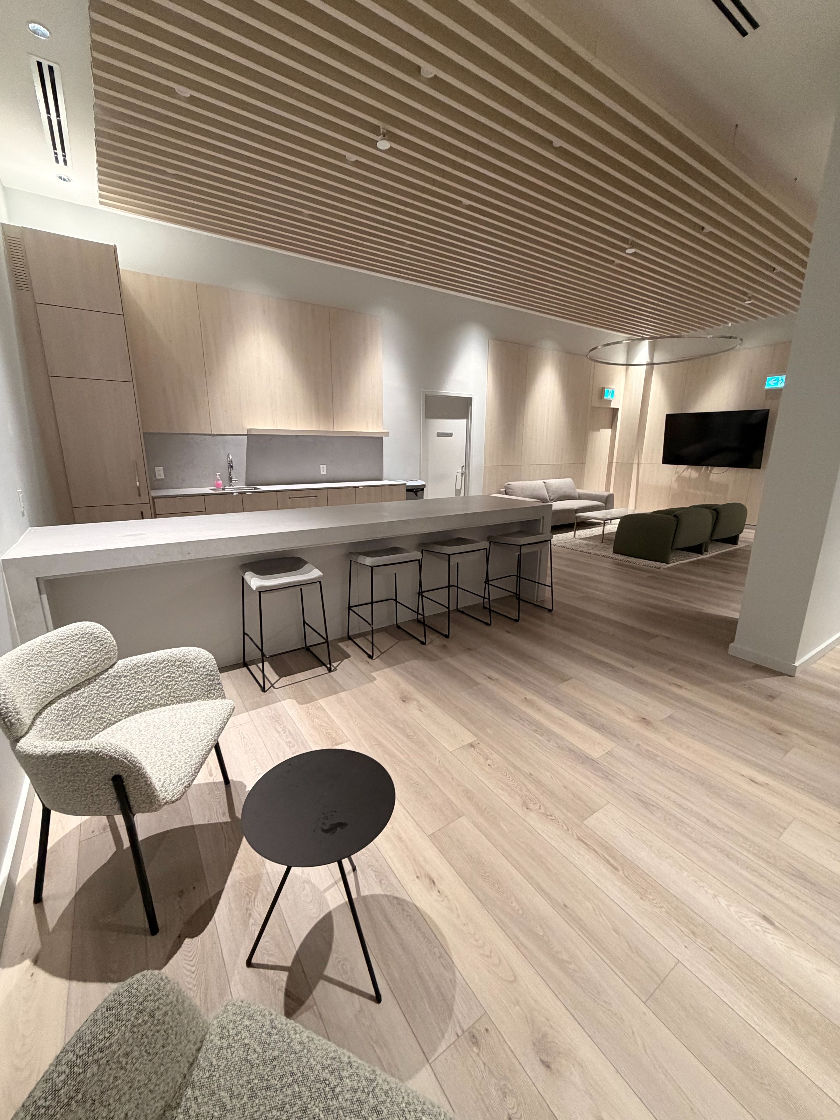 • Amenities feature a library, fitness studio, and entertainment lounge.