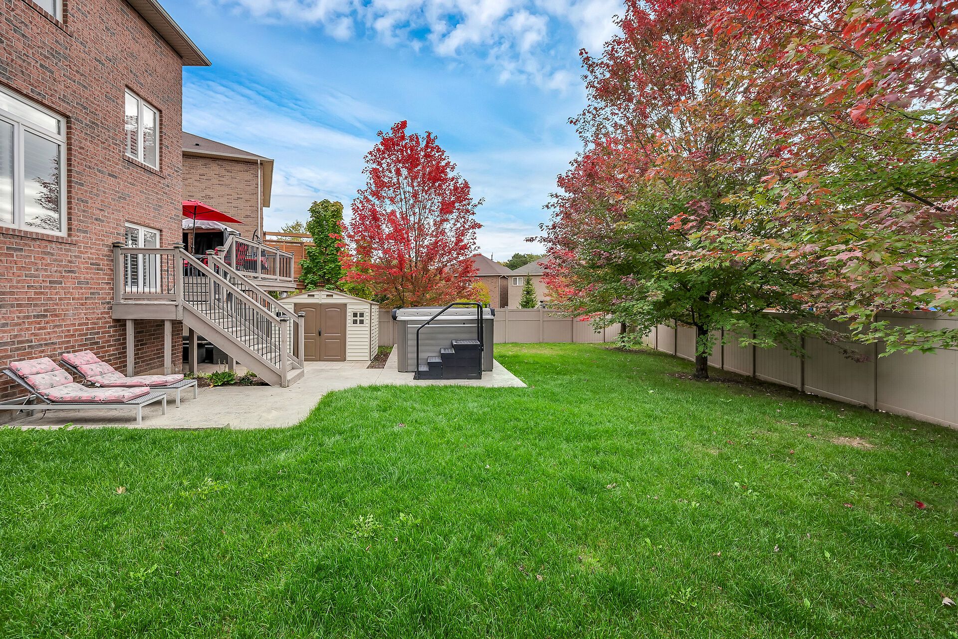 • Private outdoor retreat with a stamped concrete patio and elevated deck.