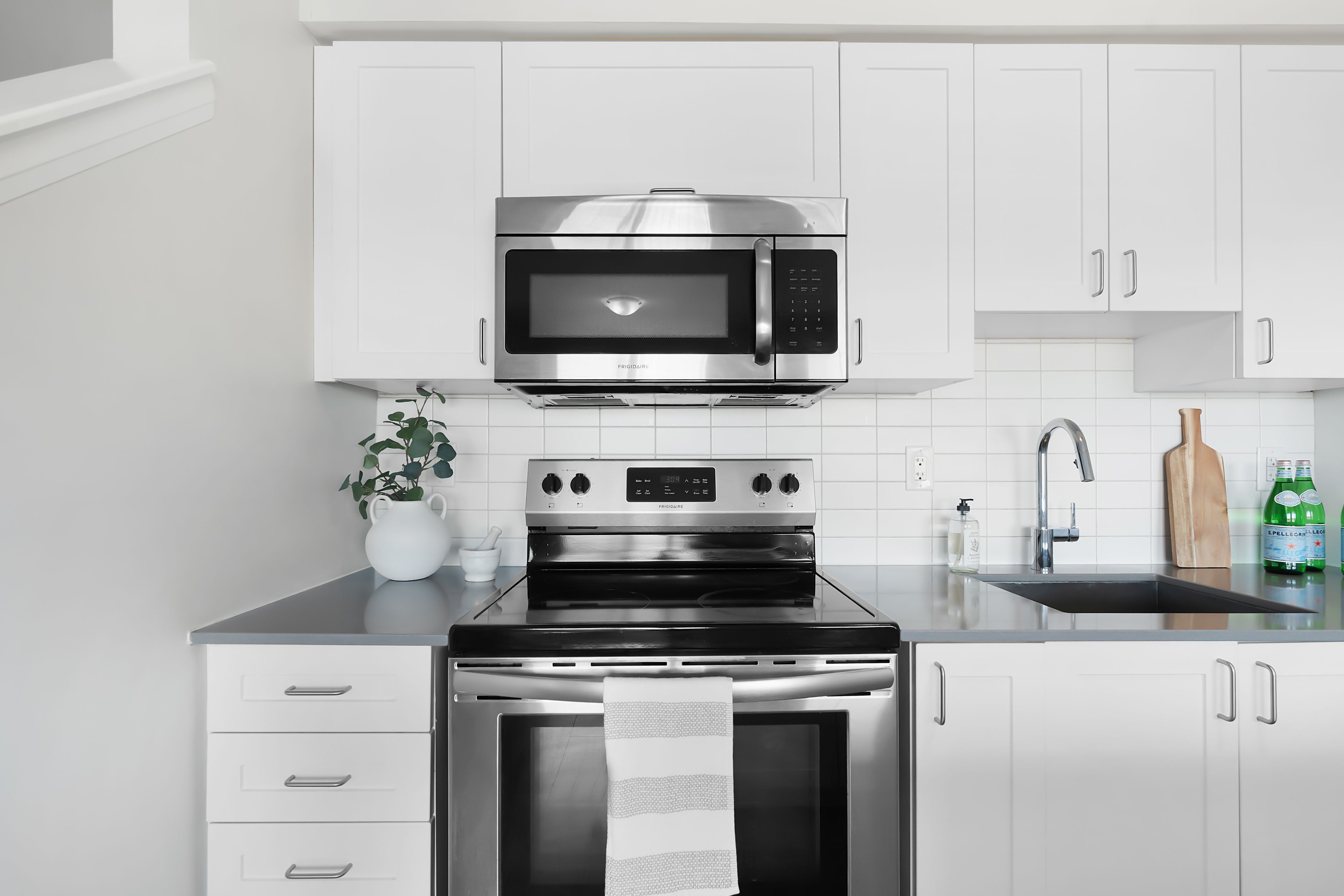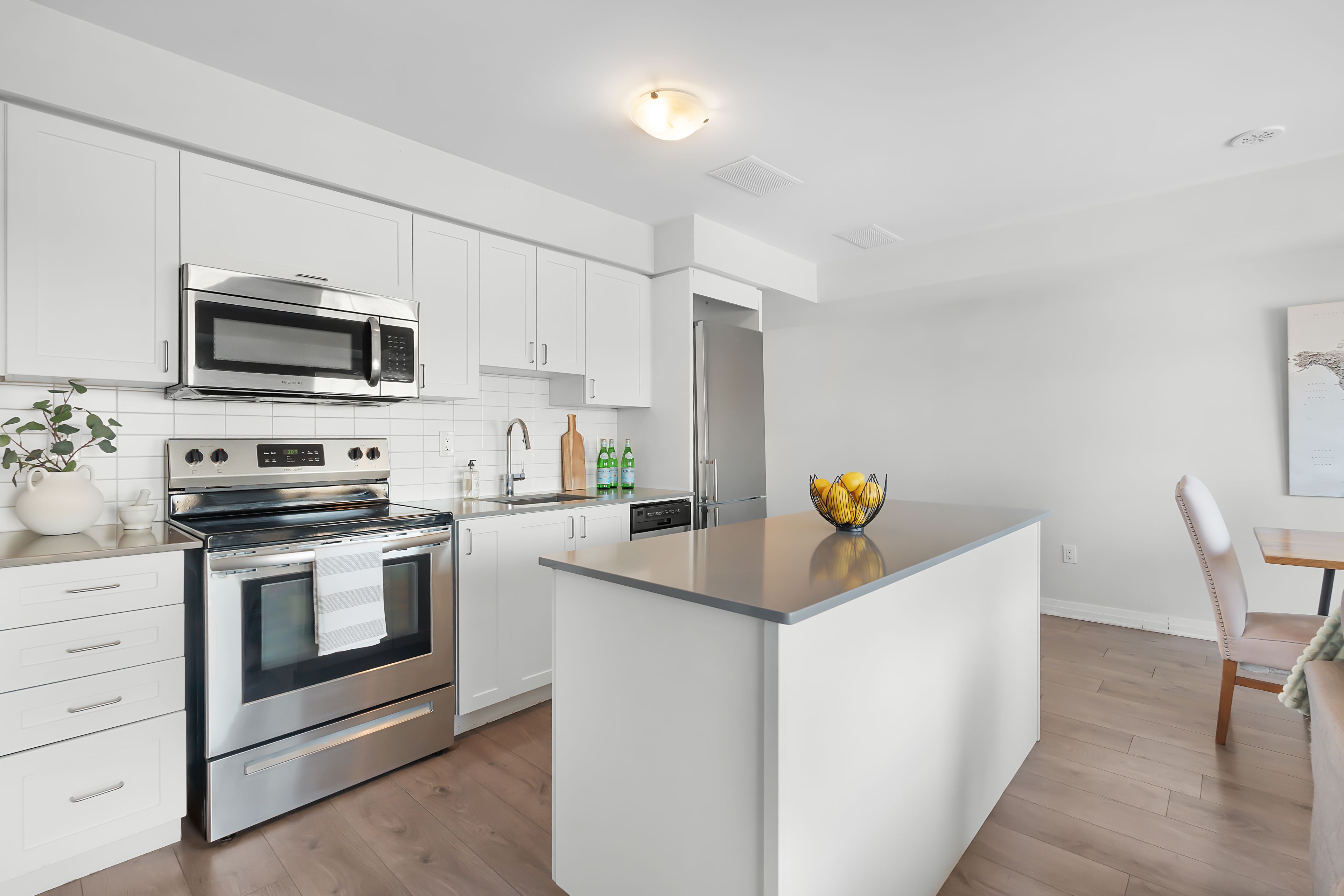 • Modern kitchen featuring quartz counters and stainless steel appliances.
