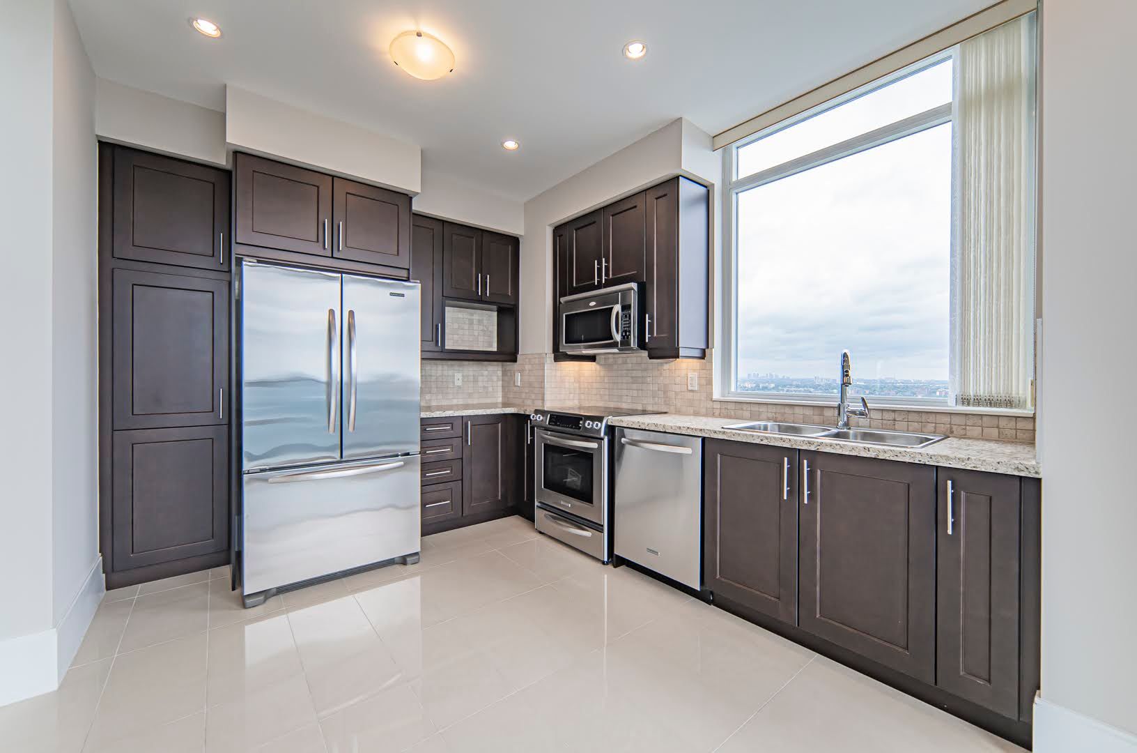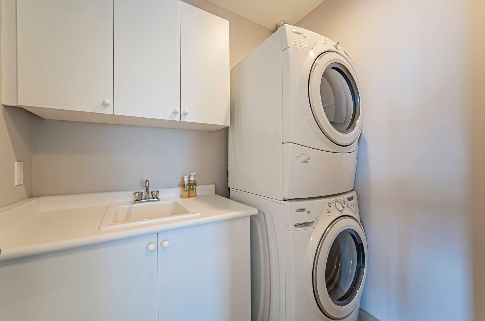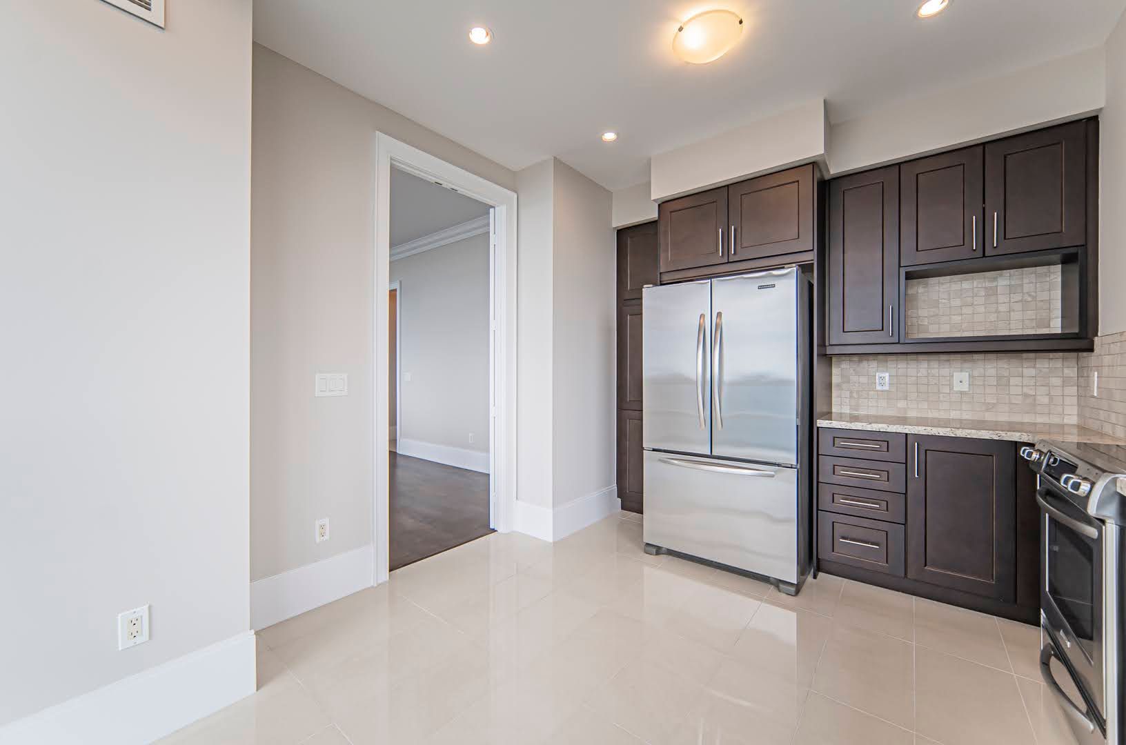 • Modern kitchen equipped with full-size appliances and granite countertops.