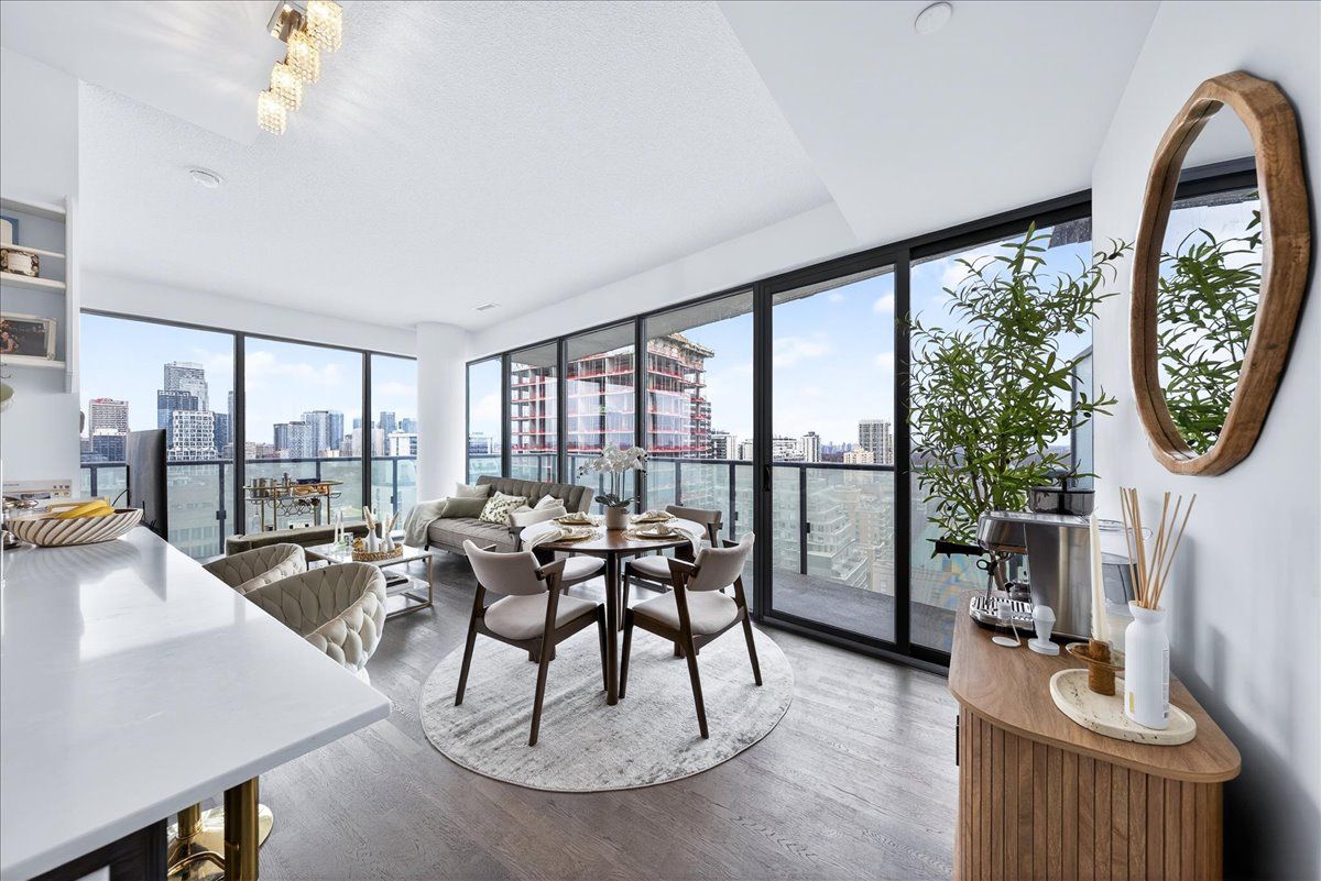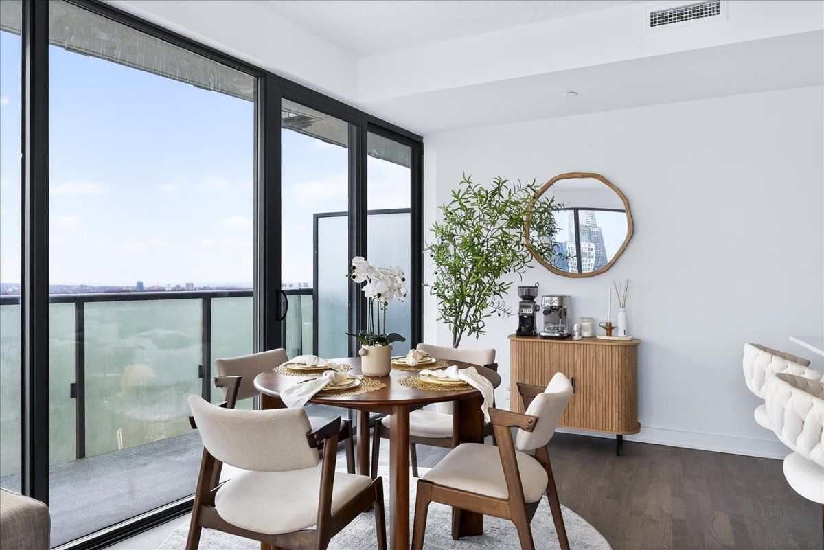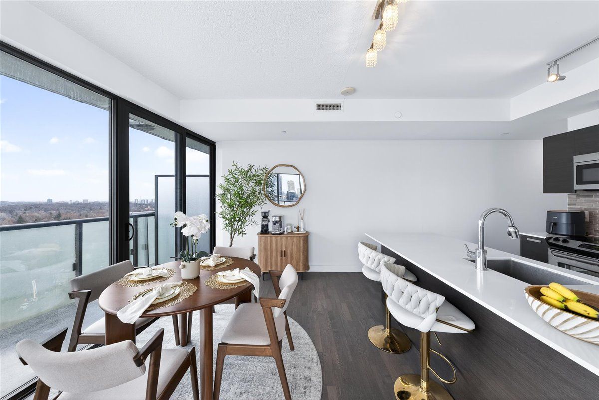 Rarely offered 1+den suite at the prestigious myc condos, ideally located in the heart of midtown toronto at yonge & merton. This beautifully designed 767 sq. Ft. Residence features a highly functional open-concept layout with soaring high ceilings and floor-to-ceiling windows, filling the space with natural light and showcasing breathtaking 280-degree panoramic city views. The modern kitchen is finished with sleek cabinetry, quartz countertops, and stainless steel appliances, seamlessly flowing into spacious living and dining areas-perfect for both everyday living and entertaining. Step out onto your expansive 260 sq. Ft. Wrap-around balcony with two walk-outs-an exceptional outdoor space to enjoy both sunrise and sunset, host guests, or unwind above the city. The spacious den, complete with a sliding door, offers true versatility and can easily function as a second bedroom, private office, or guest space. Unbeatable location just steps to davisville station, the kay gardner beltline trail, and an array of boutique shops, cafes, and restaurants along yonge street. Residents enjoy premium amenities including concierge, fitness centre, media room, party/meeting room, rooftop terrace, and visitor parking. A rare opportunity to own in one of midtown's most sought-after residences, offering the perfect blend of lifestyle, location, and elevated urban living.
