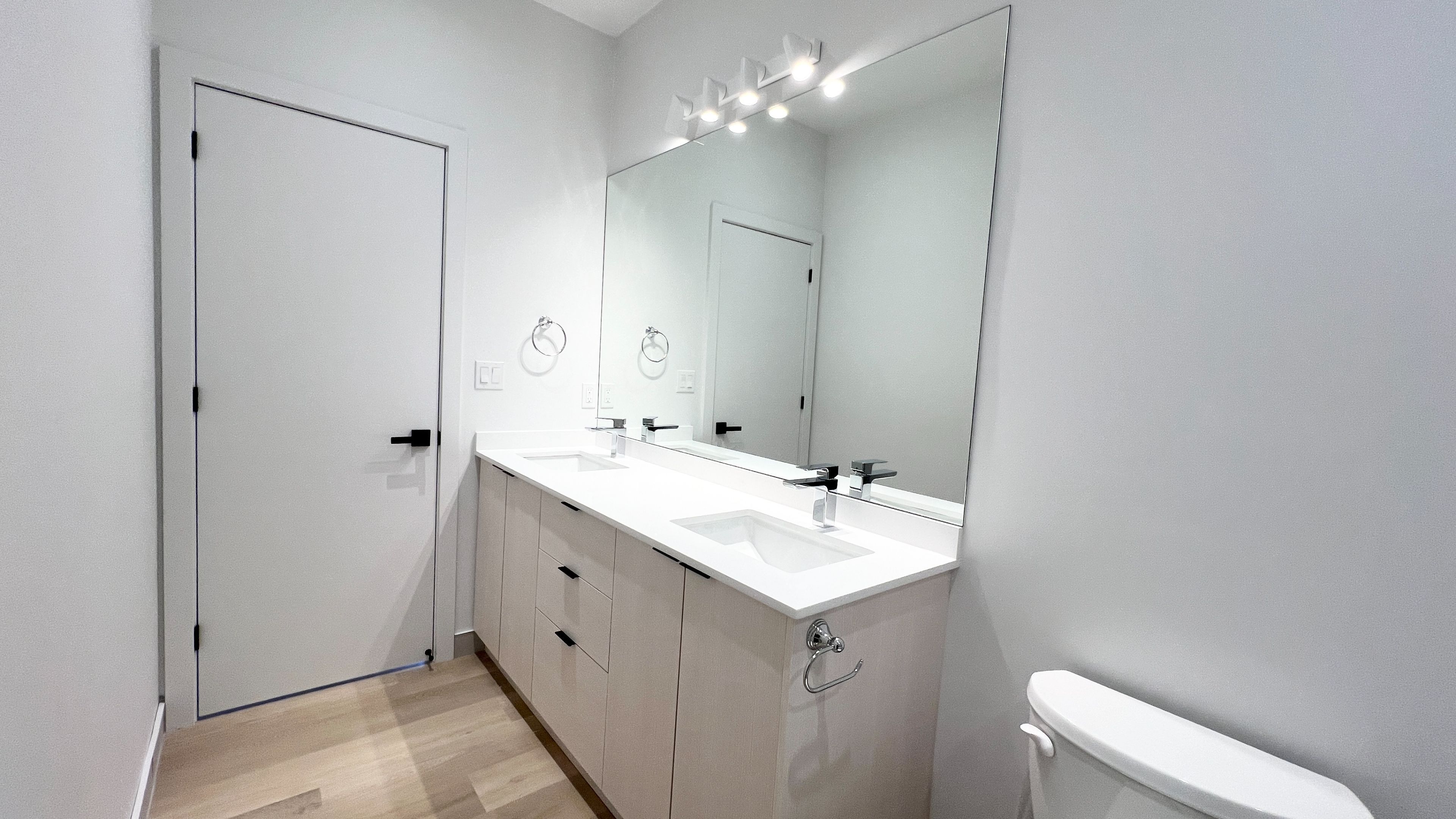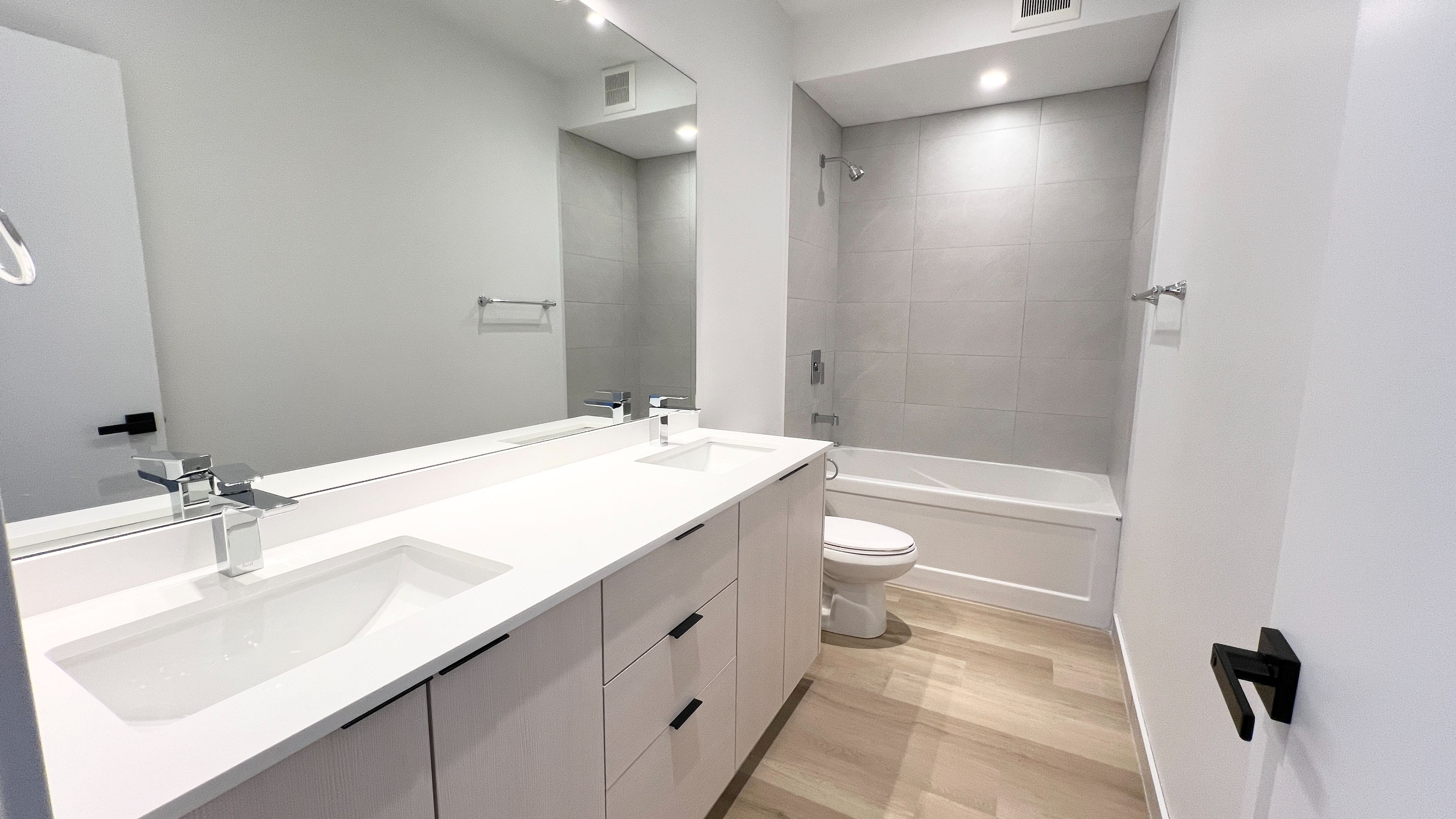 • Modern bathroom with a double vanity and quartz counters.