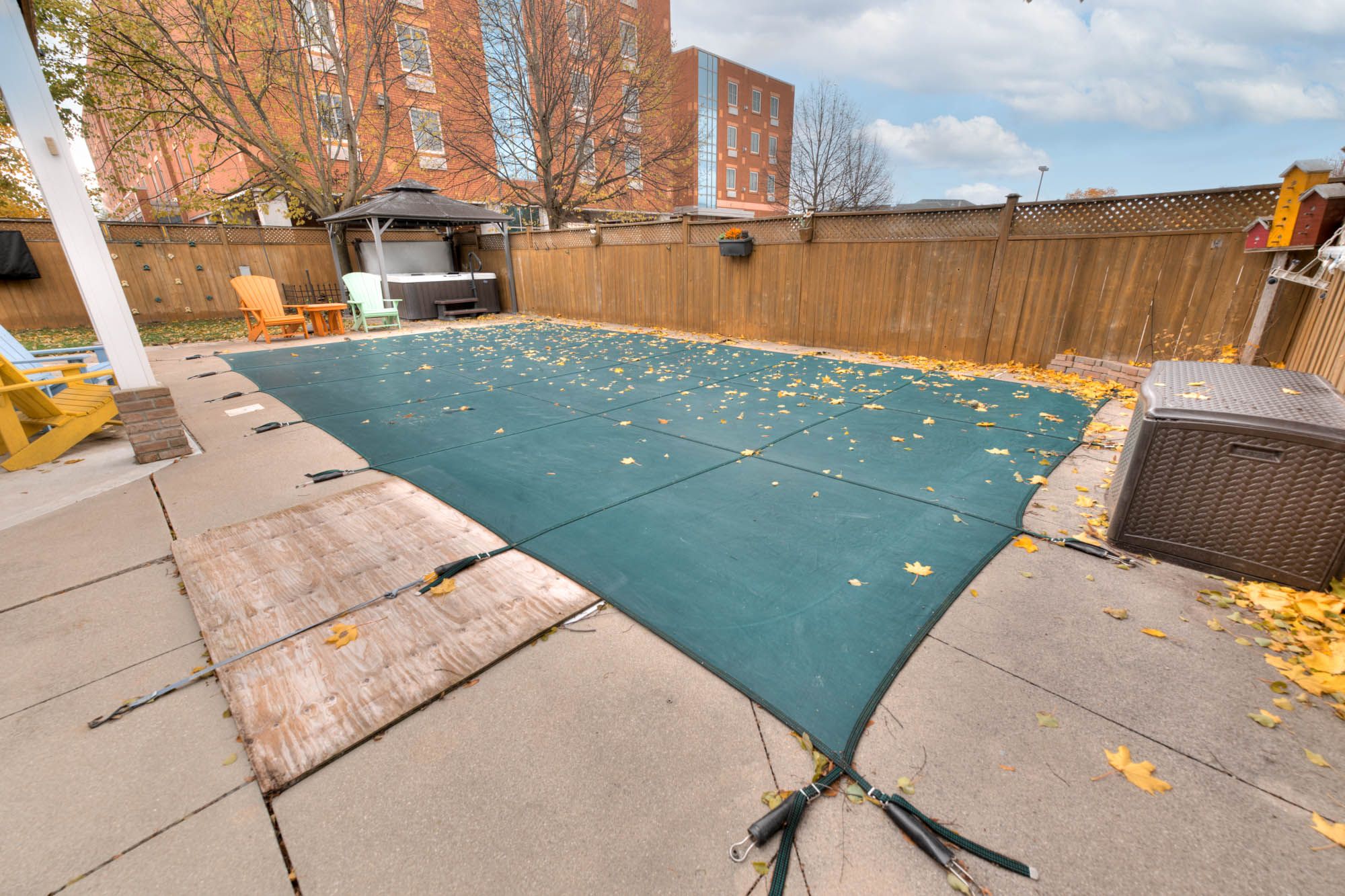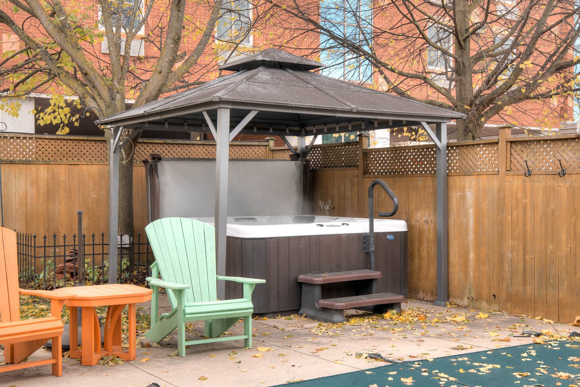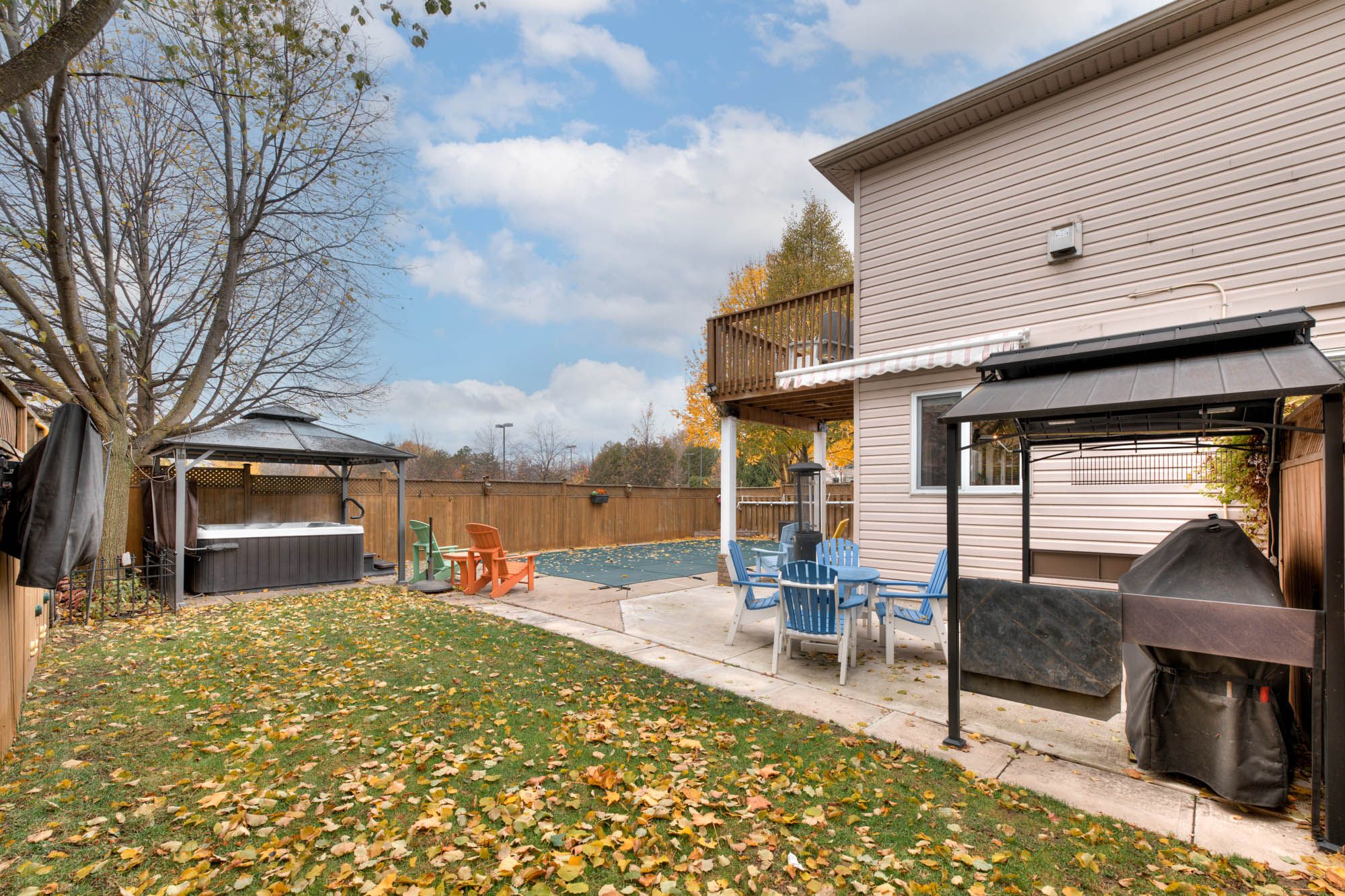 • Private backyard oasis with a heated inground pool and hot tub.