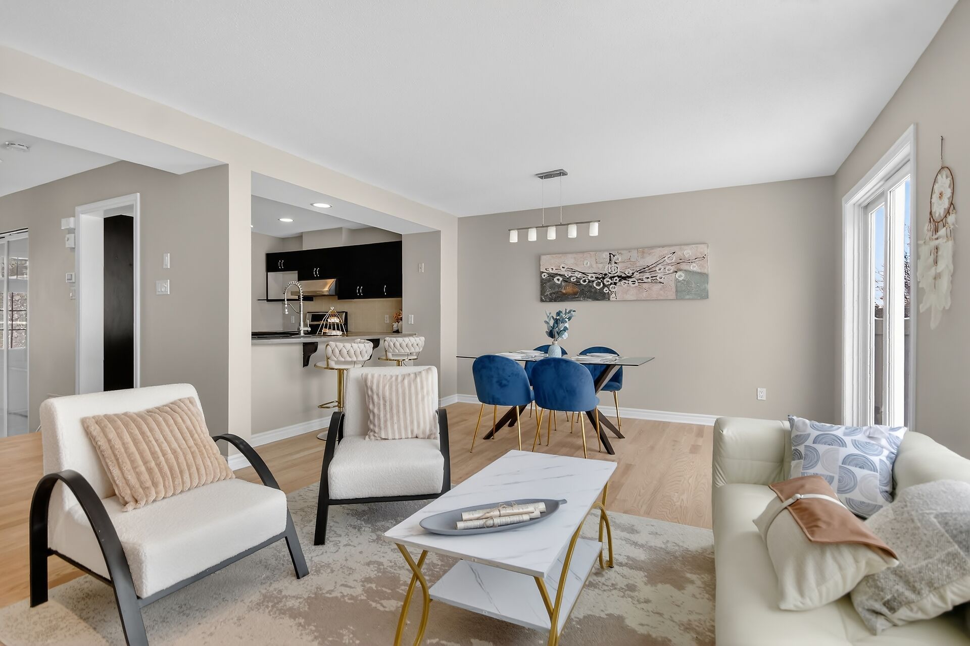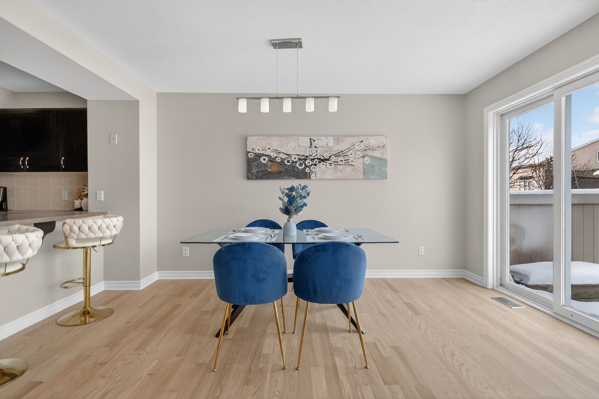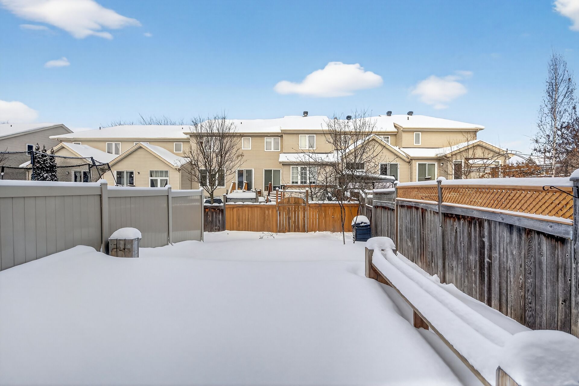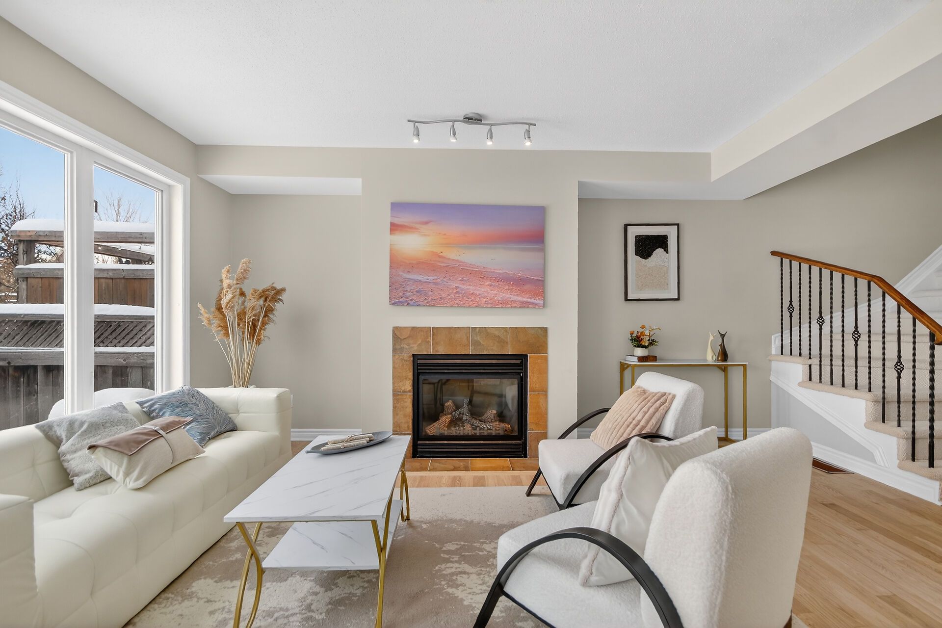 Welcome to 182 saddlesmith drive, a beautifully updated and well-maintained townhome offering a bright, functional layout and inviting living spaces. The main level features gleaming refinished hardwood floors and large, bright windows that fill the home with natural light. An open-concept design seamlessly connects the living room, dining area, and kitchen-ideal for both everyday living and entertaining. The living room is anchored by a cozy gas fireplace, creating a warm and welcoming focal point. Ceramic flooring enhances the foyer, kitchen, and all bathrooms, adding durability and style. The home has been freshly painted throughout in tasteful, neutral tones, making it truly move-in ready. The kitchen offers ample counter space with a convenient pantry and breakfast bar which overlooks the main living area, perfect for hosting family and friends. Refinished hardwood railings add a polished touch to the interior. Upstairs, newer berber carpeting leads to a spacious primary bedroom that serves as a private retreat, complete with a walk in closet and full ensuite featuring a separate shower and a relaxing soaker tub. Two additional well-sized bedrooms and a full main bathroom complete the upper level. The finished lower level provides versatile living space ideal for a family room, media area, or home gym, along with generous storage and rough in for future bath . Step outside to the fully fenced backyard and enjoy the wonderful deck-perfect for summer barbecues and outdoor relaxation. Additional updates include : garage fully finished and painted, insulated garage door, aluminum wrapping around the frame, updated weather stripping , freshly painted utility room floor, fixtures, gas hook up for bbq and dryer, much more ! Situated on a quiet street with convenient access to parks, top rated schools, shopping, and transit, this home offers comfort, quality upgrades, and an exceptional opportunity in a desirable kanata neighbourhood.