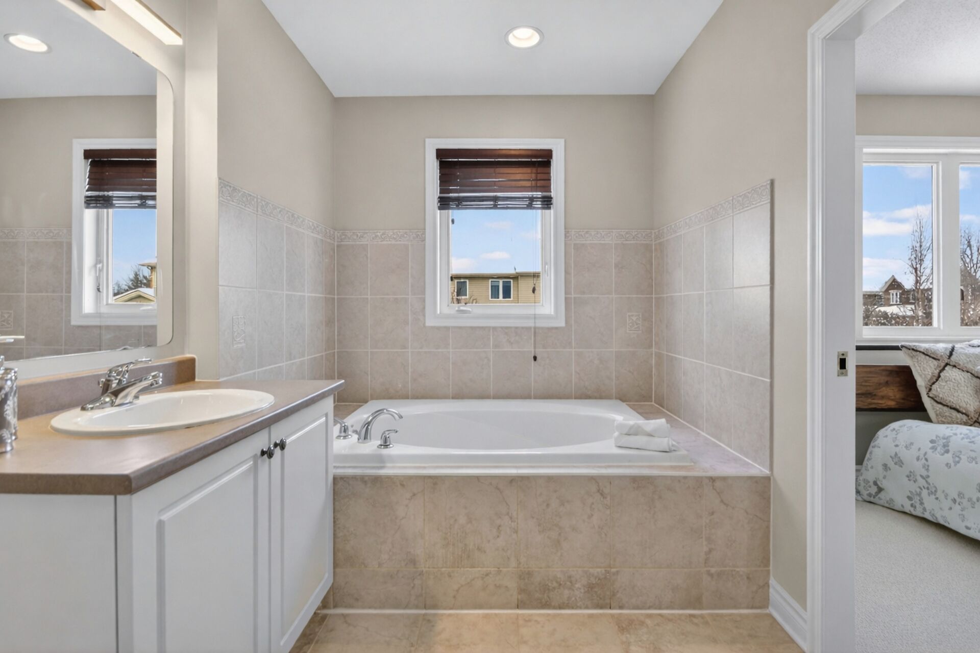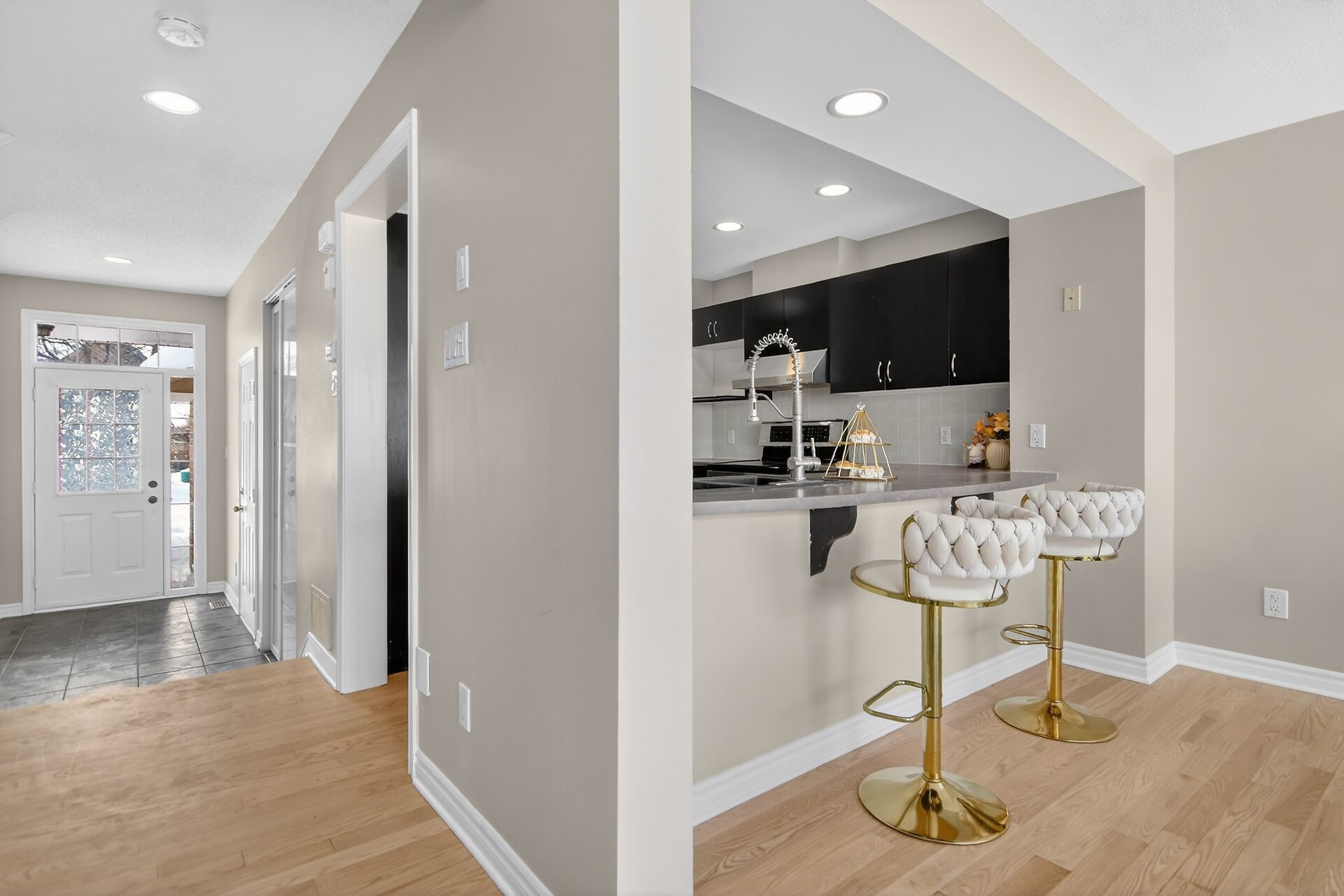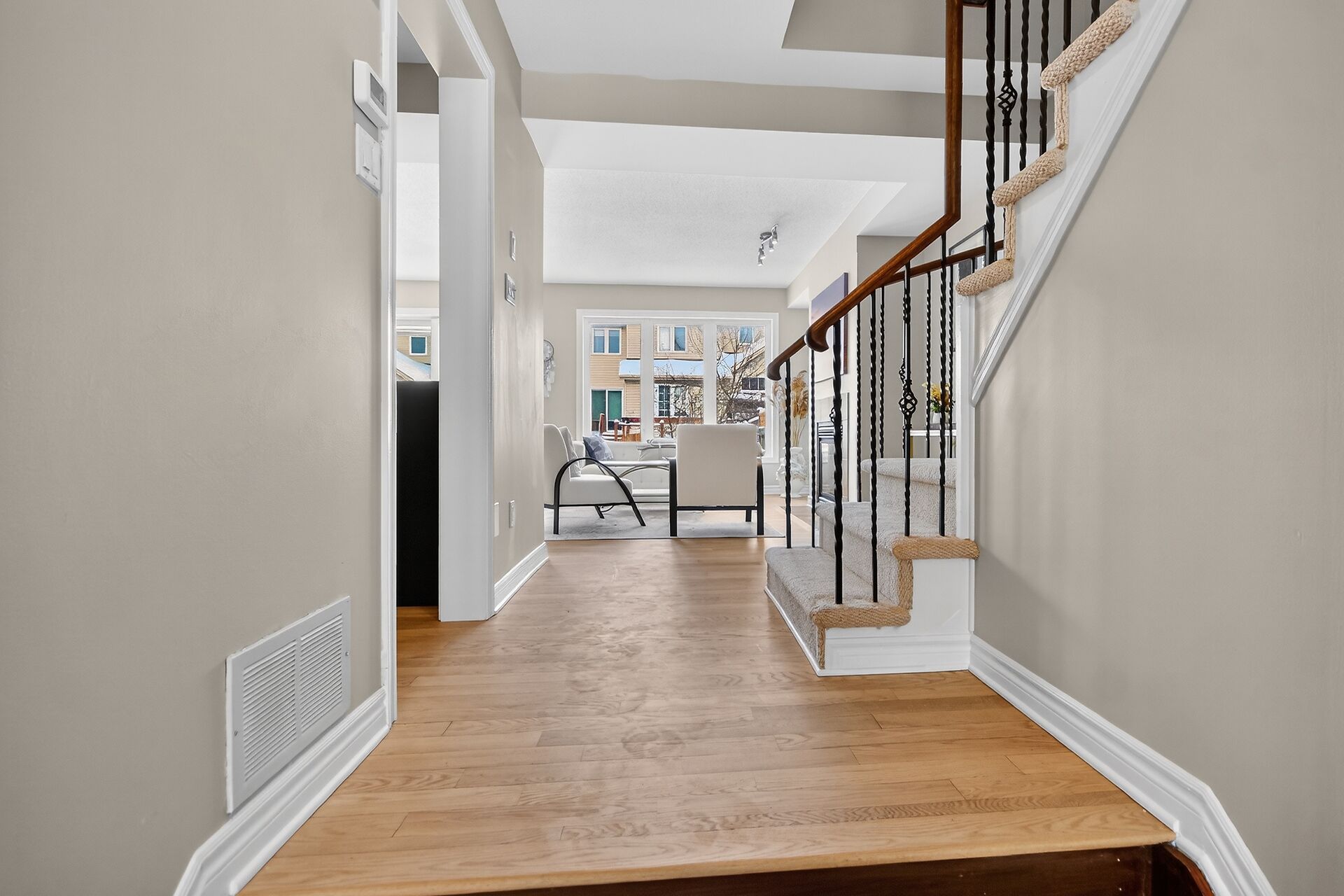 Welcome to 182 saddlesmith drive, a beautifully updated and well-maintained townhome offering a bright, functional layout and inviting living spaces. The main level features gleaming refinished hardwood floors and large, bright windows that fill the home with natural light. An open-concept design seamlessly connects the living room, dining area, and kitchen-ideal for both everyday living and entertaining. The living room is anchored by a cozy gas fireplace, creating a warm and welcoming focal point. Ceramic flooring enhances the foyer, kitchen, and all bathrooms, adding durability and style. The home has been freshly painted throughout in tasteful, neutral tones, making it truly move-in ready. The kitchen offers ample counter space with a convenient pantry and breakfast bar which overlooks the main living area, perfect for hosting family and friends. Refinished hardwood railings add a polished touch to the interior. Upstairs, newer berber carpeting leads to a spacious primary bedroom that serves as a private retreat, complete with a walk in closet and full ensuite featuring a separate shower and a relaxing soaker tub. Two additional well-sized bedrooms and a full main bathroom complete the upper level. The finished lower level provides versatile living space ideal for a family room, media area, or home gym, along with generous storage and rough in for future bath . Step outside to the fully fenced backyard and enjoy the wonderful deck-perfect for summer barbecues and outdoor relaxation. Additional updates include : garage fully finished and painted, insulated garage door, aluminum wrapping around the frame, updated weather stripping , freshly painted utility room floor, fixtures, gas hook up for bbq and dryer, much more ! Situated on a quiet street with convenient access to parks, top rated schools, shopping, and transit, this home offers comfort, quality upgrades, and an exceptional opportunity in a desirable kanata neighbourhood.