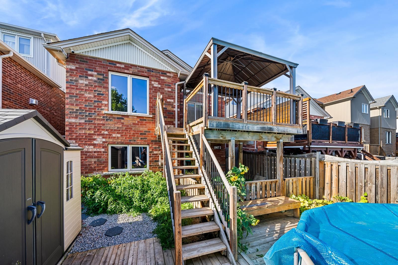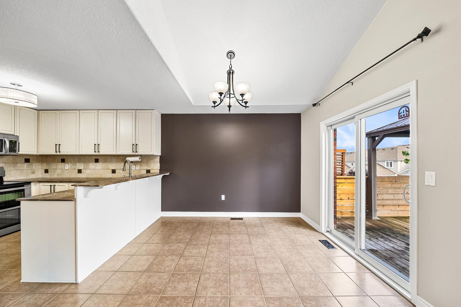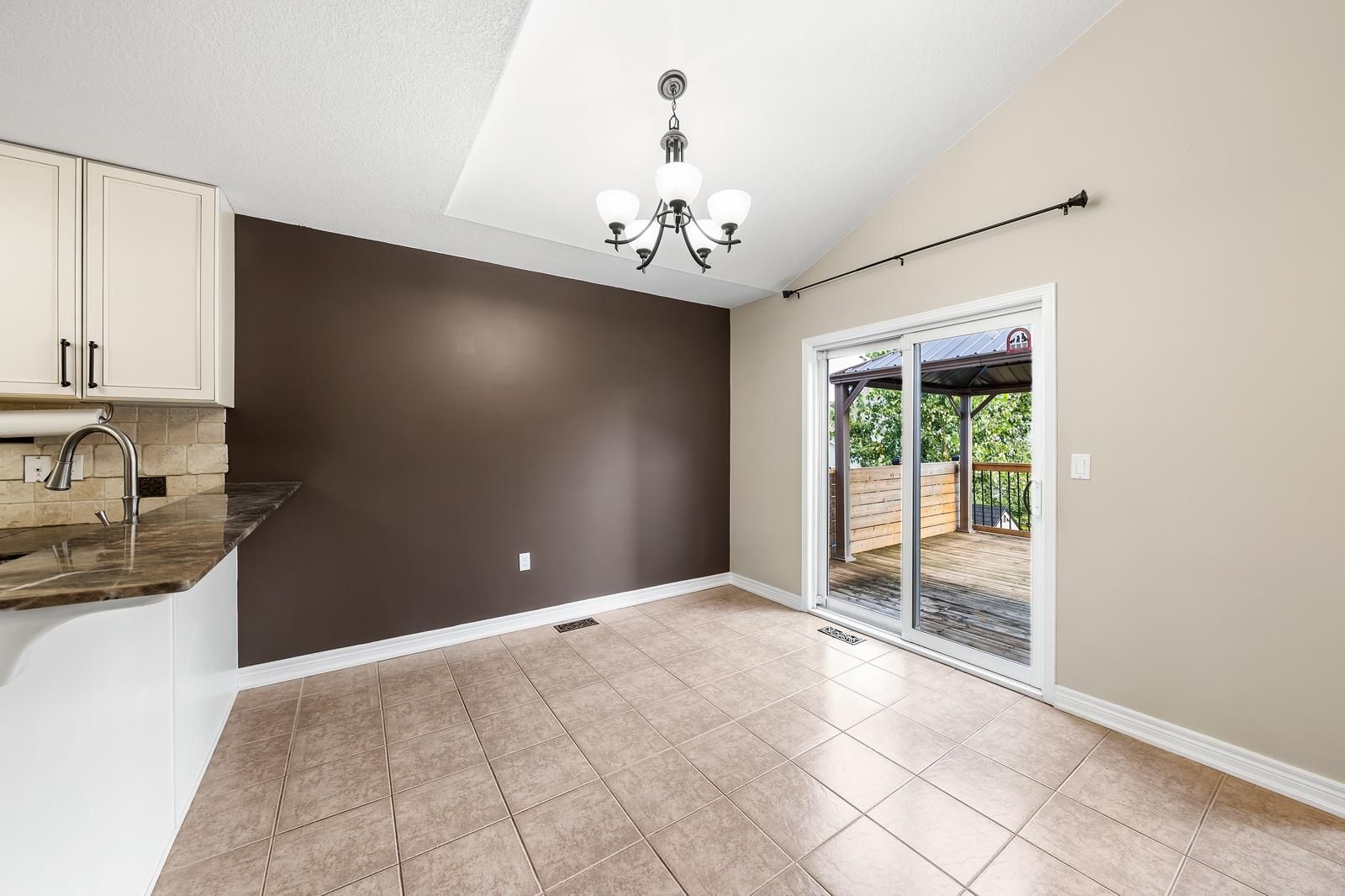 • Eat-in kitchen with pantry and access to a large deck and gazebo.