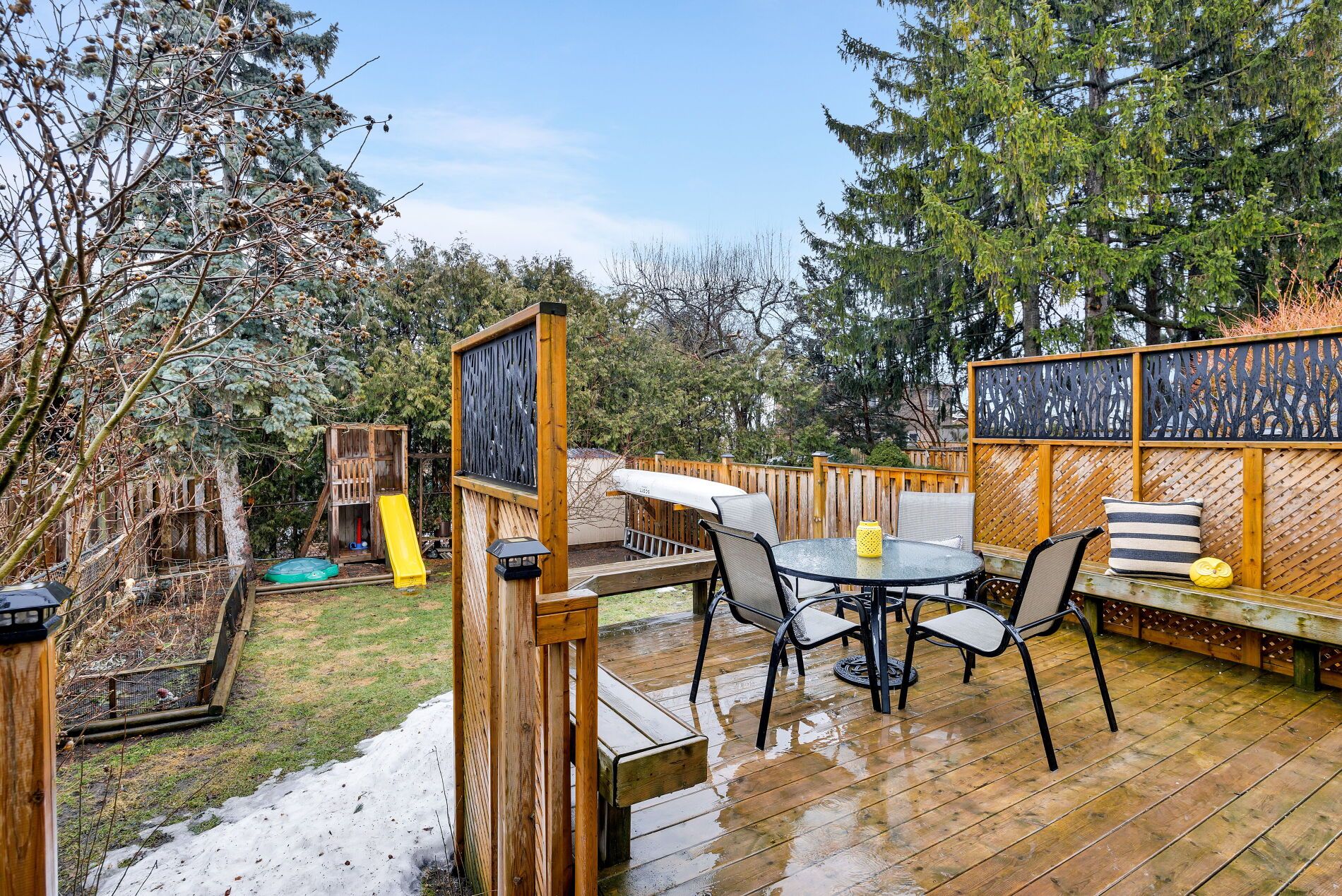• Fully fenced yard with a deck and garden bed for outdoor enjoyment.