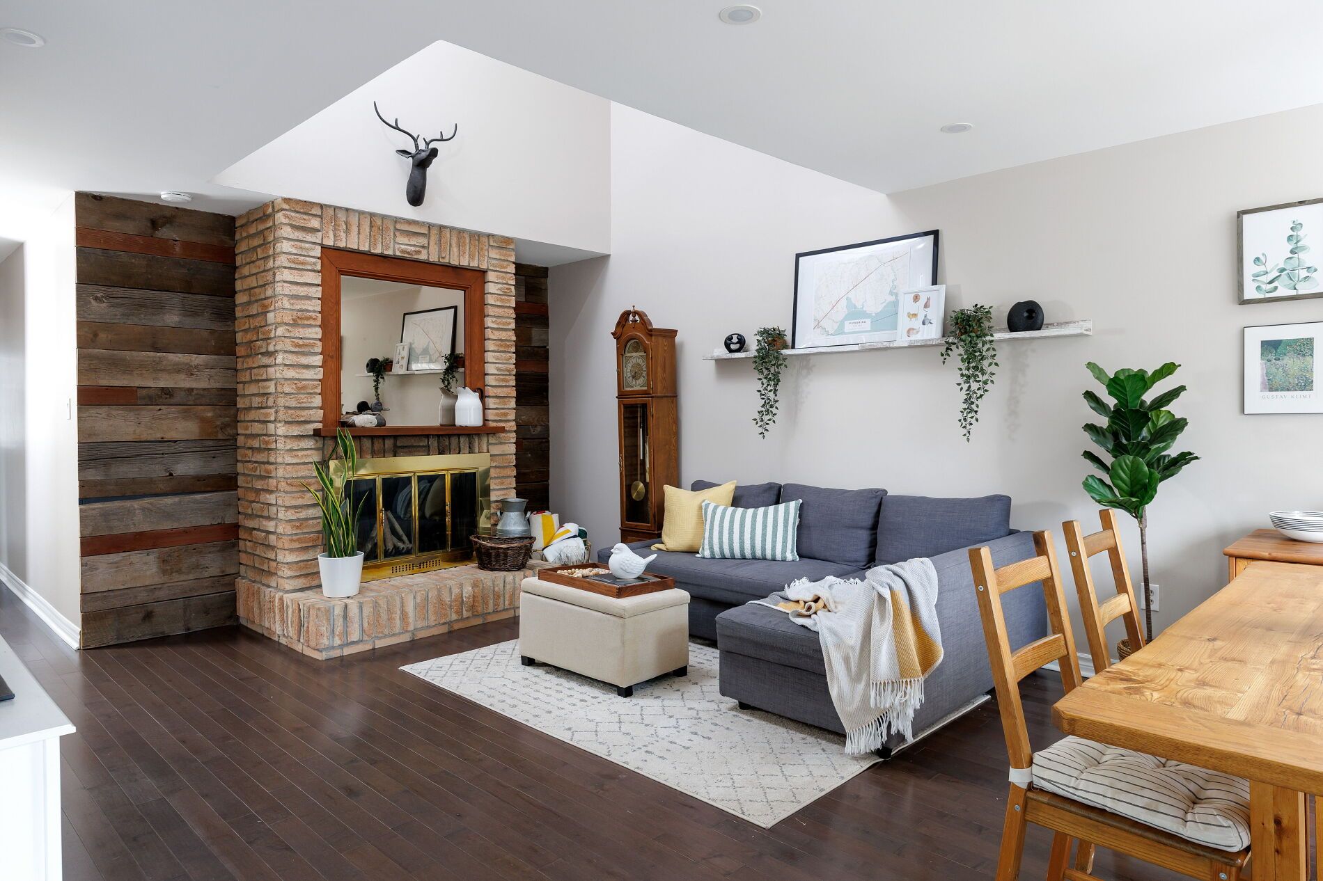 • Open family/dining room with fireplace and vaulted ceiling.