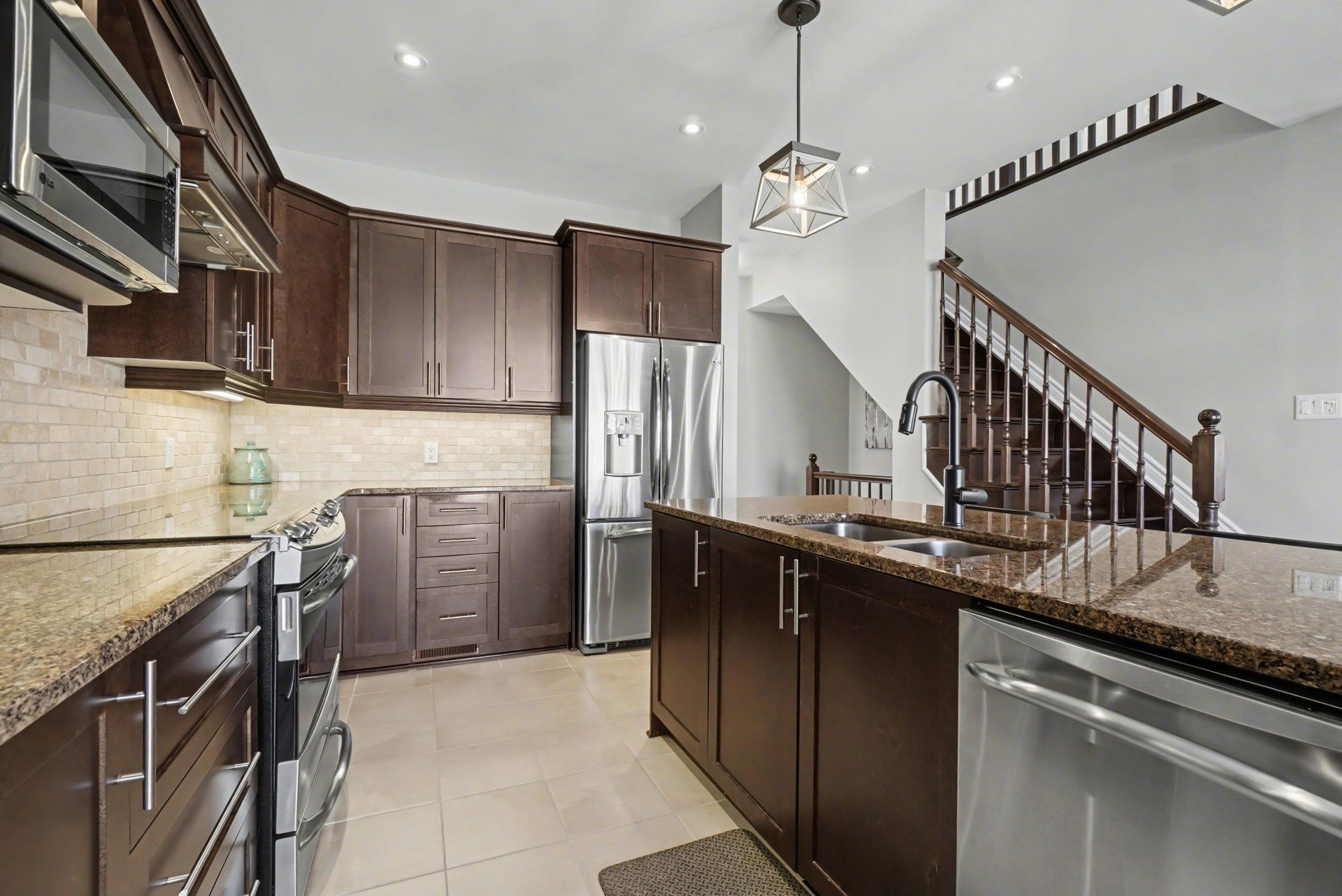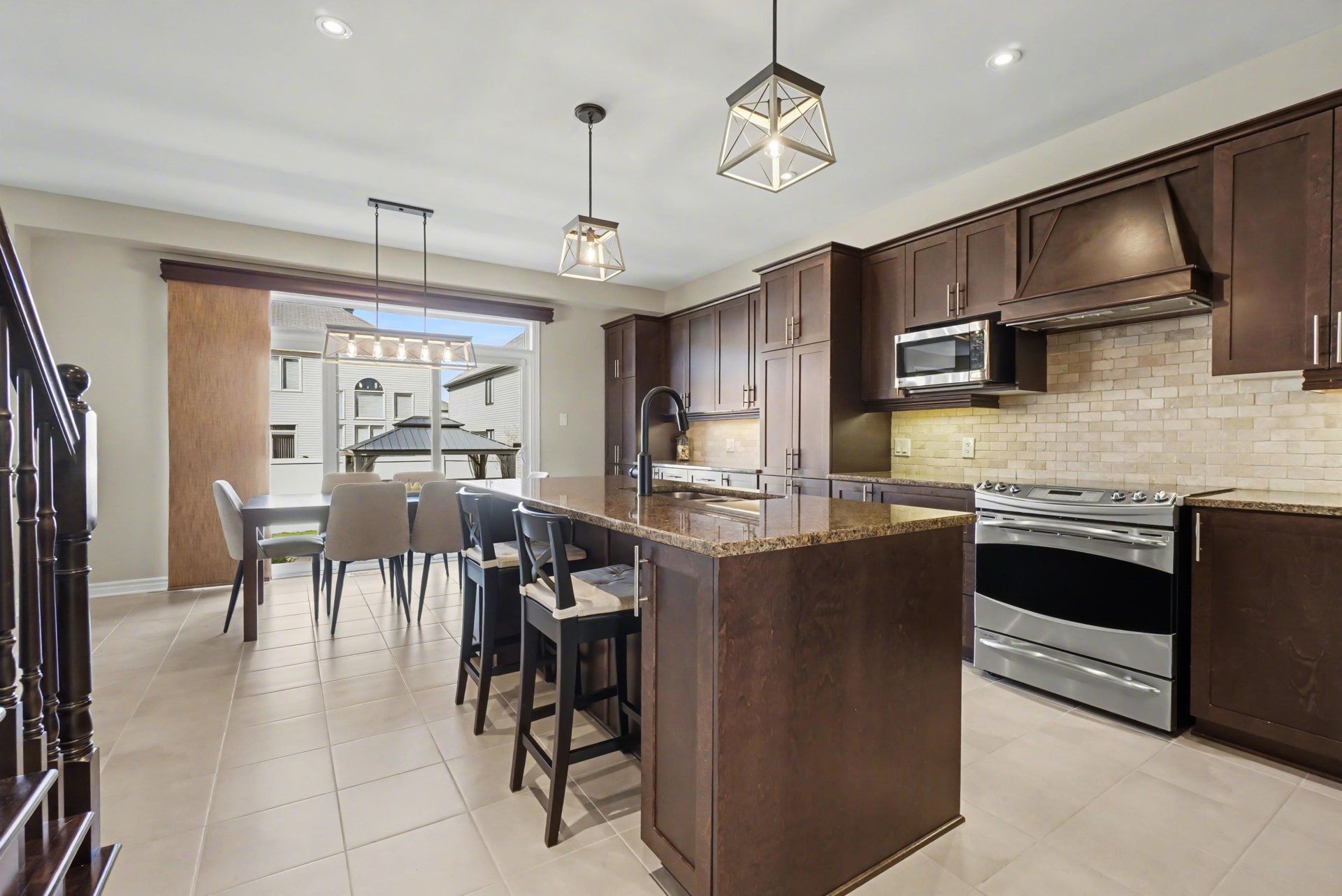 • Modern kitchen with granite countertops and a cozy island seating area.