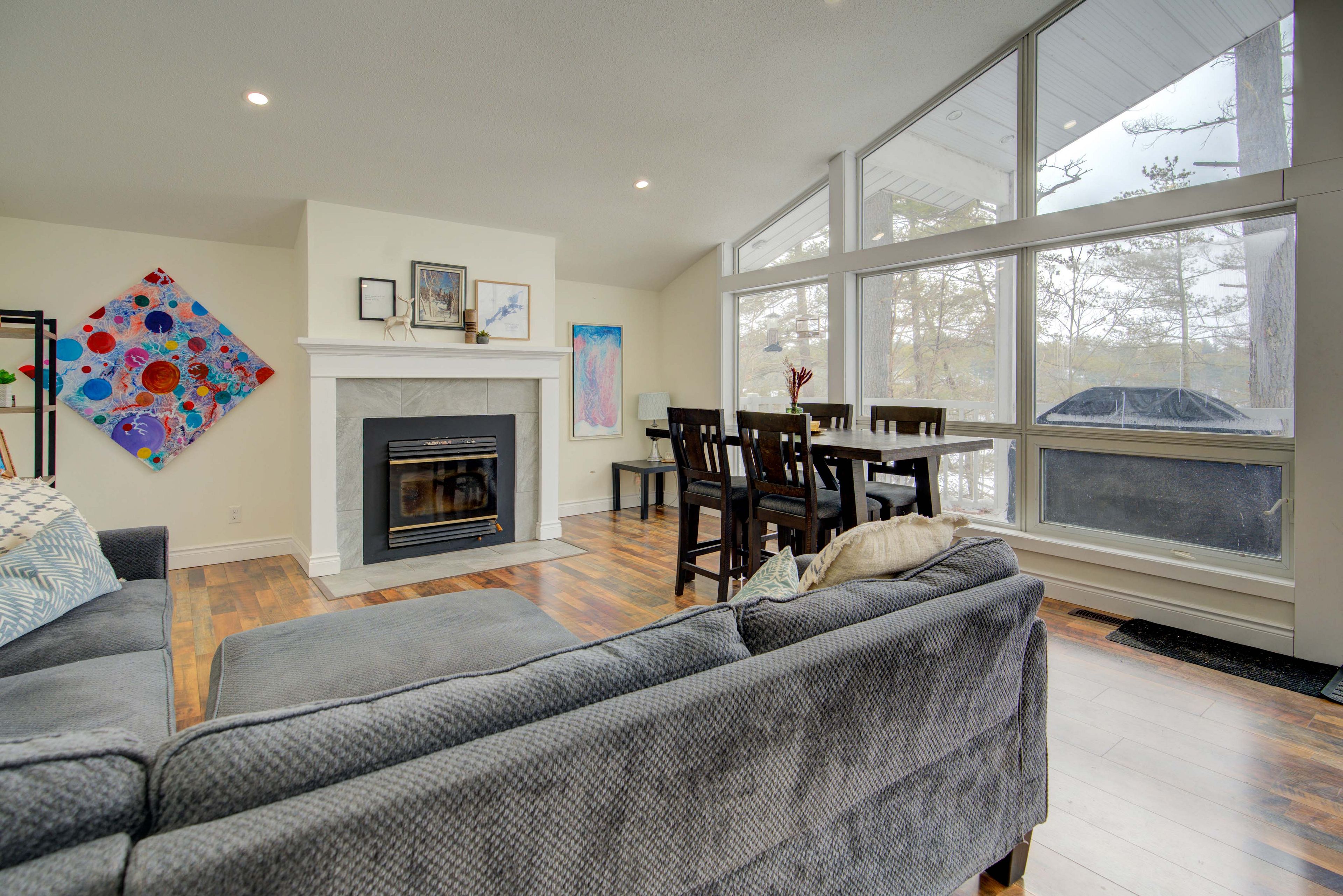 • Open and bright main area with large windows and a wood-burning fireplace.