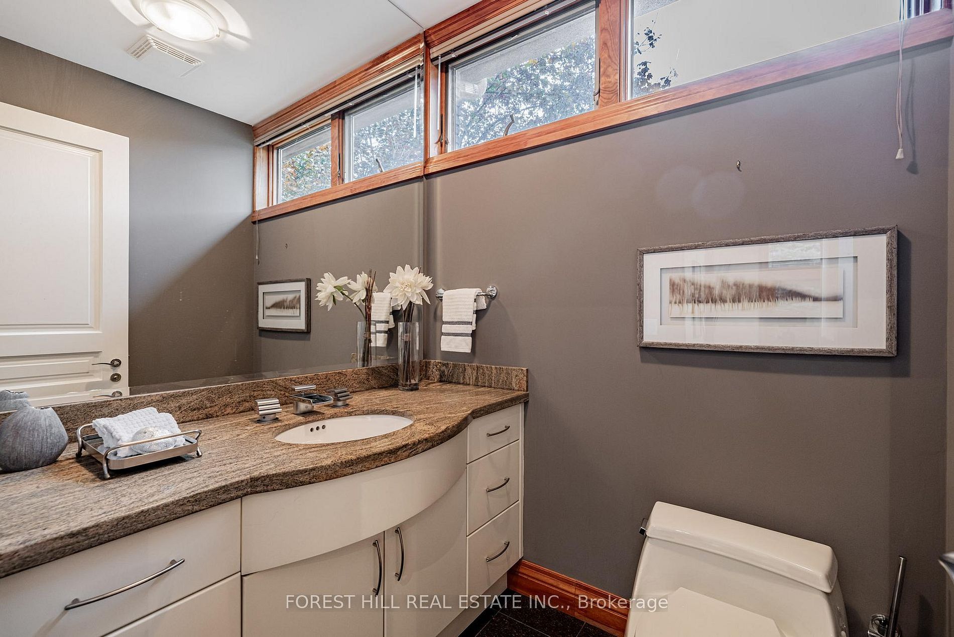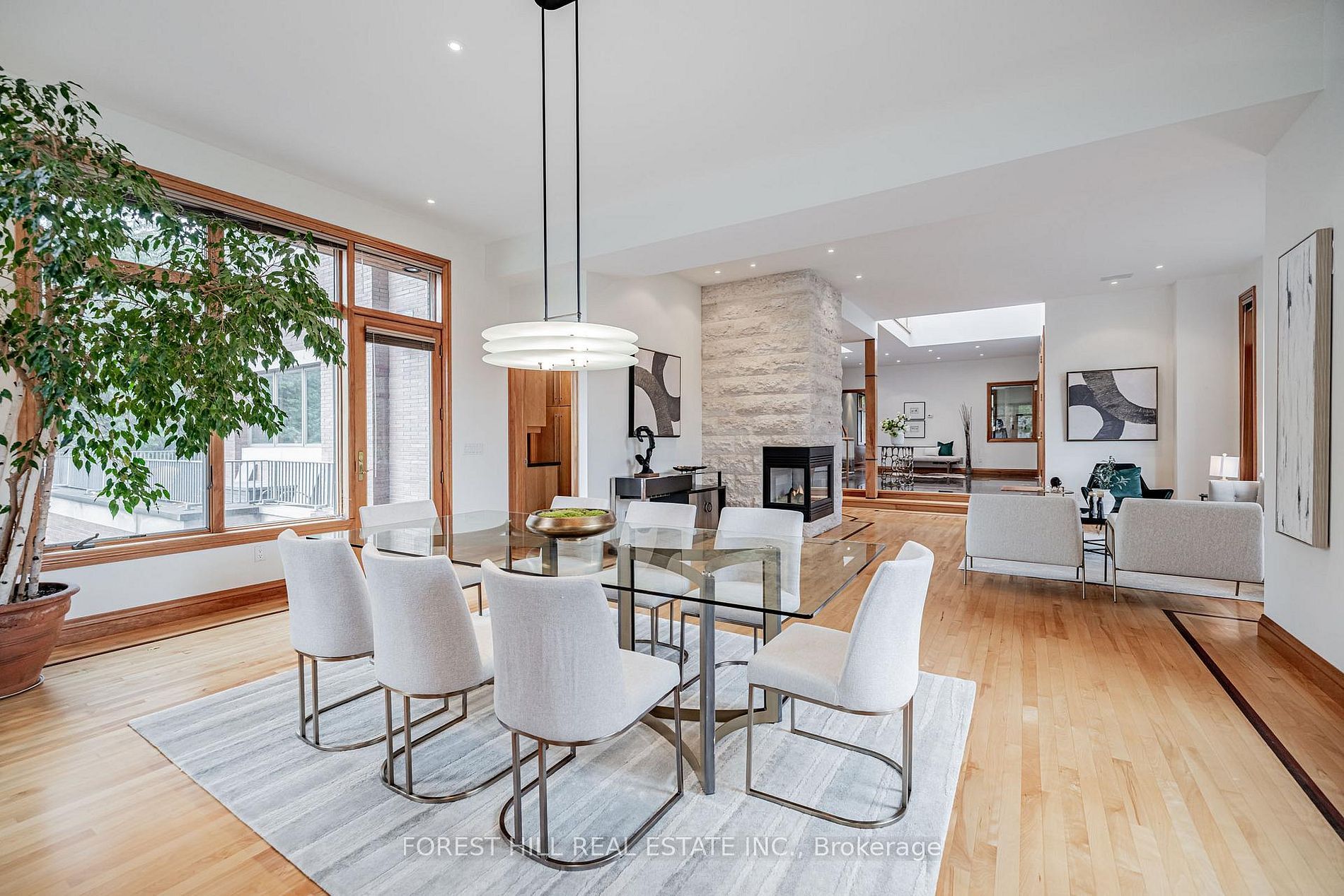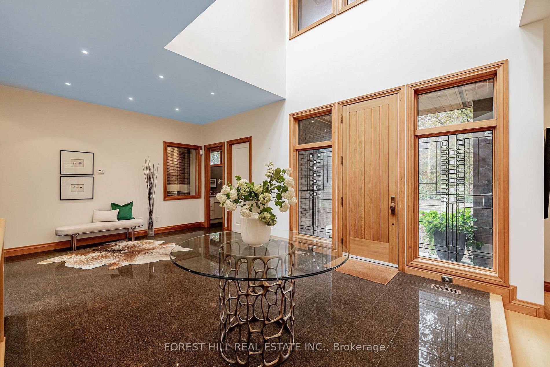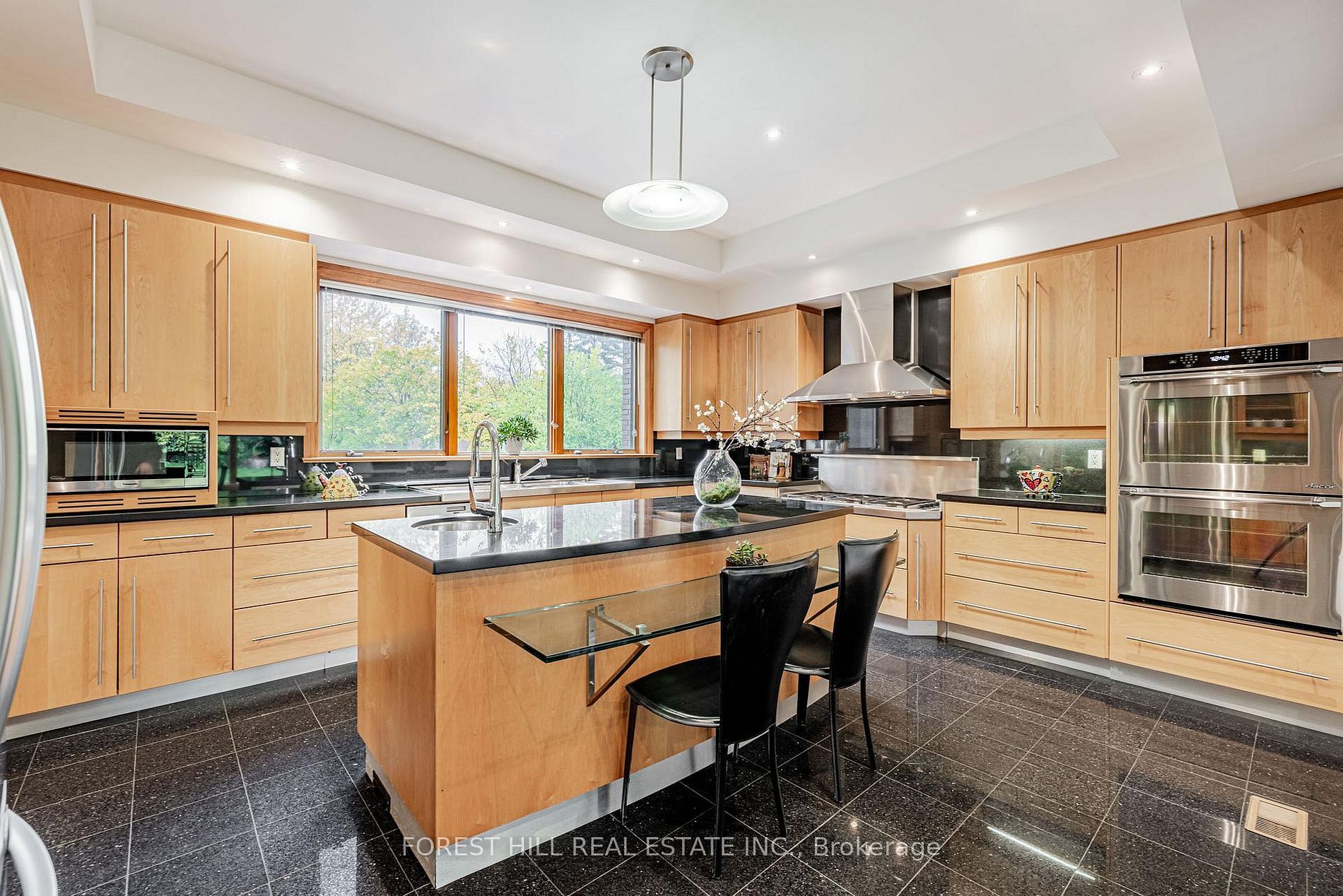 **architectural**------- bold & solid & modern & unique ------- meticulously designed by toronto's premier residential architect, "lorne rose", inspired by frank lloyd wright's iconic prairie style, this architectural gem blends seamlessly into its strong horizontal lines, open floor plans, and connection to nature, and this prairie-style home was built for its owner--has been loved by its owner for many years. This executive home residence boasts an elegant circular driveway with 3cars garage, resort-style patio wrapped both e. S sides of yard. Inside, a breathtaking 20ft cathedral ceiling with skylights entrance foyer, the living room showcases a stunning floor-to ceiling stone gas fireplace, generous principal room with hi ceiling, perfect for entertaining. The dining room offers a stunning-lush garden views with natural light, easy access to a terrace for retreat. The spacious-private family room features a wood-burning fireplace with abundant natural sun lights. The chef-inspired kitchen is equipped with premium appliance and a large eat-in area ideal for family gatherings, and private access to a wrap-around terrace complete with a pizza oven. Upstairs, providing airy-atmosphere from multi-skylights & ample windows all around. The luxurious primary suite offers a cathedral ceiling, fireplace including its own private ensuite and walk-in closet. The additional bedrooms have all double closets, lots of windows for natural sunlights, providing comfort and functionality. The fully finished lower level with separate entrance is designed for entertaining and relaxation, featuring a large recreation room, 2 bed rooms, a spacious laundry room, and a full bathroom.