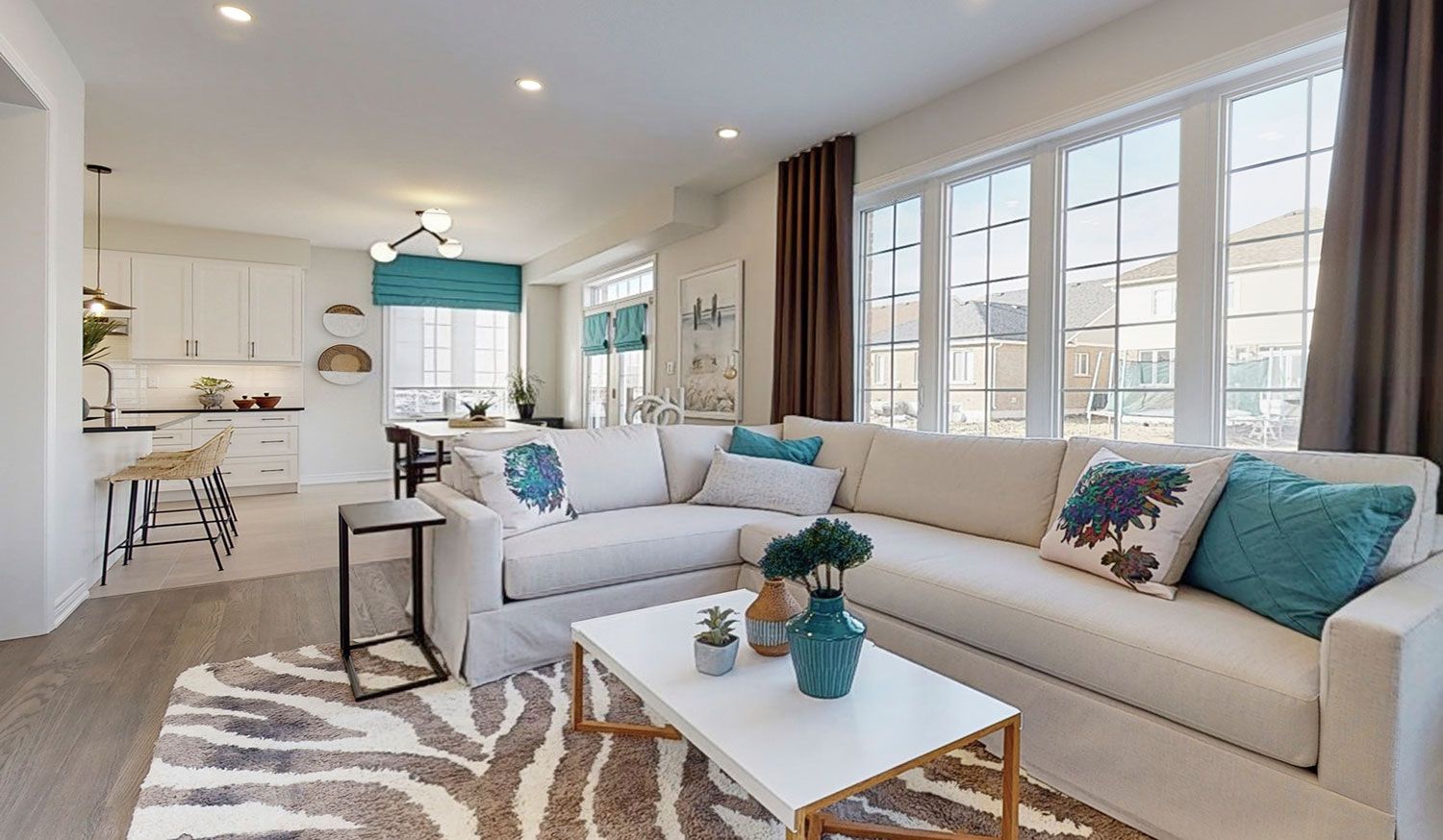 • Chef's kitchen with large quartz island and backyard deck access.