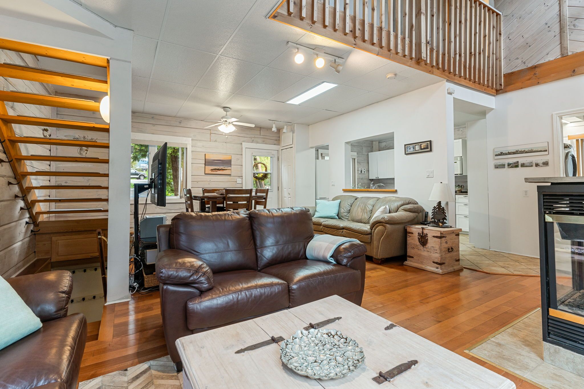 • Open-concept main floor features hardwood and a cozy gas fireplace.