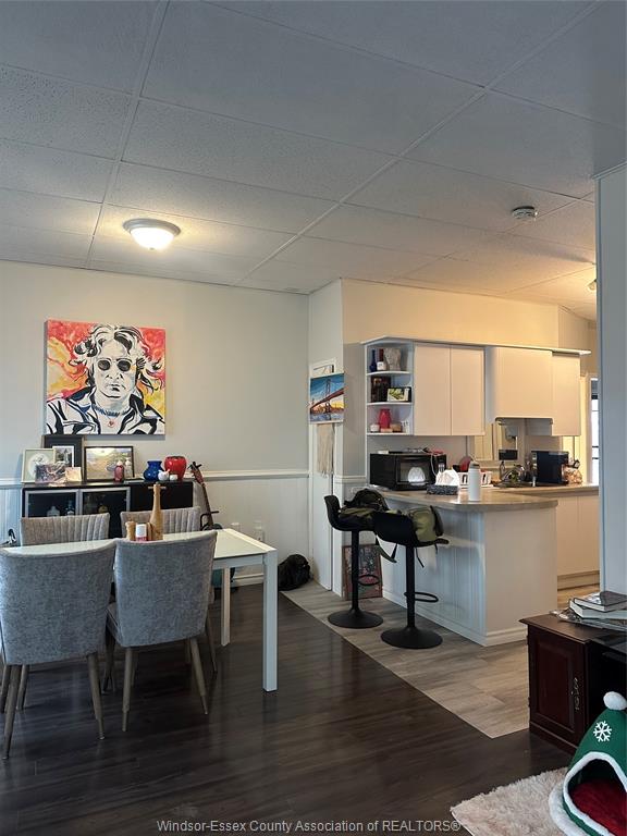 • Kitchen features ample cabinets, counter space, and dining area.