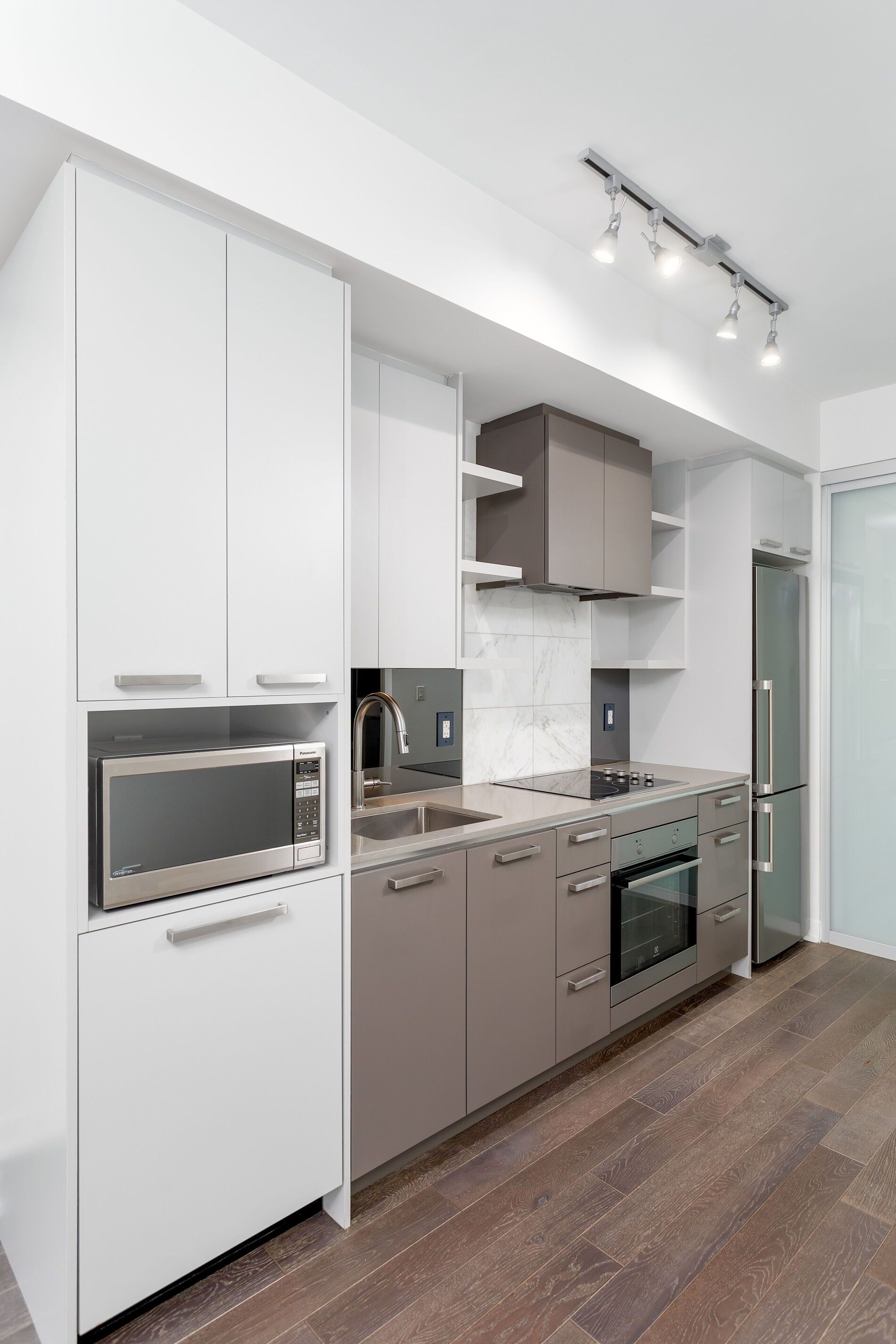 • Modern kitchen with stainless steel appliances and ample storage.
