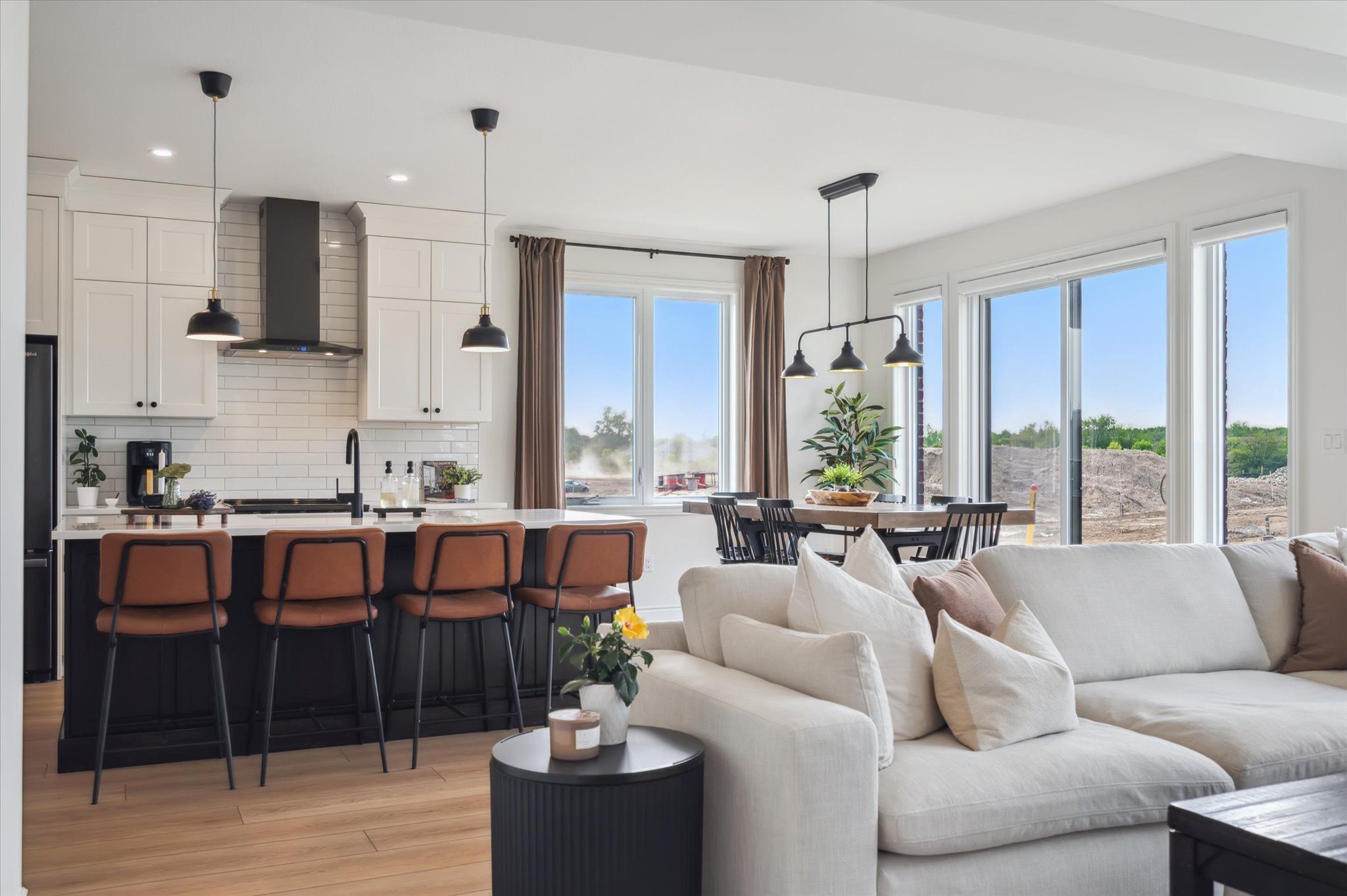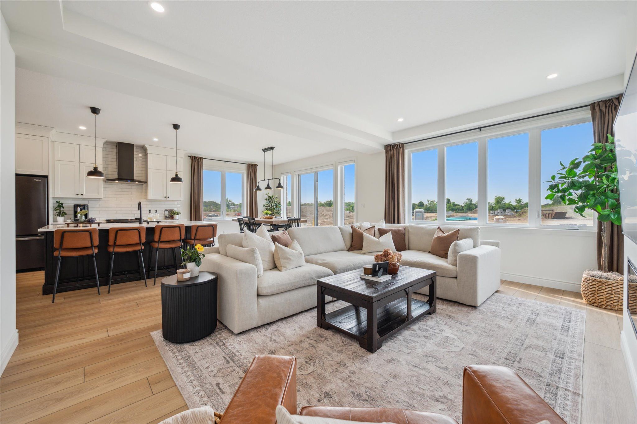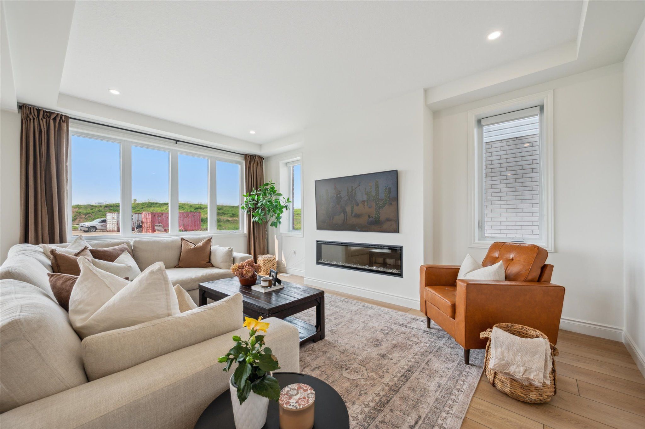 • Open concept living area with elegant finishes and an electric fireplace.