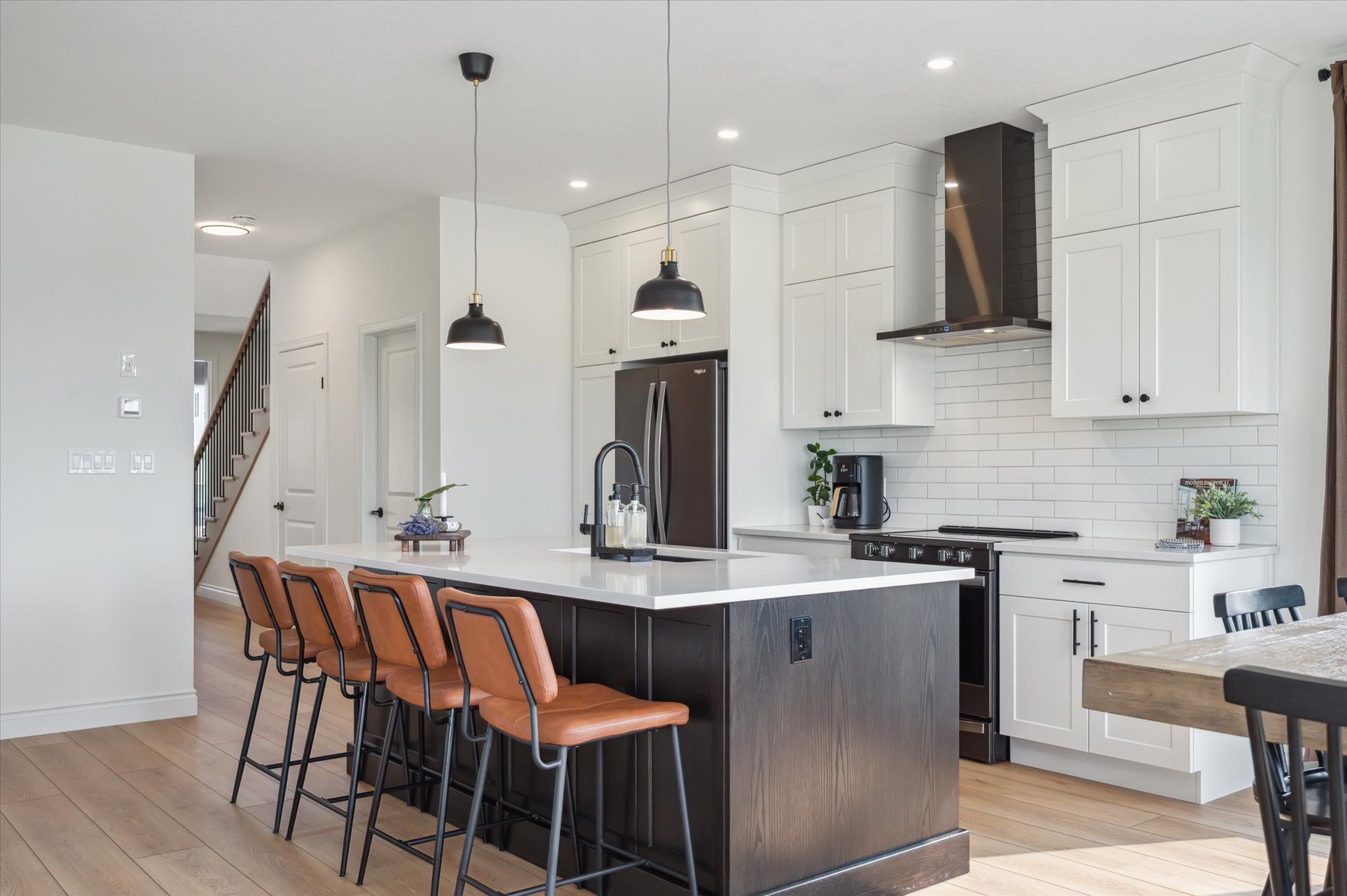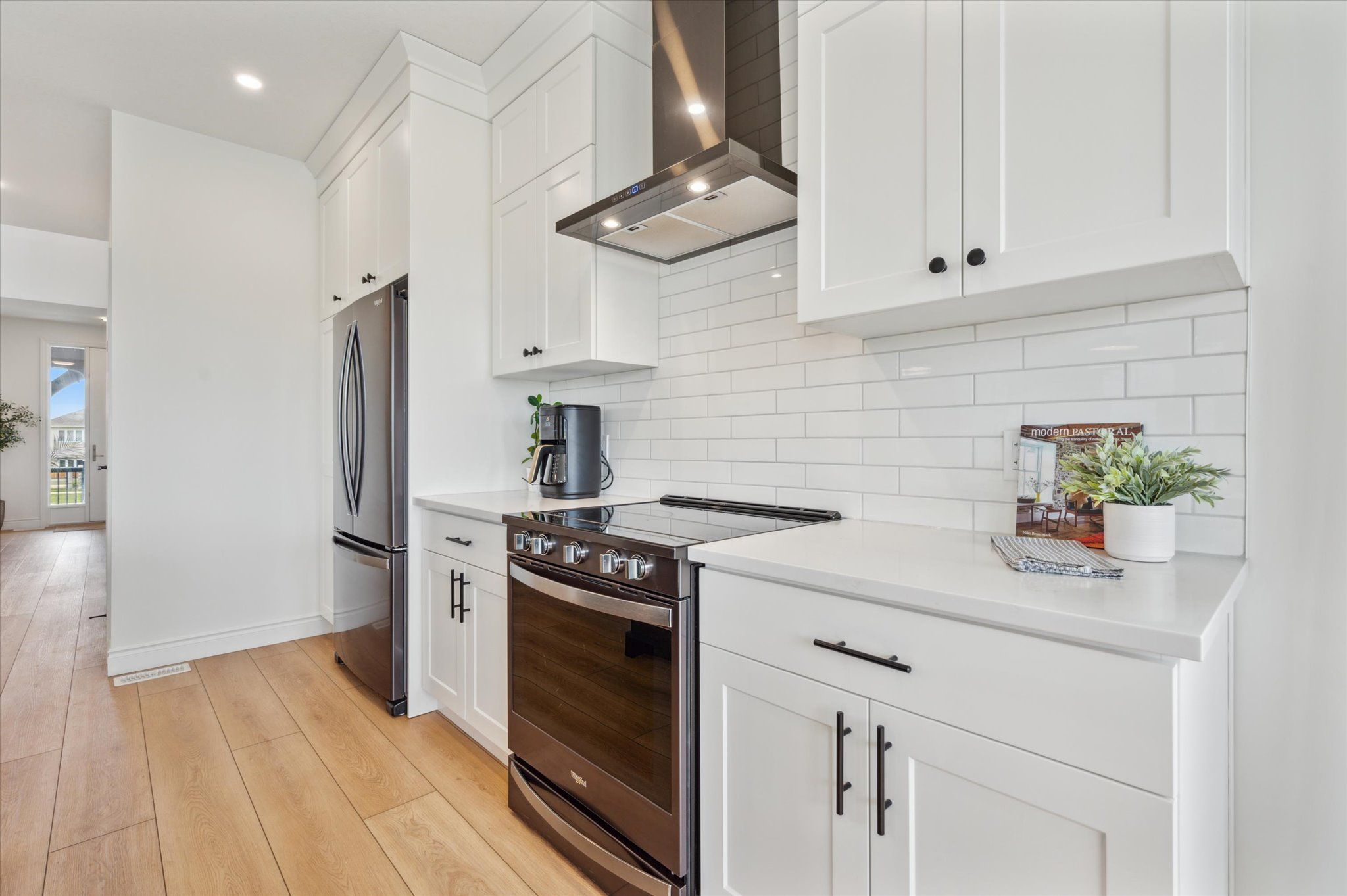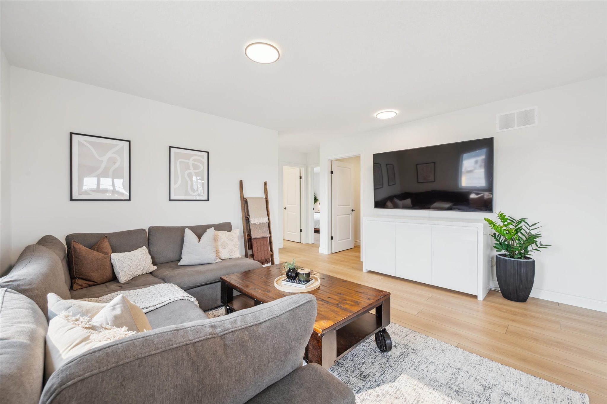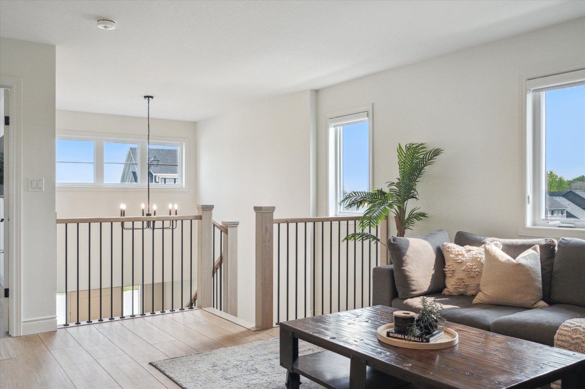 • Open concept living area with elegant finishes and an electric fireplace.