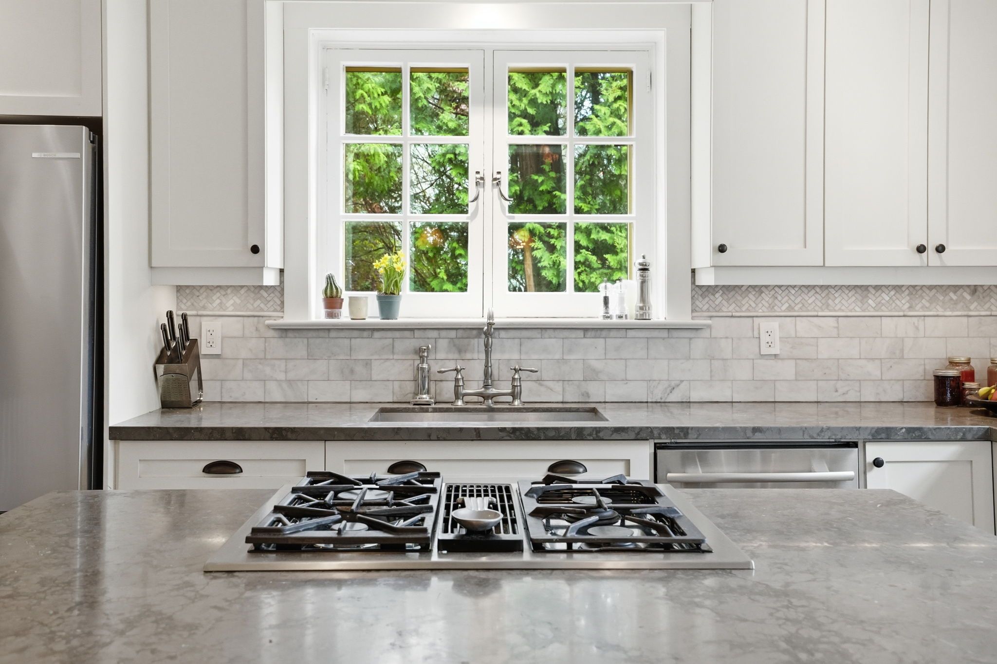 • Modern kitchen with soapstone countertops and dual dishwashers.
