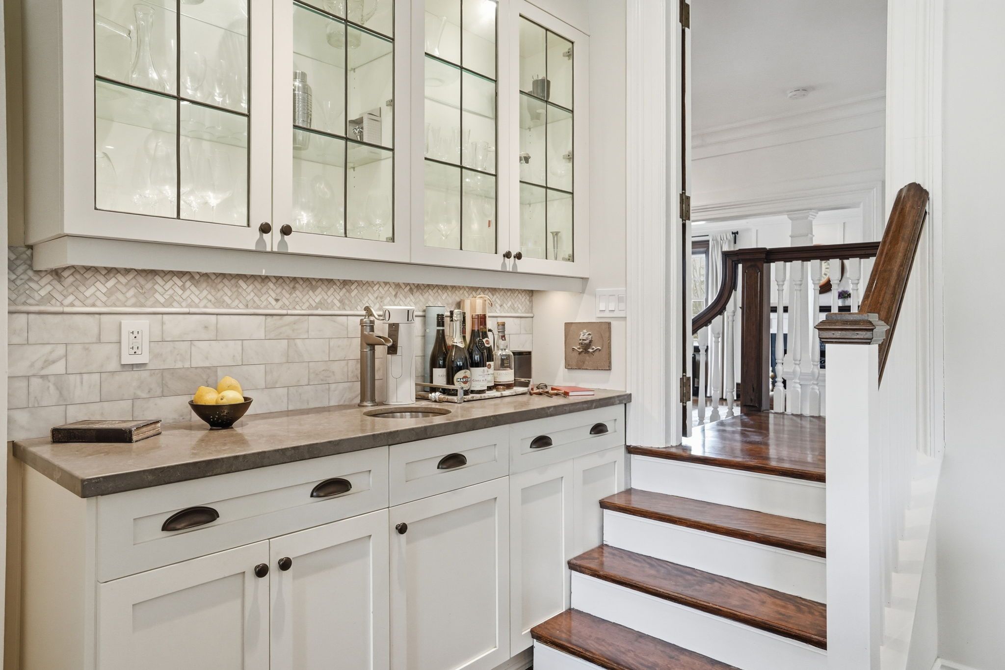 Set in the heart of old oakville on a generous, tree-lined lot, this distinguished red brick residence blends timeless architecture with thoughtful modern updates. Featuring 3+1 bedrooms and 5 bathrooms, each upper bedroom offers its own private ensuite, delivering a rare level of comfort and privacy. The main level is defined by rich character and natural flow, with original wood detailing, oak hardwood flooring, and a gradual-rise staircase anchoring the space. The living room is both refined and inviting, centered around a gas fireplace with custom paneling, while the formal dining room provides an elegant setting for entertaining. At the heart of the home, the kitchen features blue lagos soapstone countertops, custom cabinetry, a large island with integrated cooktop, and dual dishwashers. A built-in wet bar enhances functionality, while large windows connect the space to the surrounding greenery. A standout feature is the carriage house-inspired bar area with original doors offering a unique blend of heritage charm and everyday use. A sunroom with terracotta tile flooring provides a bright, relaxed retreat with direct access to the outdoors. The finished lower level extends the living space with a recreation room featuring a second gas fireplace, additional living areas, a bedroom, full bathroom, and dedicated wine display. Complete with a detached two-car garage, mature landscaping, and located just steps to the shops, restaurants, and waterfront of old oakville, this is a rare opportunity to own a character home in one of the area's most sought-after neighbourhoods.