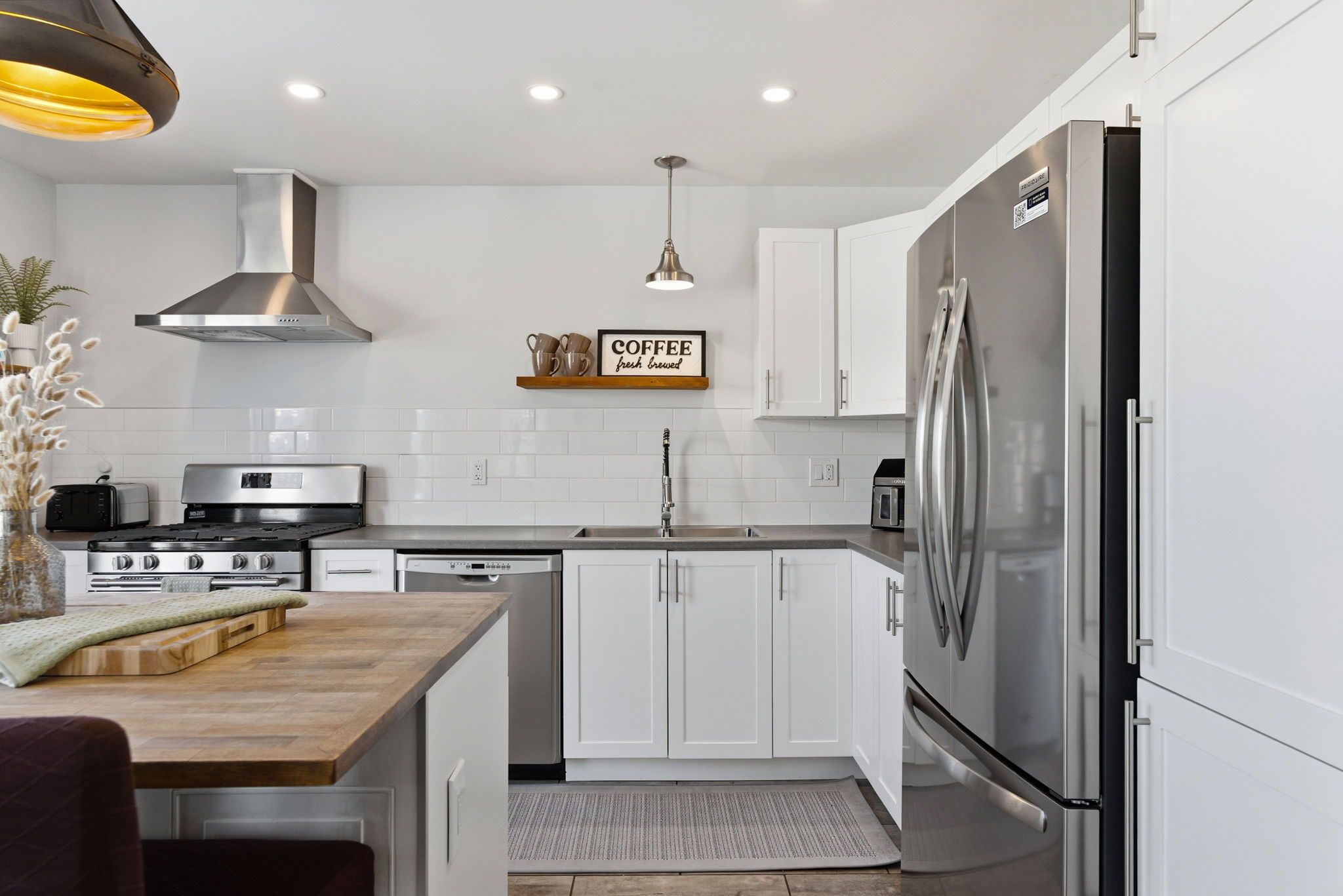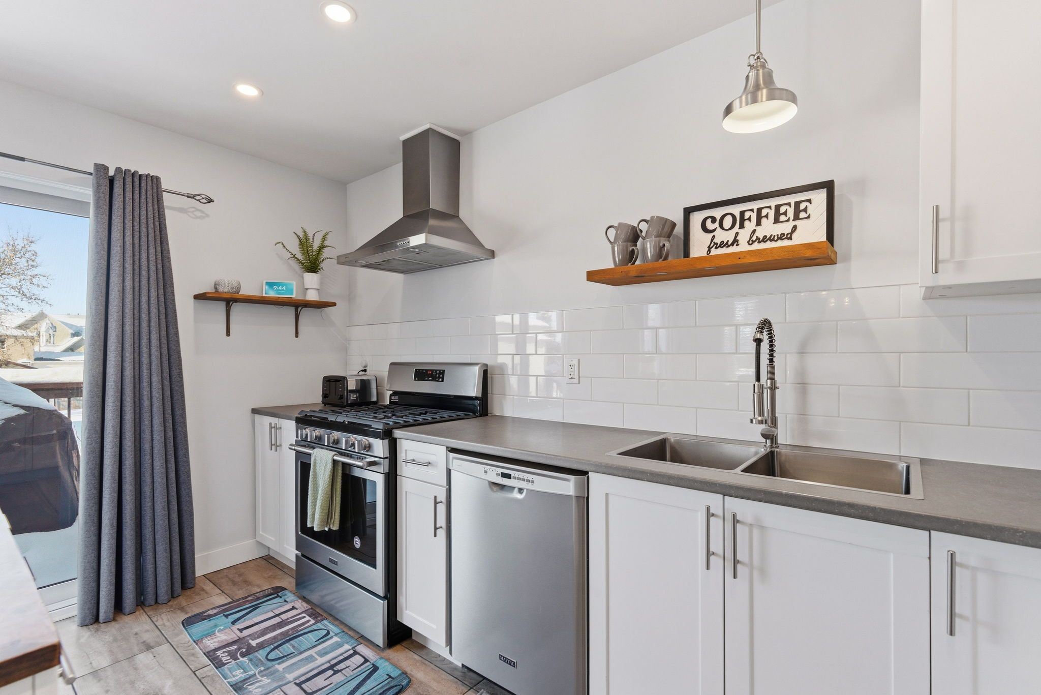 • Functional kitchen with stainless steel appliances and patio doors to the deck.