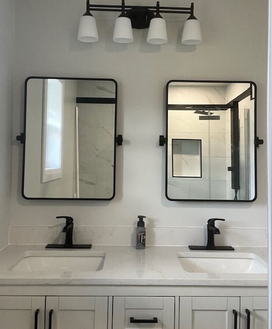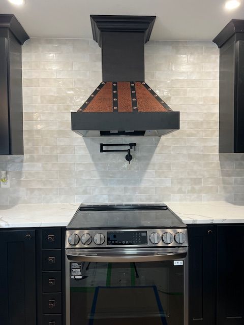 • Modern kitchen with sleek cabinets, stone counters, and brand-new appliances.