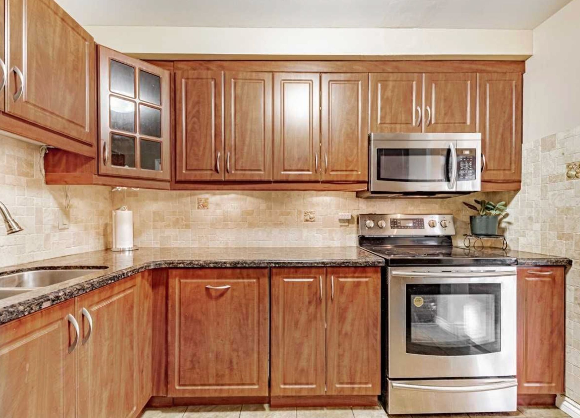 • Kitchen features granite countertops and stainless steel appliances in great condition.