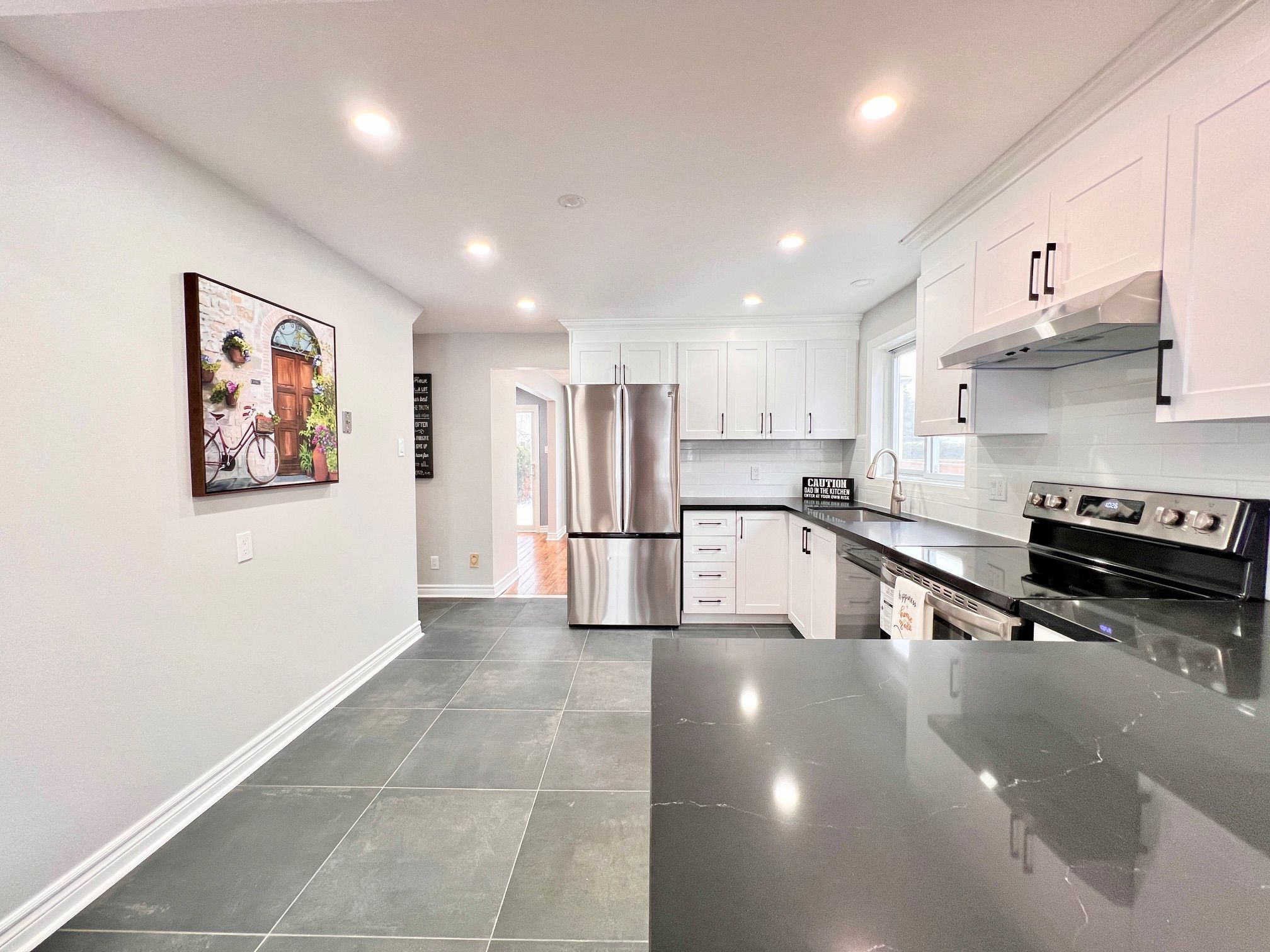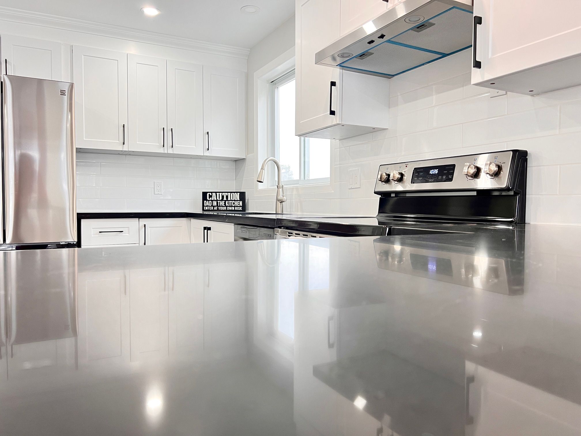 • Gourmet kitchen featuring quartz countertops and new stainless steel appliances.