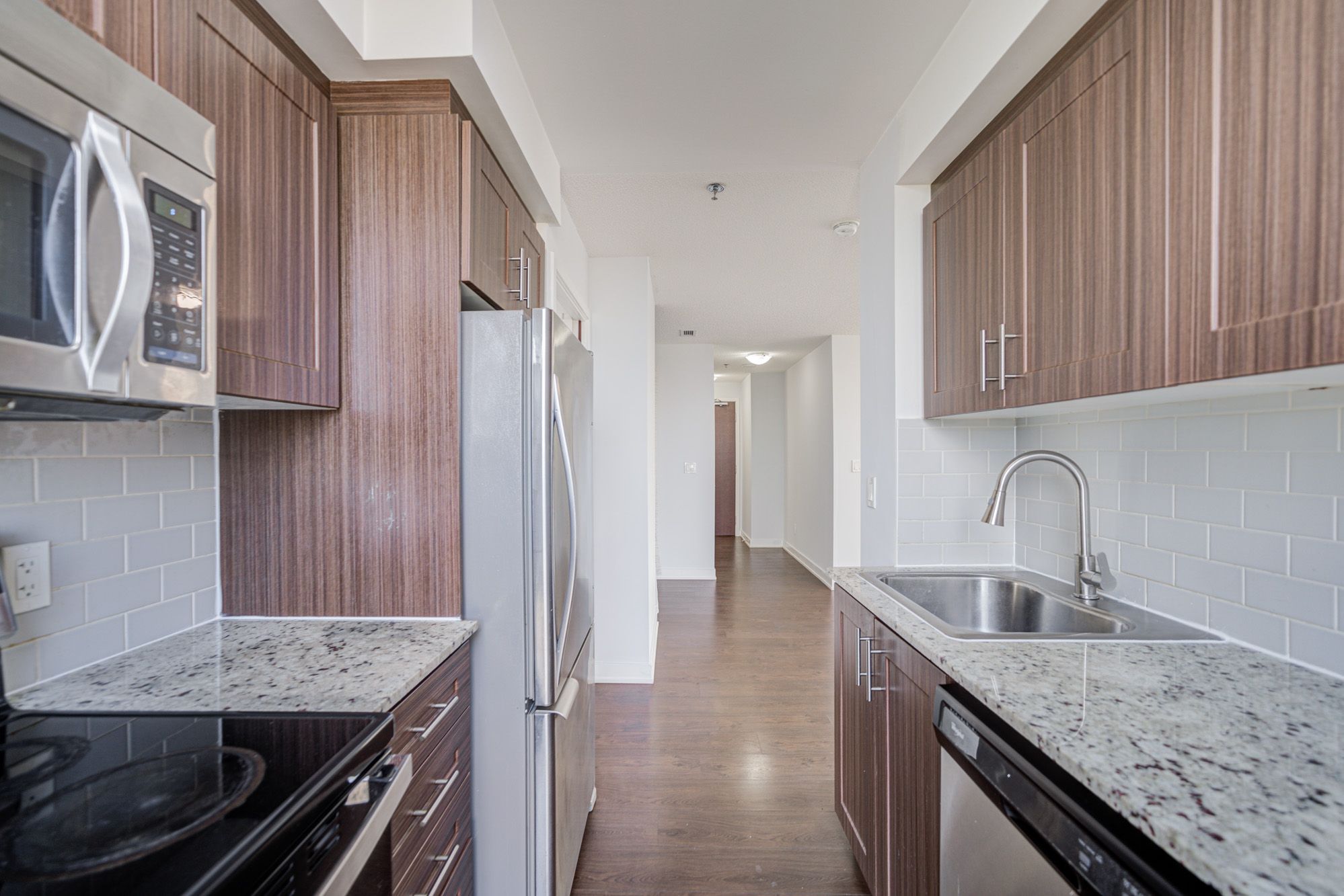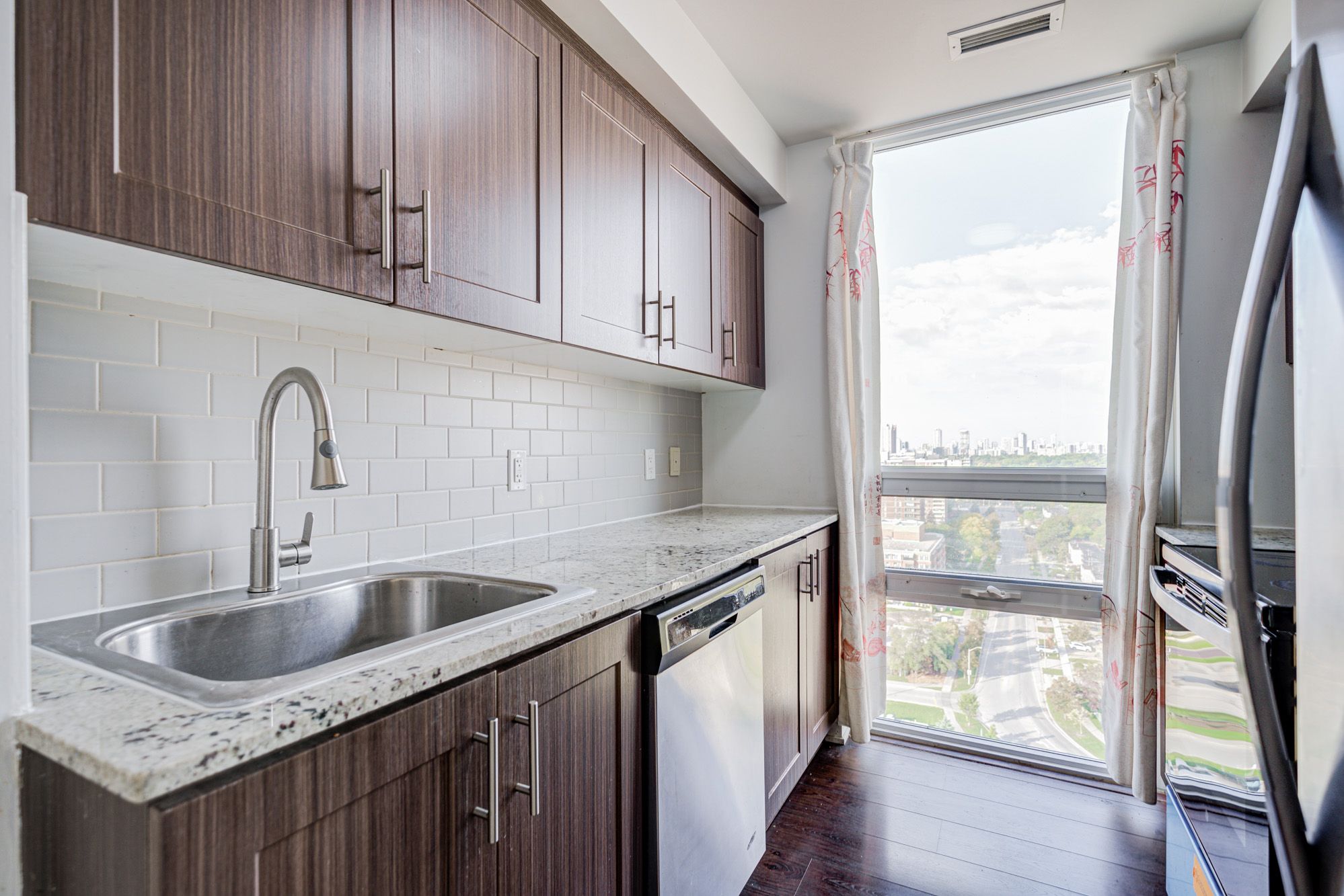 • Modern kitchen featuring granite countertops and large sink.