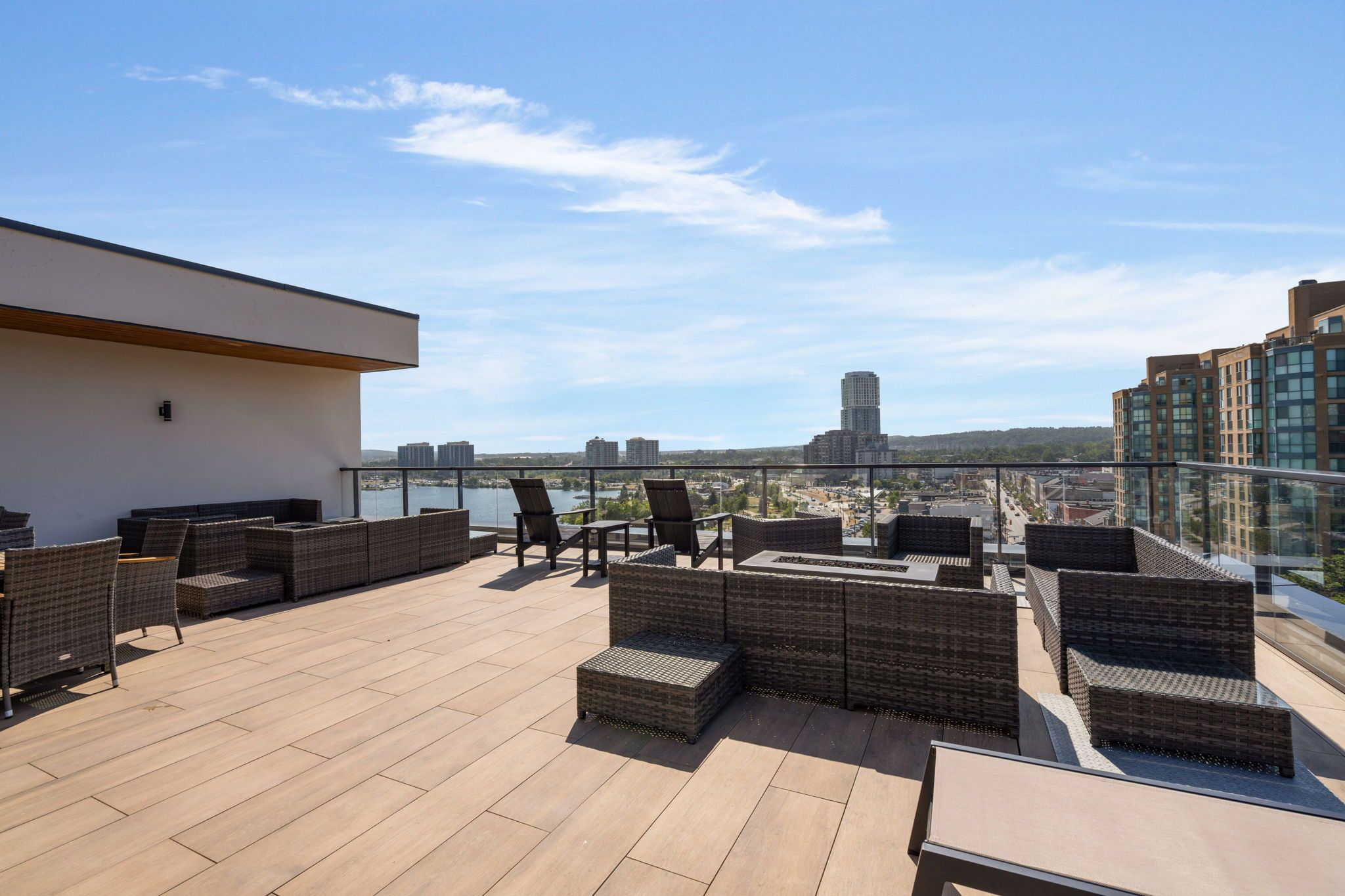 True lakeside living at lakhouse condos on the shores of kempenfelt bay. This scandinavian-inspired 2-bedroom, 2-bathroom suite offers over 1,100 sq ft of thoughtfully designed living space with 9-ft ceilings, oversized windows, and a bright open-concept layout filled with natural light. The designer kitchen features quartz countertops, high-end stainless steel appliances, stylish backsplash, and a large centre island with breakfast bar seating. One of the standout features is the rare covered and enclosed terrace accessible from both the living room and primary suite, creating a seamless indoor-outdoor living experience. The spacious primary retreat offers floor-to-ceiling windows, walk-in closet, and a 3-piece ensuite with oversized glass shower and custom vanity. Enjoy resort-inspired amenities including concierge, gym, sauna, hot tub, guest suites, party/lounge spaces, and rooftop terraces overlooking the water. Steps to barrie's waterfront, trails, marina, restaurants, downtown core, and easy access to hwy 400. **maintenance includes water & heating!* 1 storage locker & 1 parking included!**