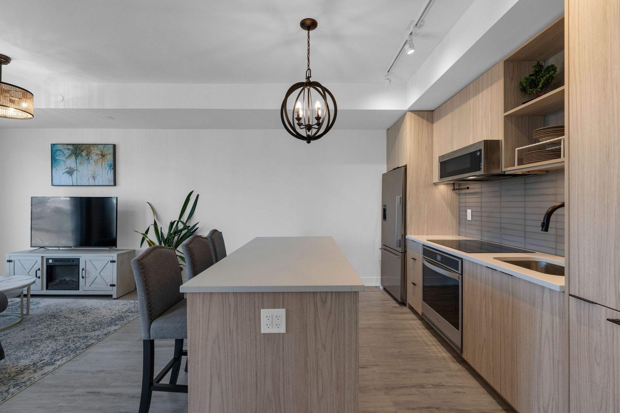 • Designer kitchen features quartz countertops and stainless steel appliances.