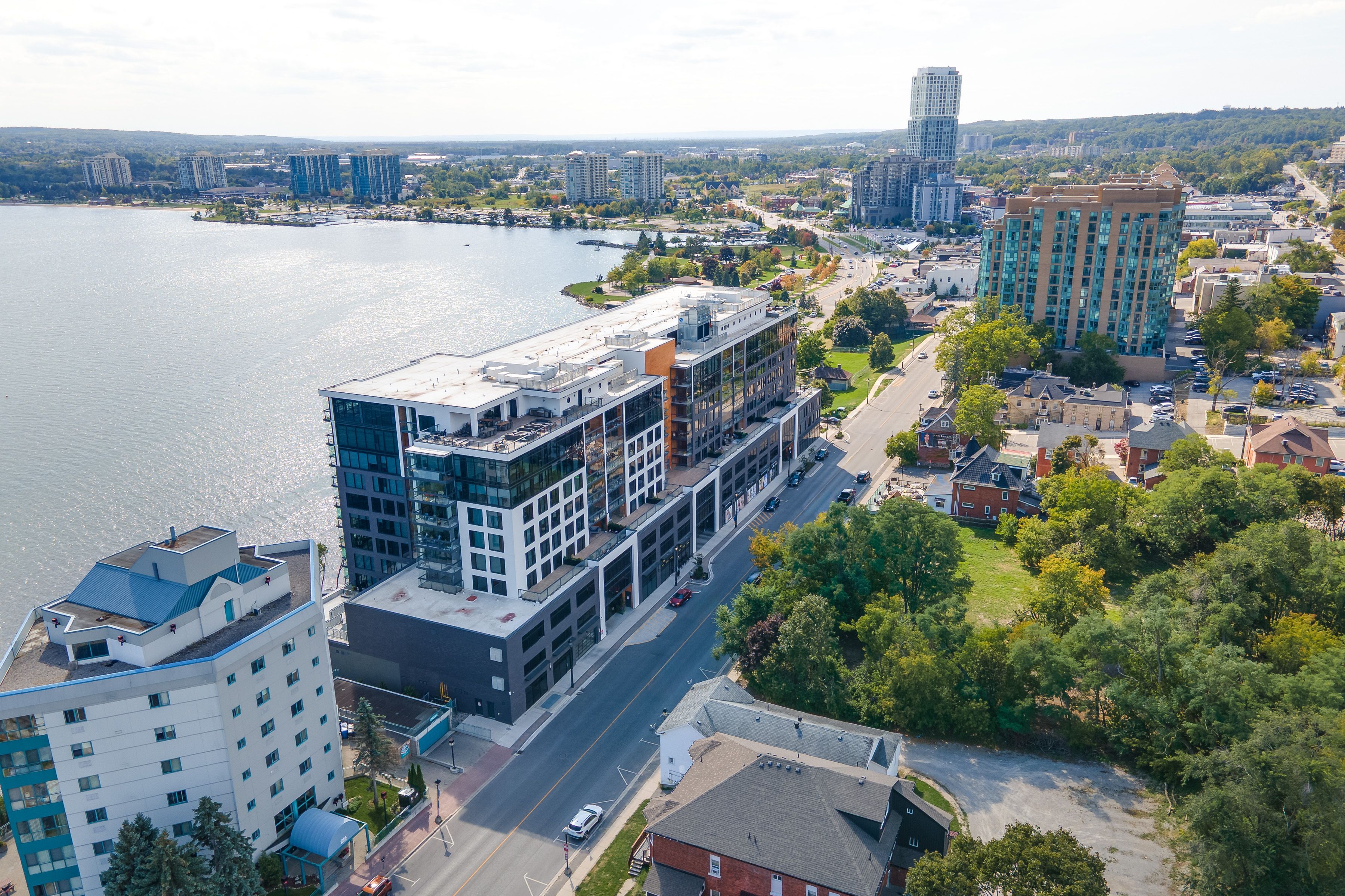 The lakhouse lifestyle beckons at barrie's premium downtown lakefront residence. More than just a place to call home, lakhouse is where beautiful contemporary design & luxurious resort inspired living bring a friendly community together to improve your quality of life. Featuring 2 bdrms, large den & 2. 5 baths, at 1726 sq ft, this expansive corner suite is all about clean lines, a light & airy yet cozy vibe & stunning lake & city views being one of the top 3 floors, the only floors w/ floor to ceiling glass. Endlessly interesting, revel in the everchanging blues of kempenfelt bay & the twinkling lights of the city skyline. Savour lake breezes & the incredible nightly sunset show from your 113sqft, all season lumon glass enclosed balcony. Bright living/dining/kitchen space, perfect for relaxing or to entertain family & friends in your sleek scandi inspired kitchen w/ caesarstone countertops, induction cooktop & pot drawer upgrades. Zenlike primary suite w/ 2 full walls of glass, dazzling water/city views, dual closets, spa like ensuite w/ glass shower, vanity/makeup counter. Roomy 2nd bdrm w/views, 2 closets & ensuite w/ soaker tub. Make the den your own as an office/home entertainment rm or convert to a 3rd bdrm. Plentiful storage throughout + same floor storage locker. Over $25k in upgrades including pax closet inserts & r/c window blinds. Embrace the outstanding amenities: fabulous fitness/gym/yoga rm; gorgeous spa area w/ hot tub/steam rm/sauna overlooking the lake; swim docks to enjoy the clear waters of lk simcoe; patio; massive east & west rooftop decks w/ bbq areas, loungers, gas f/p's, rooftop kitchen; guest suites; petwash station, organized socials. Enjoy a stunning party rm & chef's kitchen to connect w/ lakhouse friends or host an upscale gathering. 1 parking spot included (2nd spot available for purchase @ $50k if needed). Paddle the bay, walk/bike the north shore trail, stroll to amazing dining/park/beach. Life is good & the living is easy at lakhouse