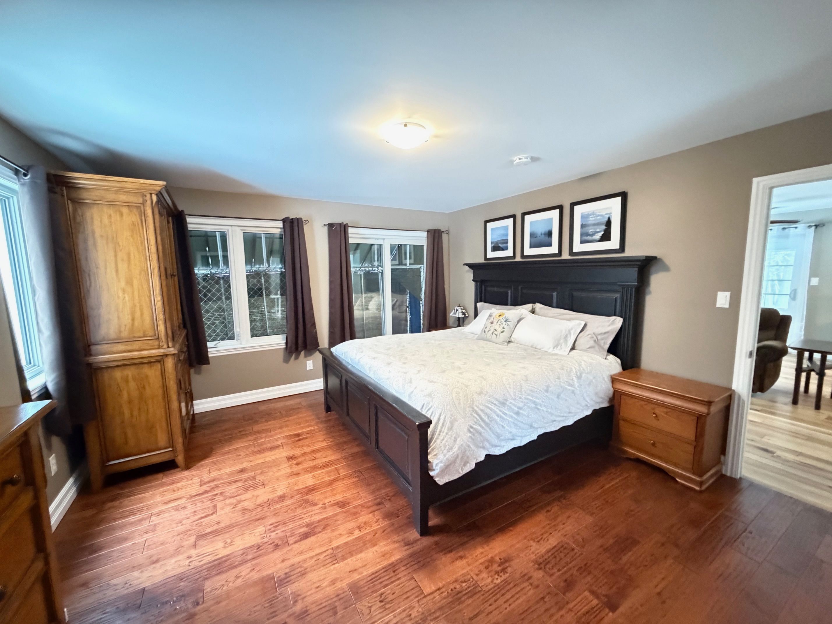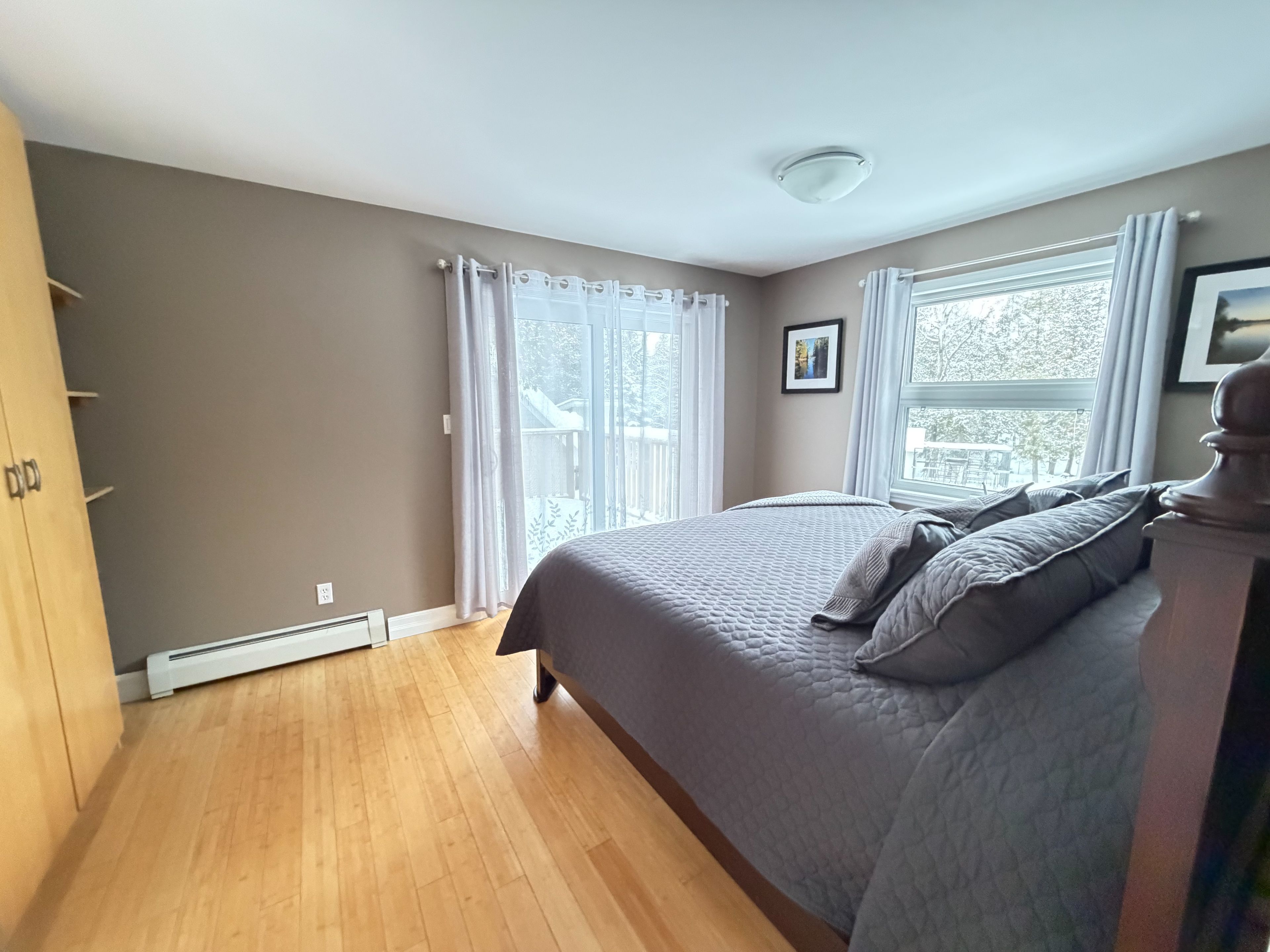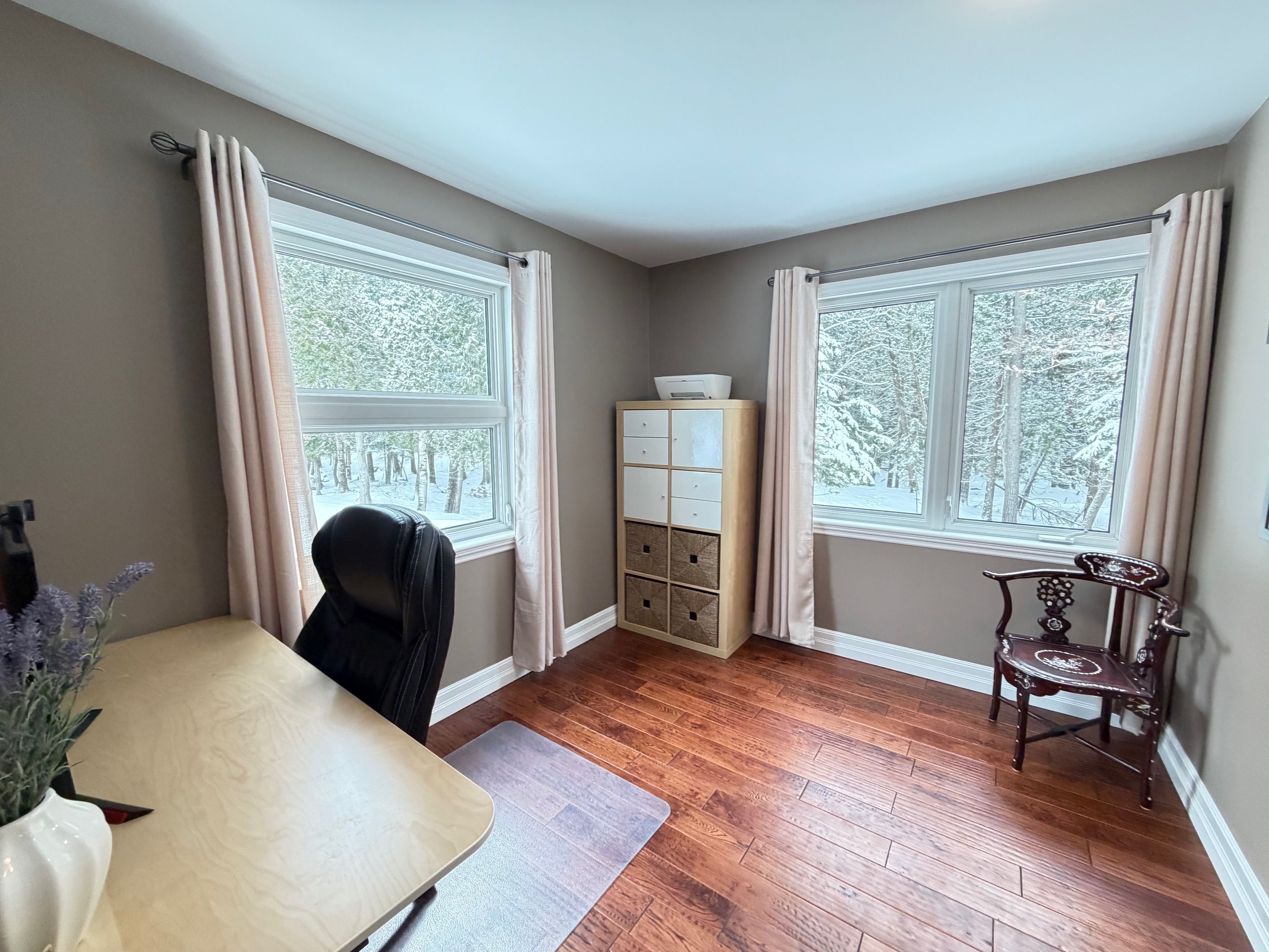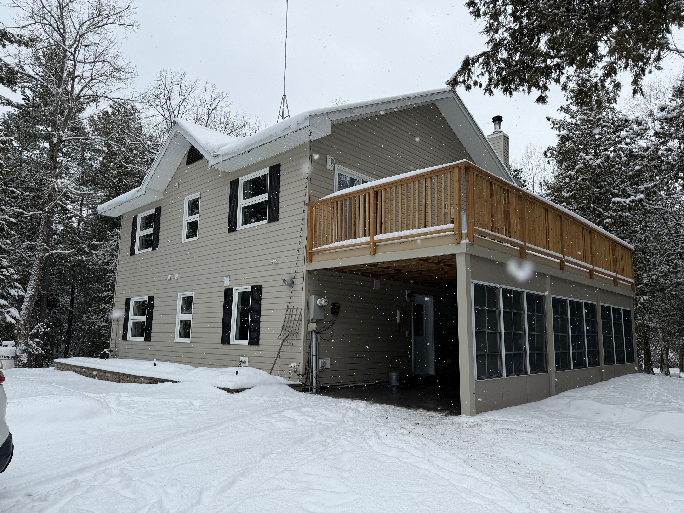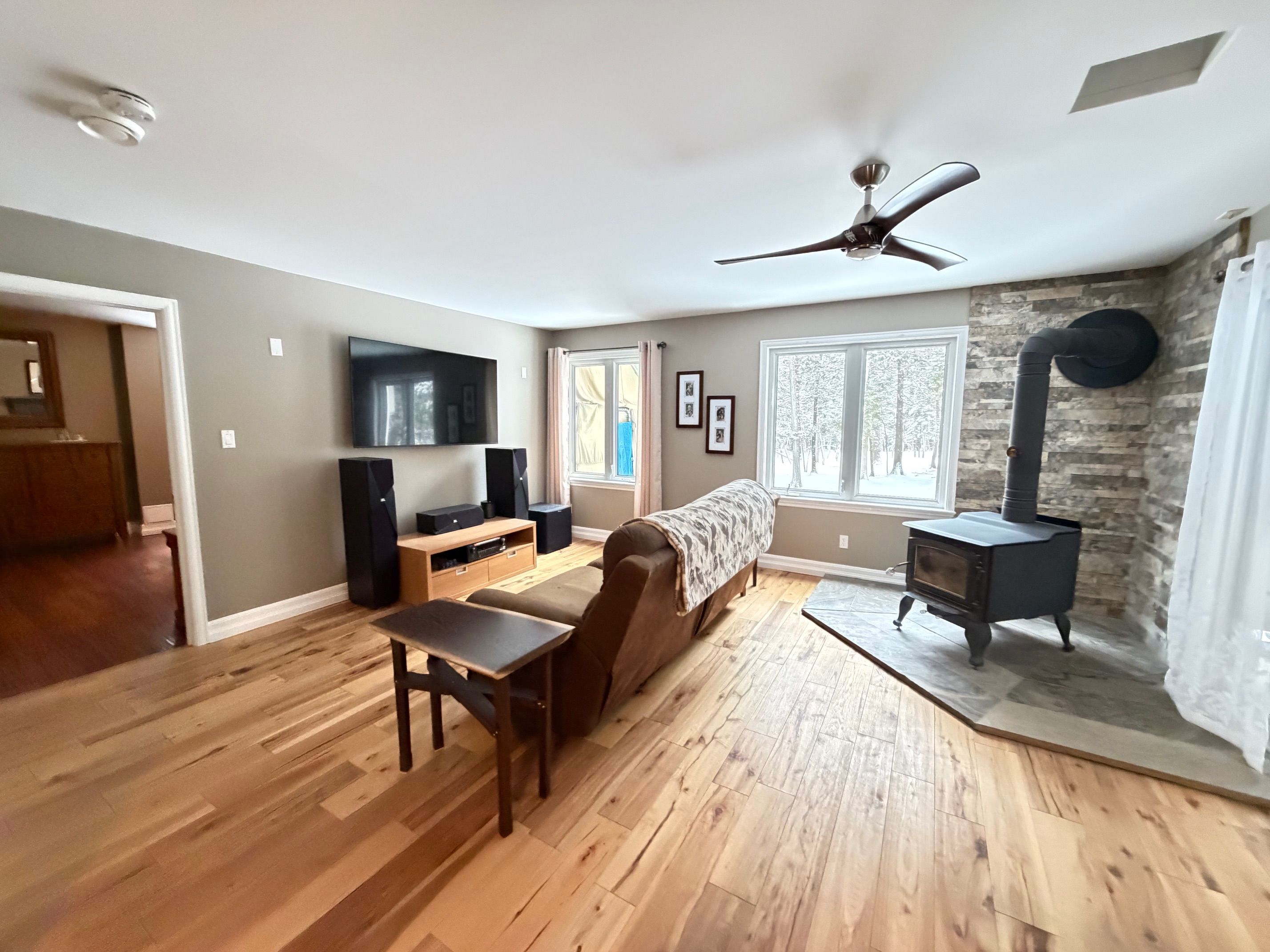 This distinctive two-storey residence is set on 11. 30 private acres, surrounded by mature trees that provide exceptional privacy and a tranquil natural setting. The property features an attached carport and a two-car detached insulated and heated garage with loft space currently used as a gym and workshop, along with a woodshed, storage shed, and greenhouse. The main level offers a family room, a primary bedroom with walk-in closet and walkout to the backyard, a den, and a four-piece bathroom. The upper level serves as the principal living space, featuring a bright open-concept layout with kitchen, living area, two bedrooms, a four-piece bathroom, and a spacious 30' x 12' deck overlooking the grounds. Interior finishes include hardwood and tile flooring, modern décor, hot water radiant heating, and a wood stove. Numerous updates have been completed, including interior painting (2026), windows (2025), upper deck (2025), steel roof (2020), boiler and water heater (2021), granite countertops (2019), wood stairs (2020), and wood stove (2019). Additional structures include a sunroom (12' x 10'), carport (11'7" x 21'6", 2016), two-car garage with loft (28' x 25', 2011), woodshed (16' x 16', 2012), and garden shed (8' x 8', 2012). Walking trails through morris island conservation area right across the road. Also the atv and snowmobile trails that cross the ottawa river to quebec is a short walk away. This property is well suited for buyers seeking privacy, versatility, and a peaceful wooded environment.