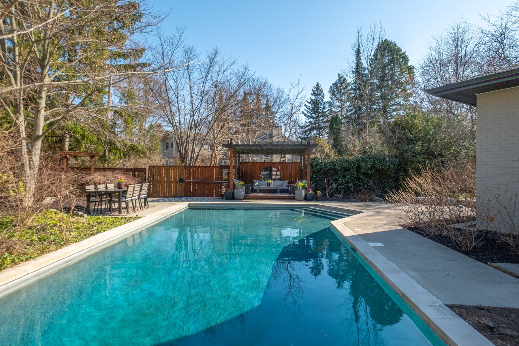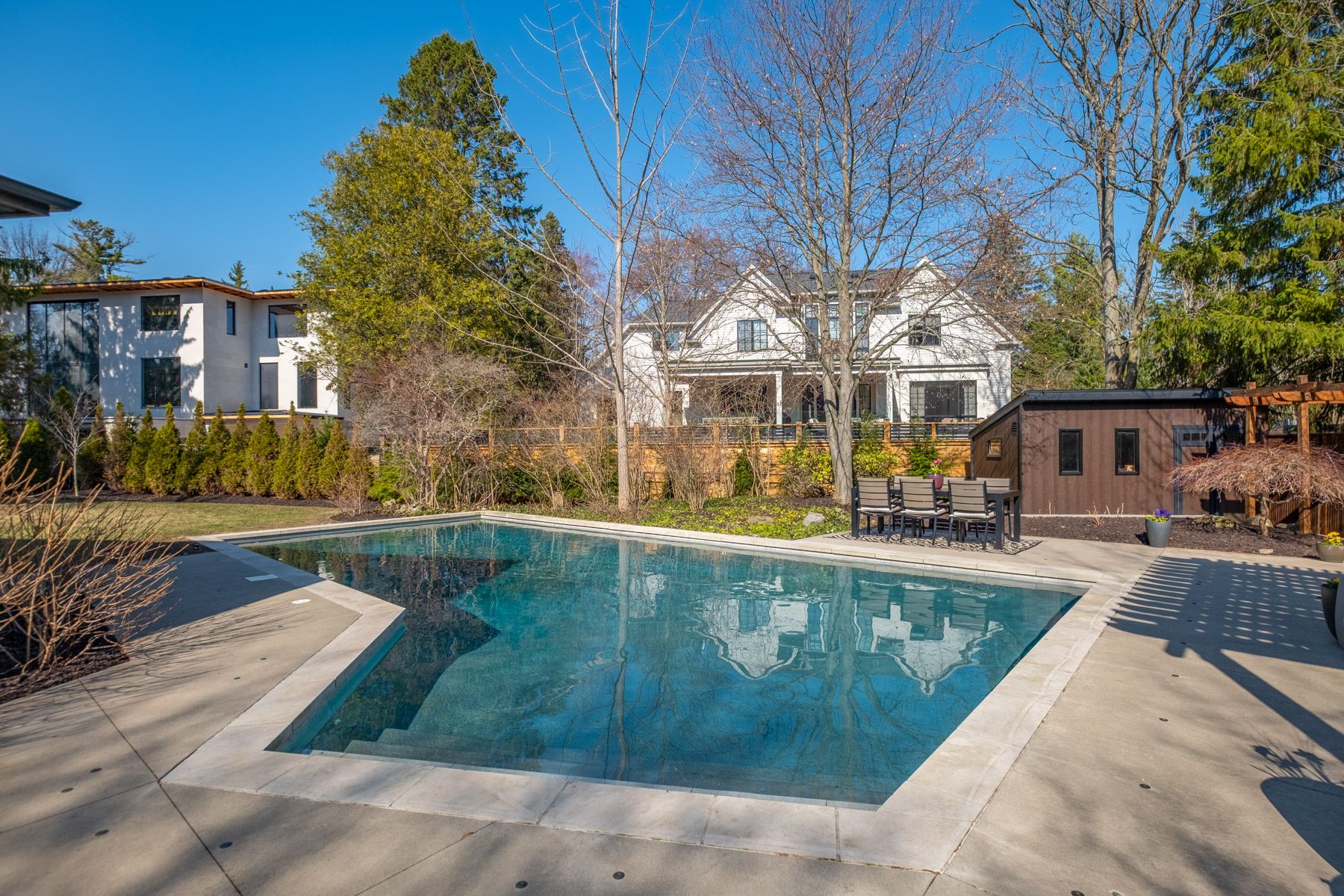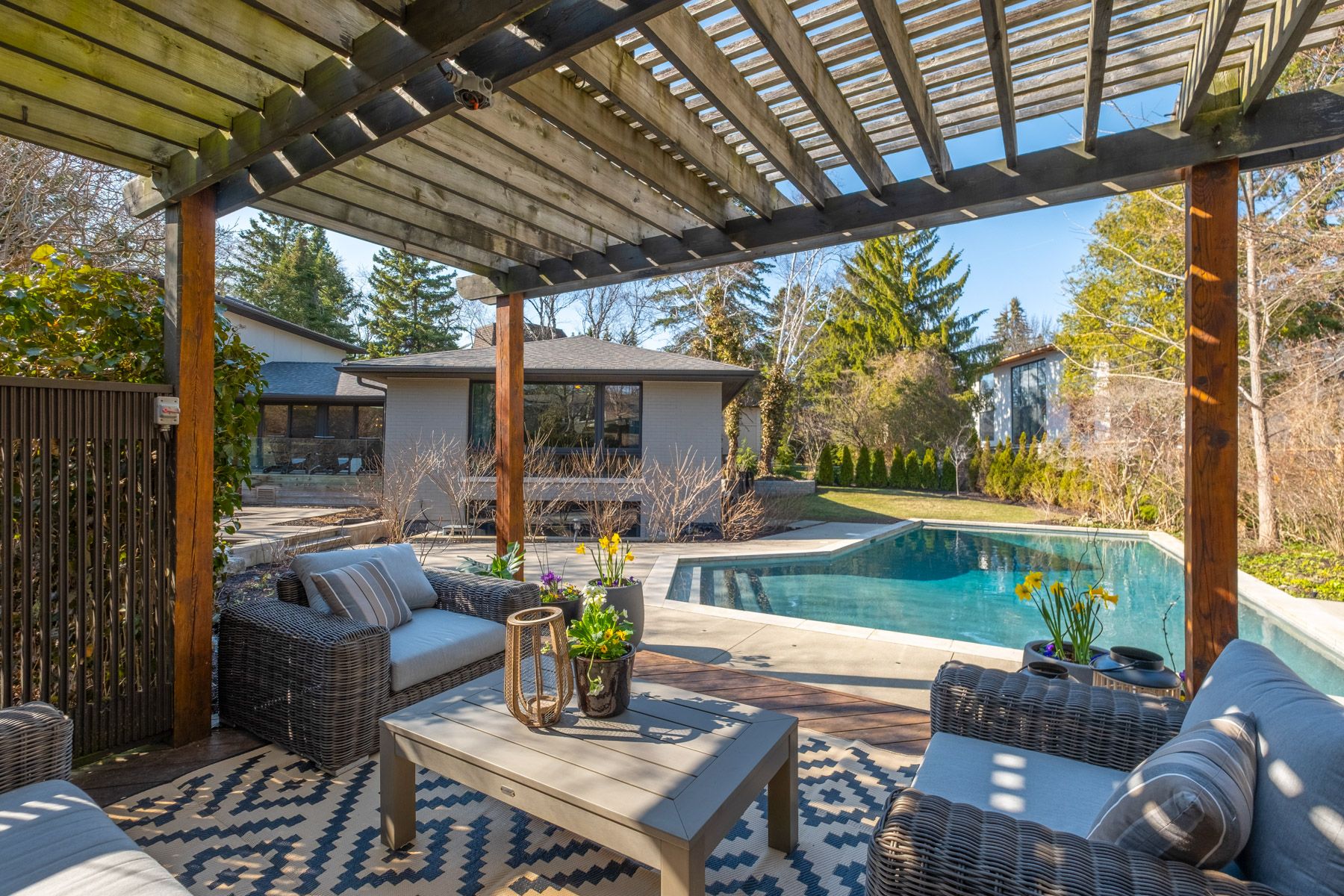 • Expansive outdoor space featuring a pool, pergola, and dining area.