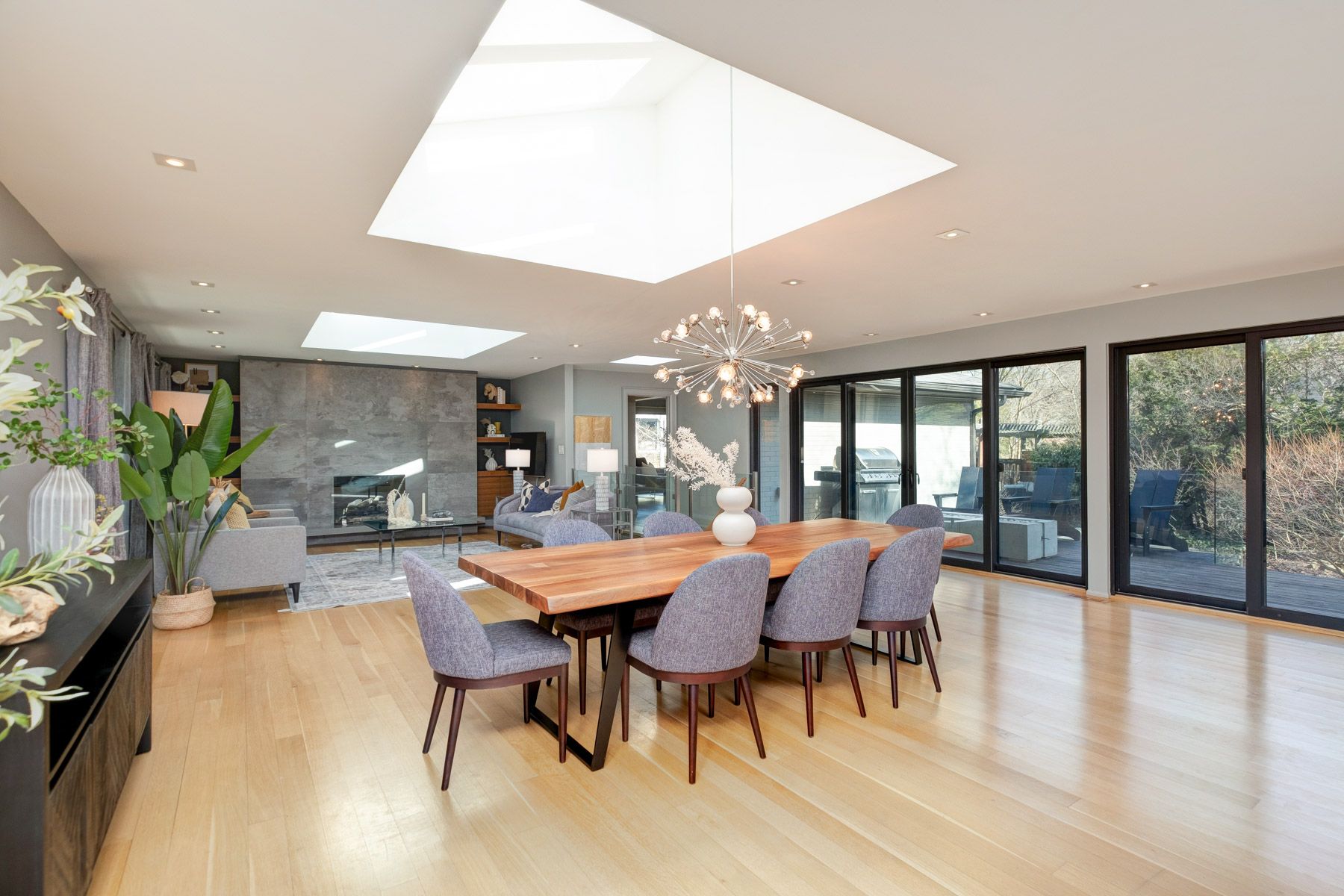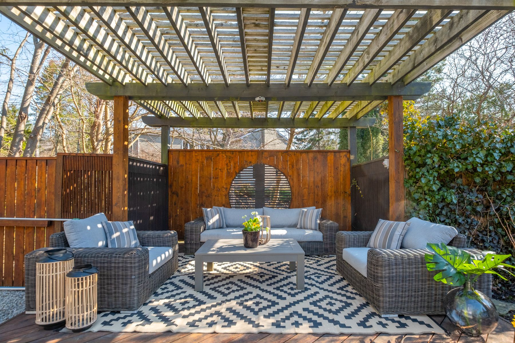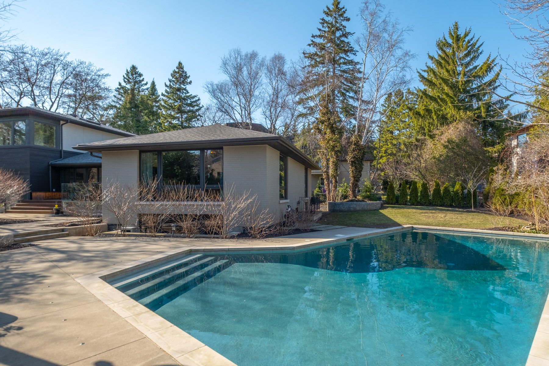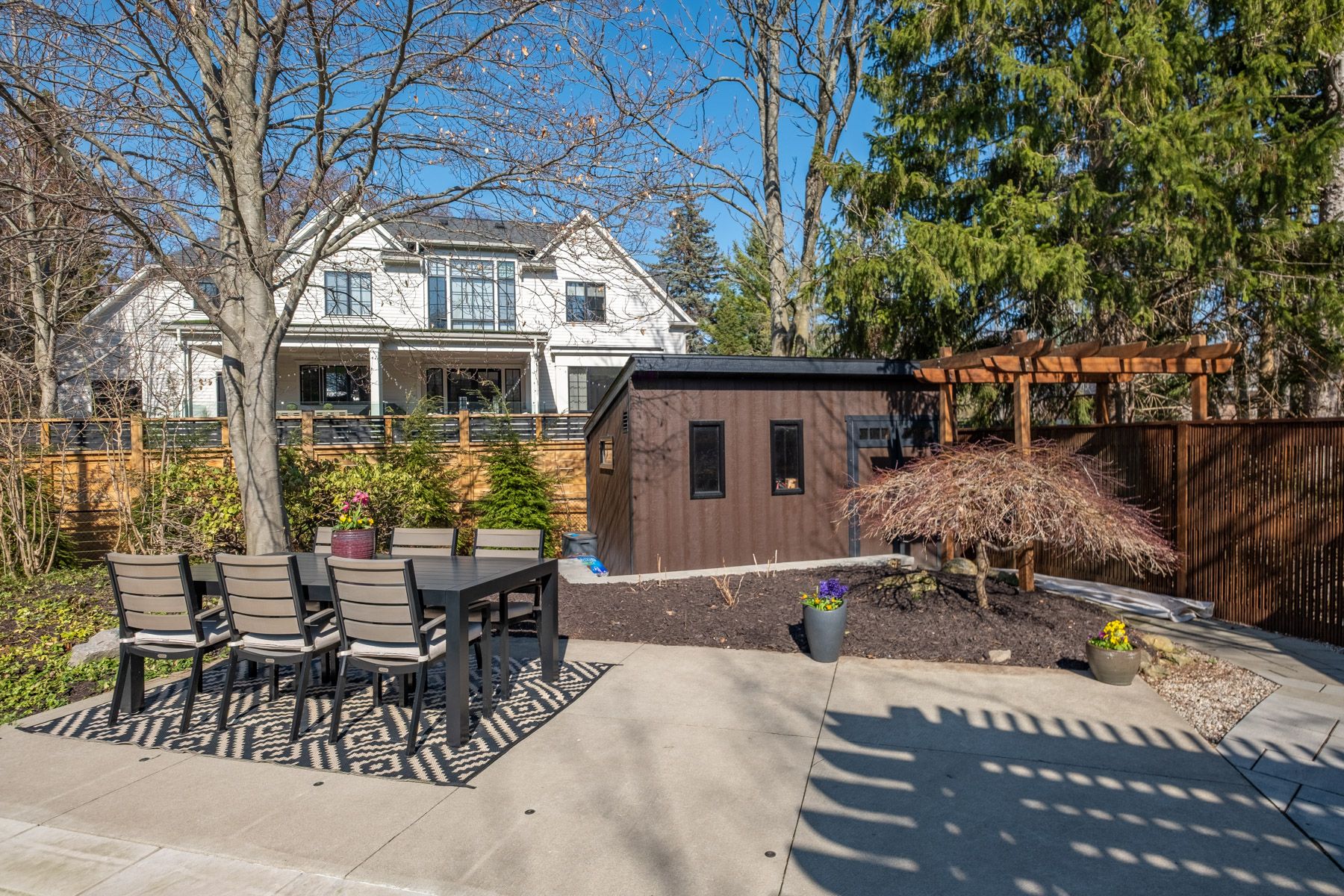 • Expansive outdoor space featuring a pool, pergola, and dining area.