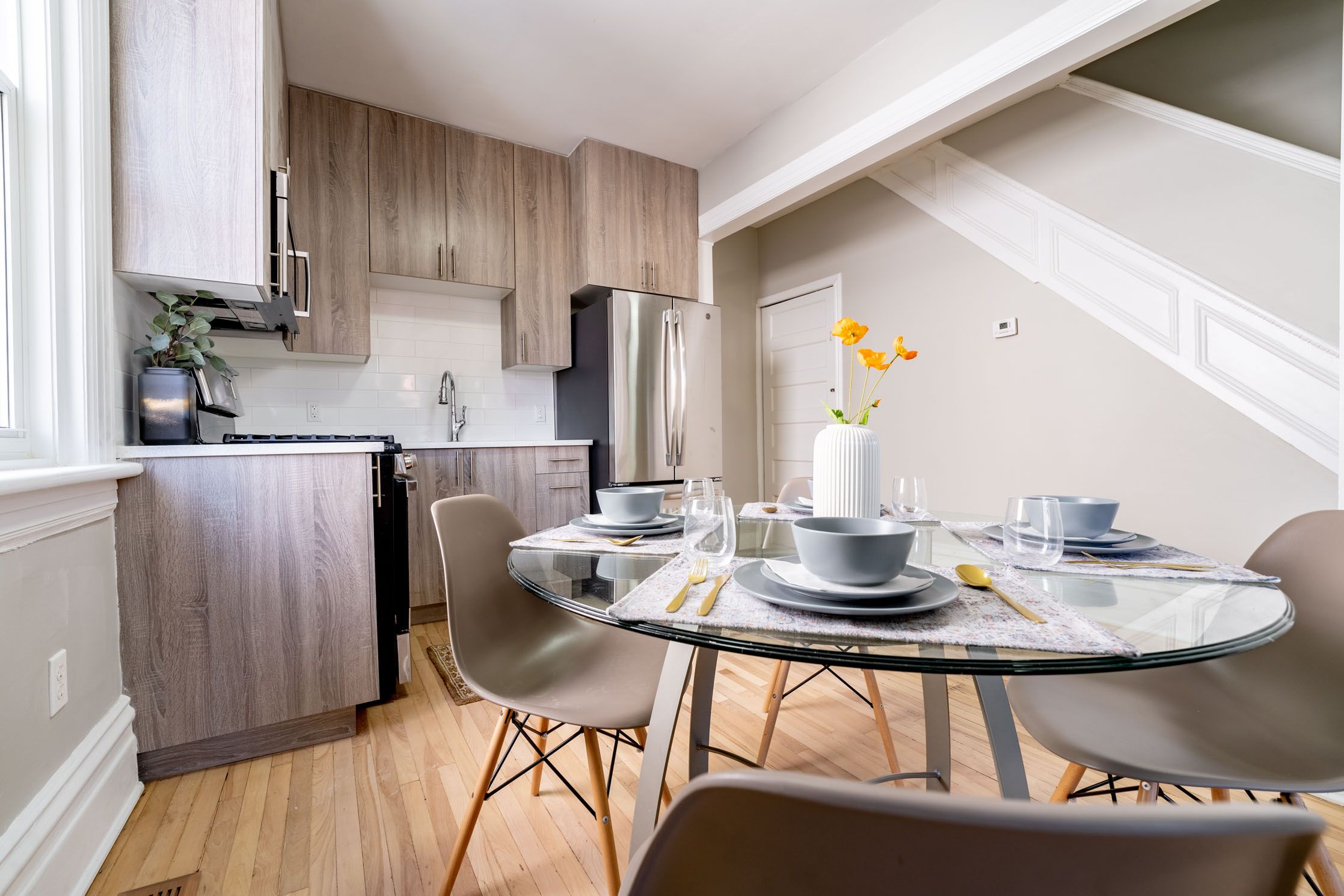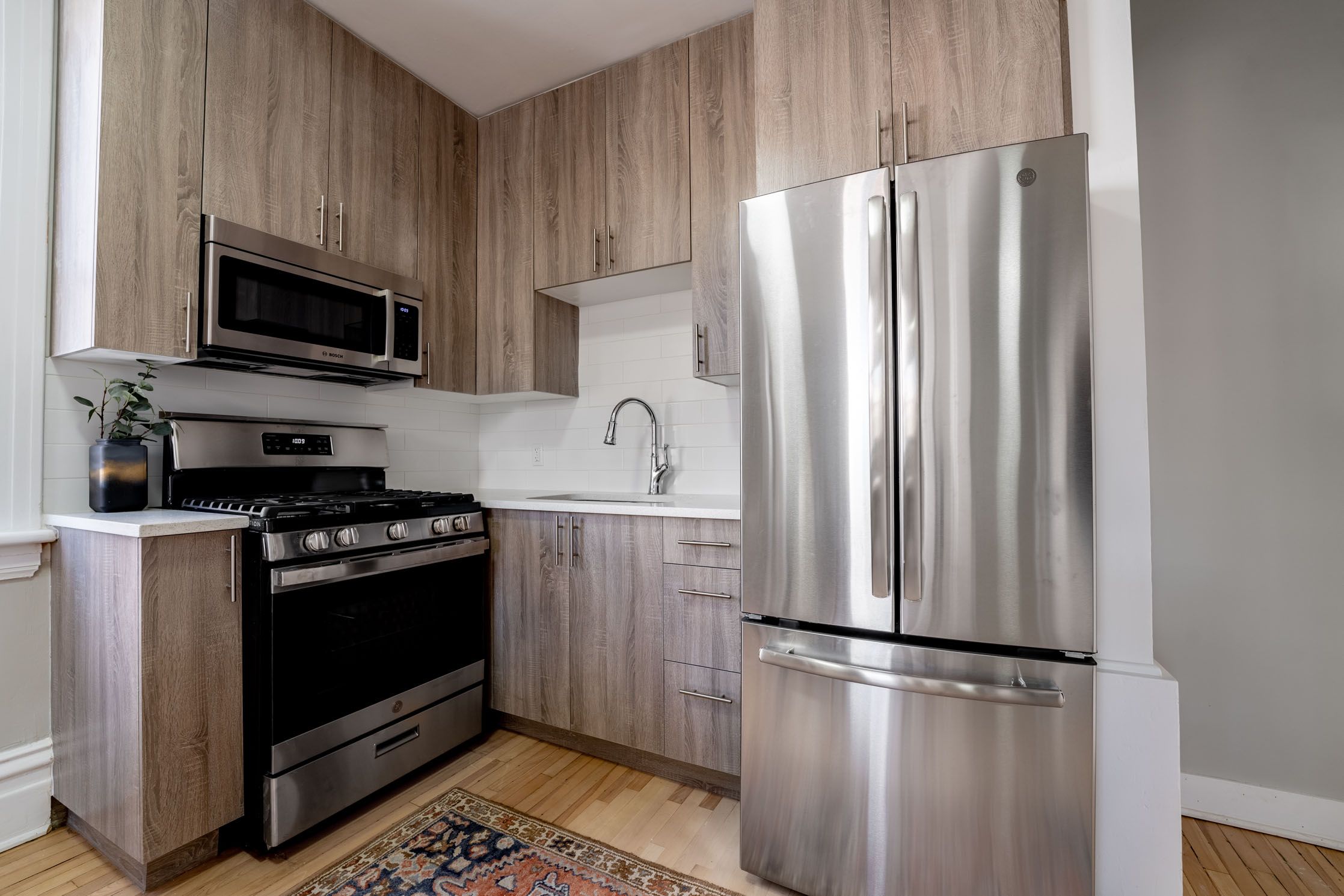 • Modern kitchen equipped with quartz counters and stainless steel appliances.