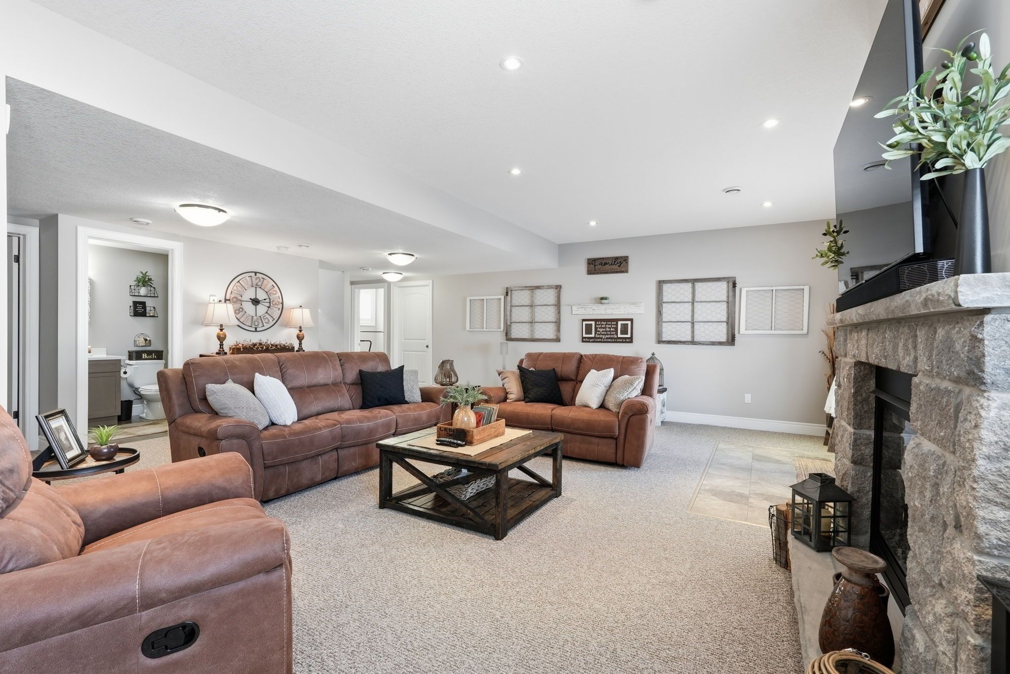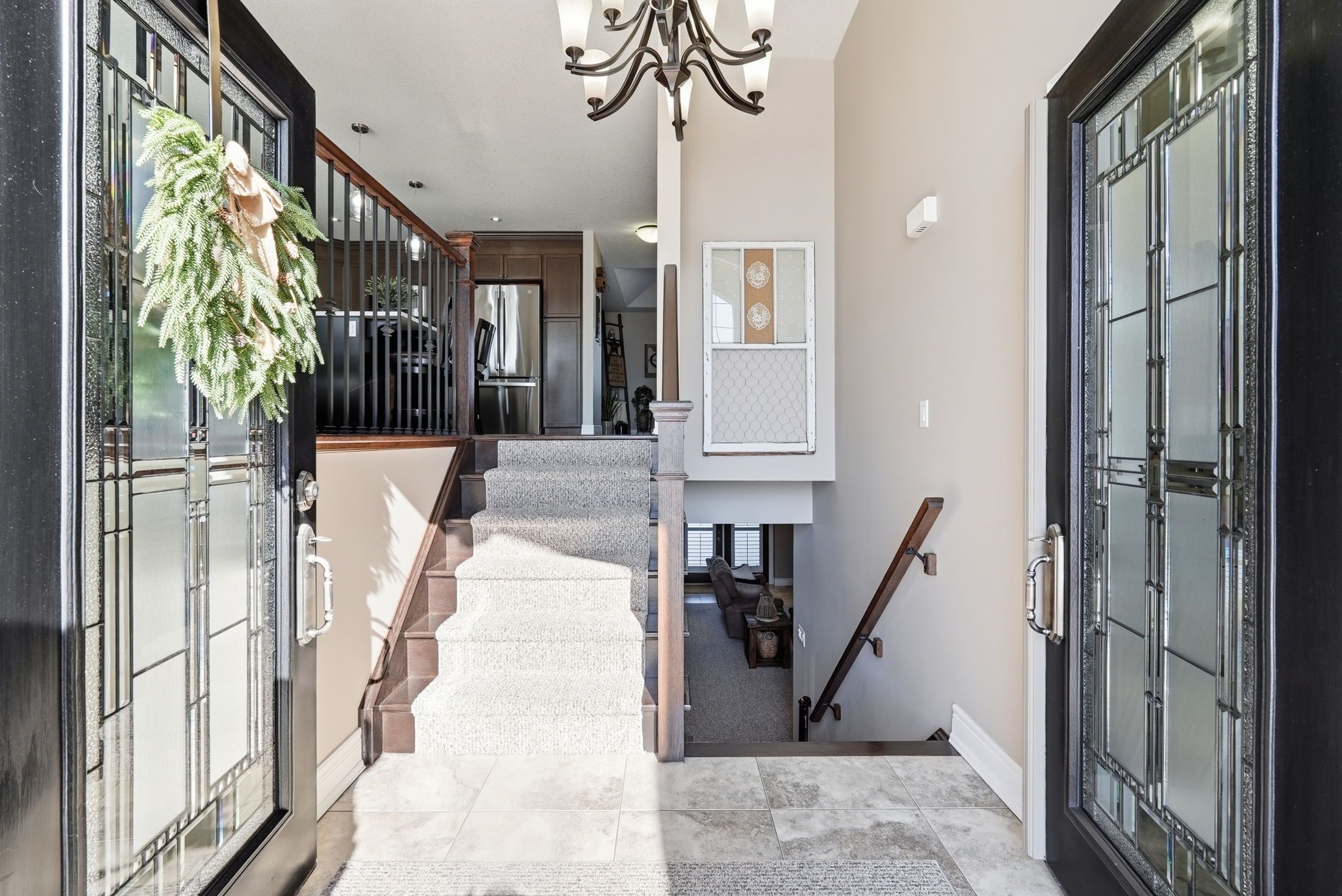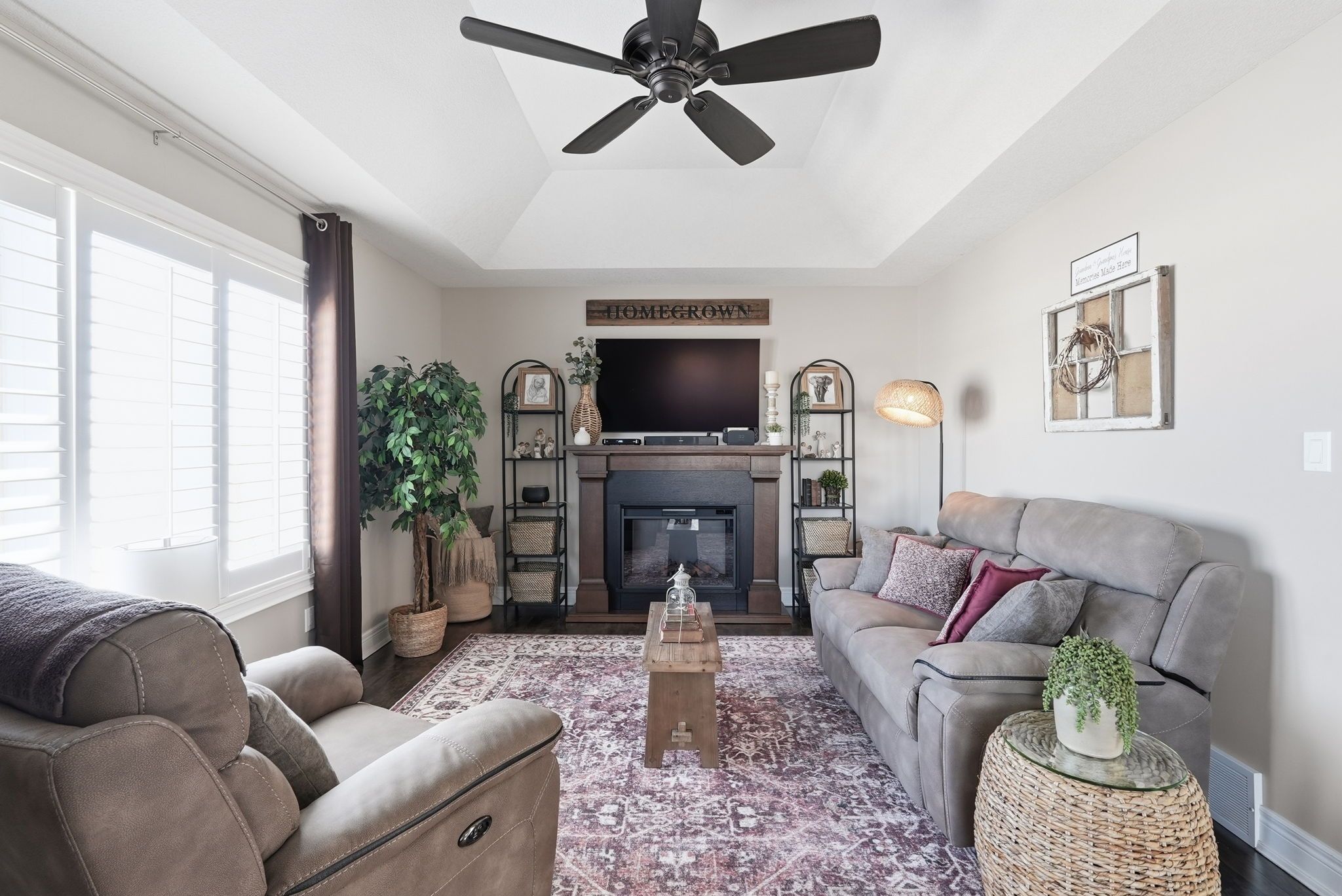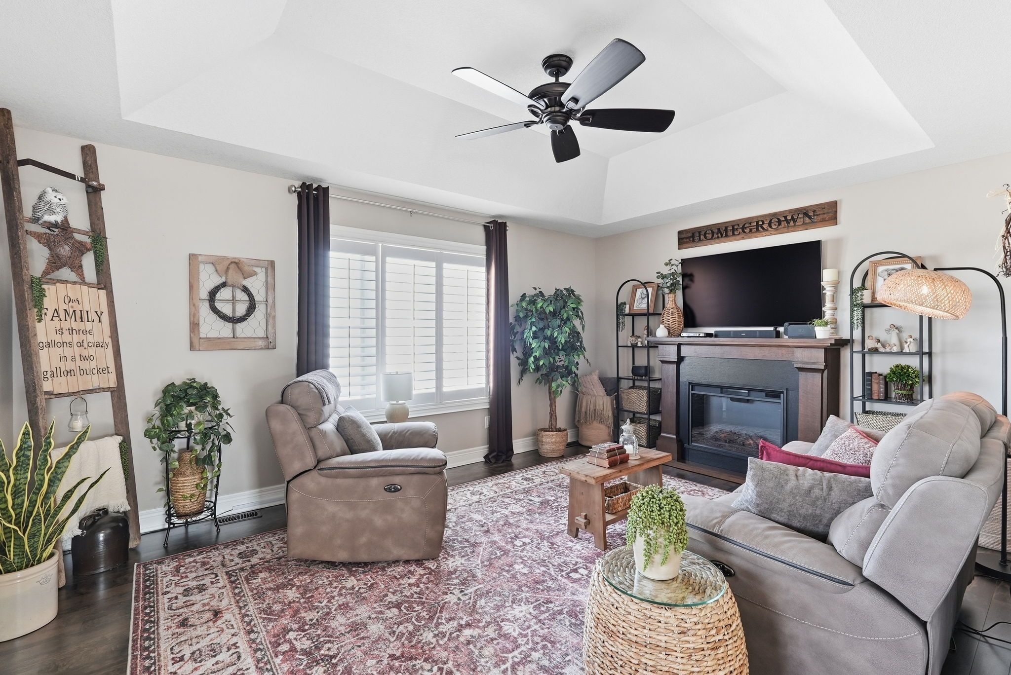 Tucked into a quiet, family-friendly crescent, this beautifully maintained raised bungalow offers the perfect blend of privacy and peaceful country views. Backing onto open farm fields, you'll wake up to picture-perfect sunrises and wide-open skies right from your own backyard. The thoughtfully designed main level features two spacious bedrooms and two full bathrooms, including a spa-like ensuite that creates a true retreat within the primary suite. Entertaining is easy, with a spacious eat-in kitchen with quartz countertops (2024). Just off the living room, a covered back deck provides the ideal setting for morning coffee or relaxed evenings overlooking the fields. The fully finished walk-out basement adds exceptional living space with two additional bedrooms, a third full bath, and a generous recreation room warmed by a cozy gas fireplace - creating an inviting atmosphere for family movie nights or relaxed evenings in. Step outside to the hot tub and enjoy the privacy and tranquility that only a field-side lot can offer. Complete with a double car garage, this home combines comfort, functionality, and scenic surroundings in one inviting package. Recent updates include refinished maple hardwood flooring on main level (2025), hot water tank (2024), carpets (2023 & 2025), washer and dryer (2021), dishwasher and fridge (2024), stove (2021)