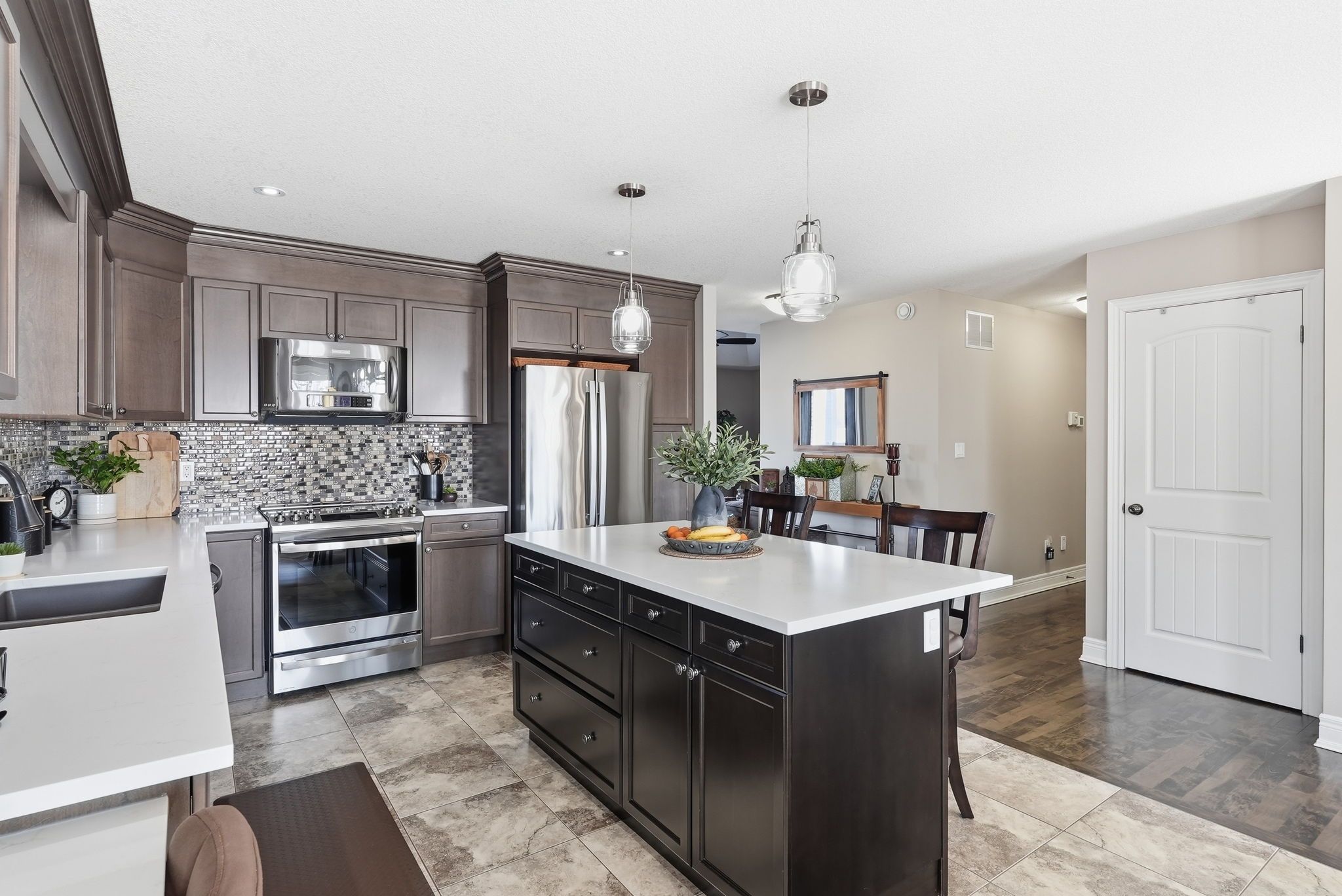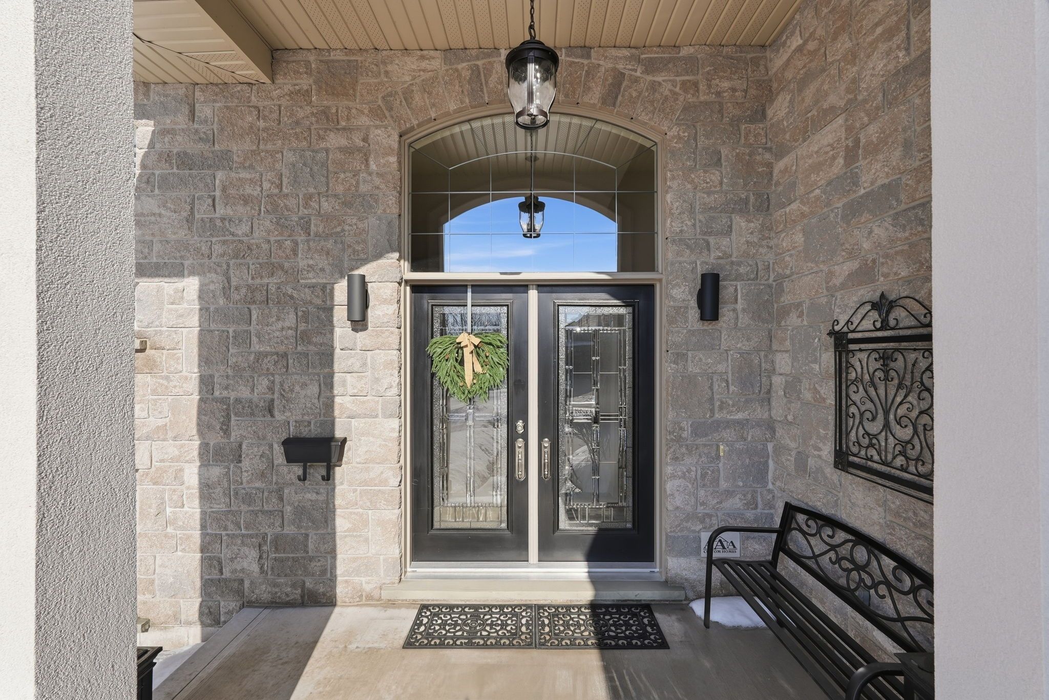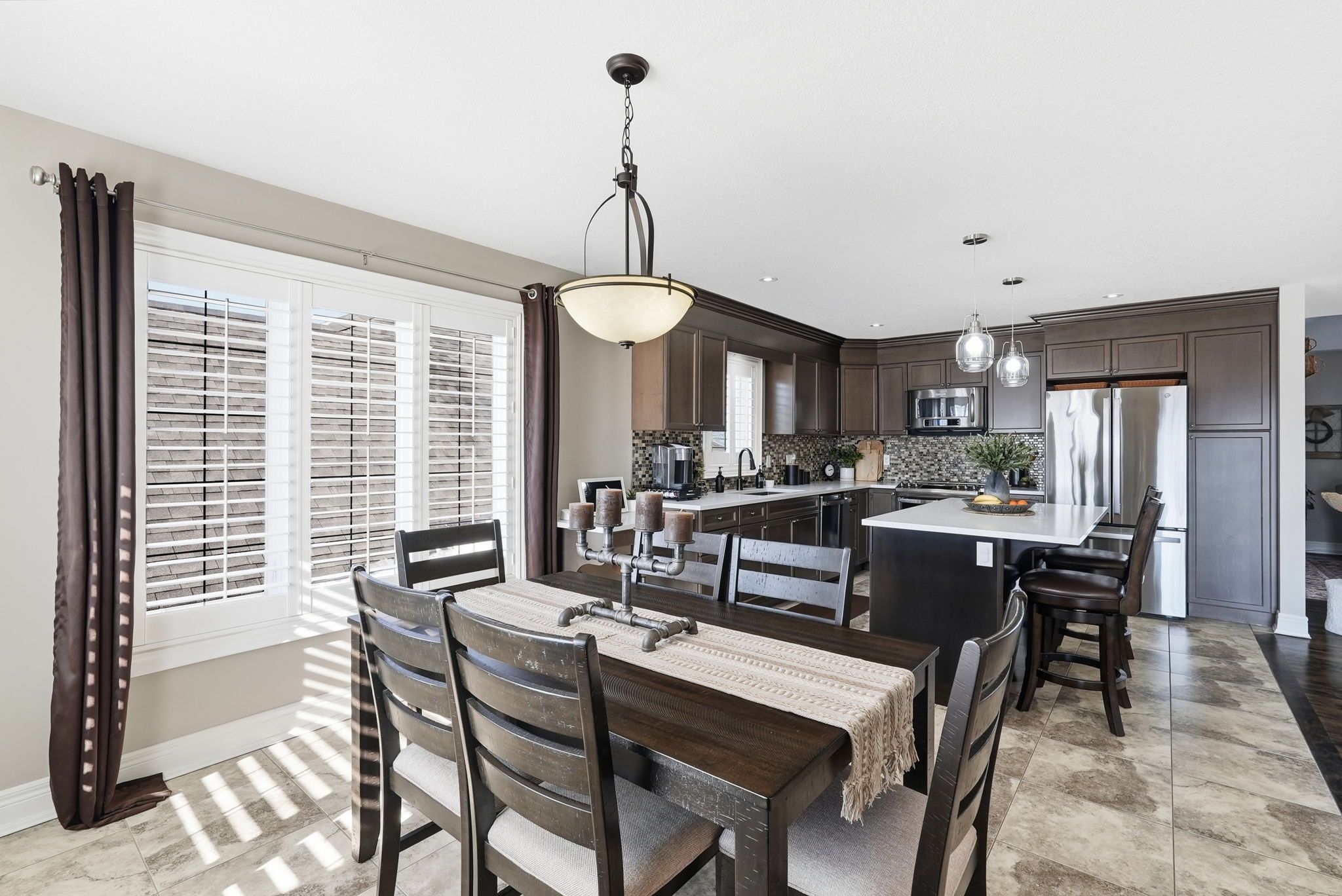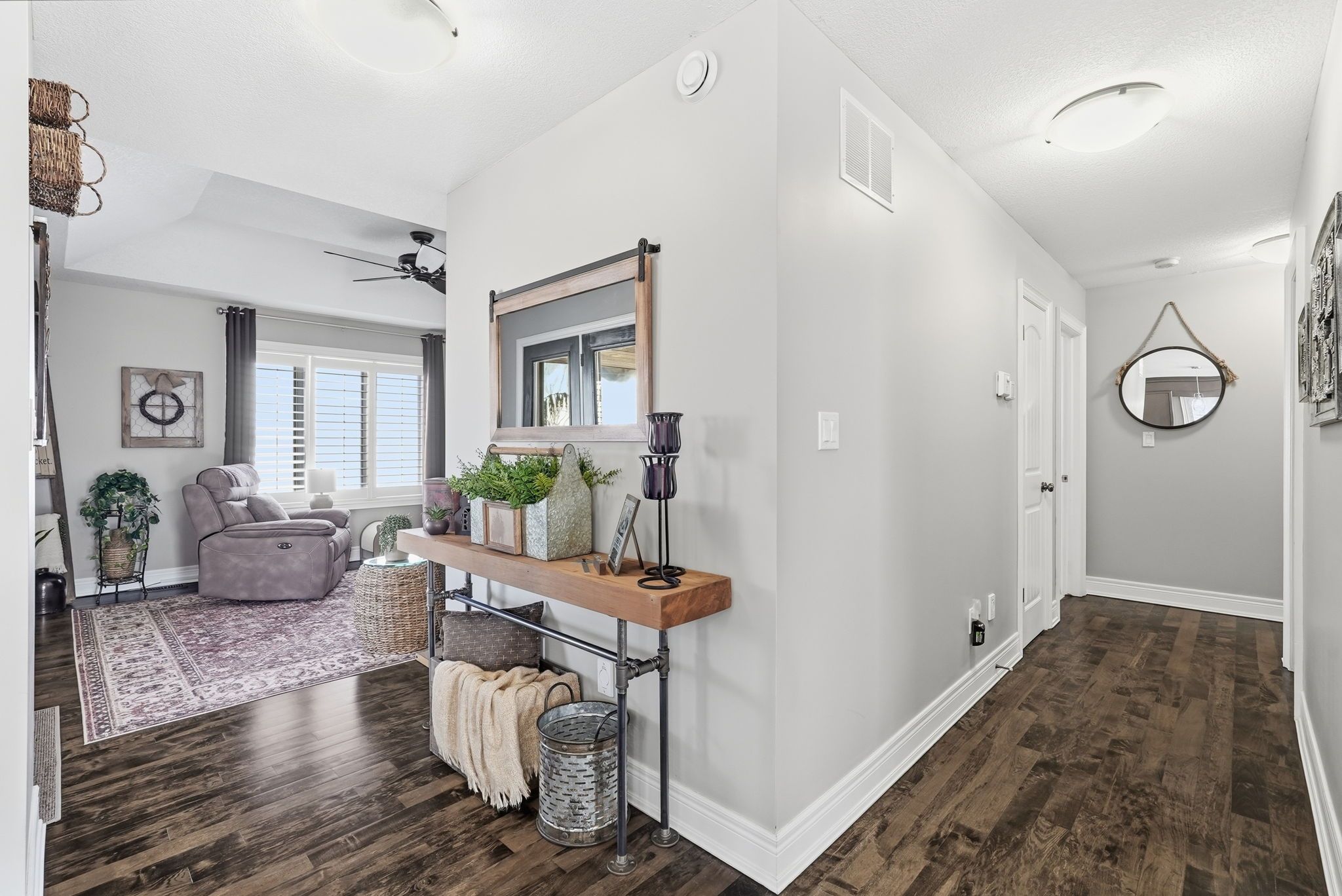 Tucked into a quiet, family-friendly crescent, this beautifully maintained raised bungalow offers the perfect blend of privacy and peaceful country views. Backing onto open farm fields, you'll wake up to picture-perfect sunrises and wide-open skies right from your own backyard. The thoughtfully designed main level features two spacious bedrooms and two full bathrooms, including a spa-like ensuite that creates a true retreat within the primary suite. Entertaining is easy, with a spacious eat-in kitchen with quartz countertops (2024). Just off the living room, a covered back deck provides the ideal setting for morning coffee or relaxed evenings overlooking the fields. The fully finished walk-out basement adds exceptional living space with two additional bedrooms, a third full bath, and a generous recreation room warmed by a cozy gas fireplace - creating an inviting atmosphere for family movie nights or relaxed evenings in. Step outside to the hot tub and enjoy the privacy and tranquility that only a field-side lot can offer. Complete with a double car garage, this home combines comfort, functionality, and scenic surroundings in one inviting package. Recent updates include refinished maple hardwood flooring on main level (2025), hot water tank (2024), carpets (2023 & 2025), washer and dryer (2021), dishwasher and fridge (2024), stove (2021)