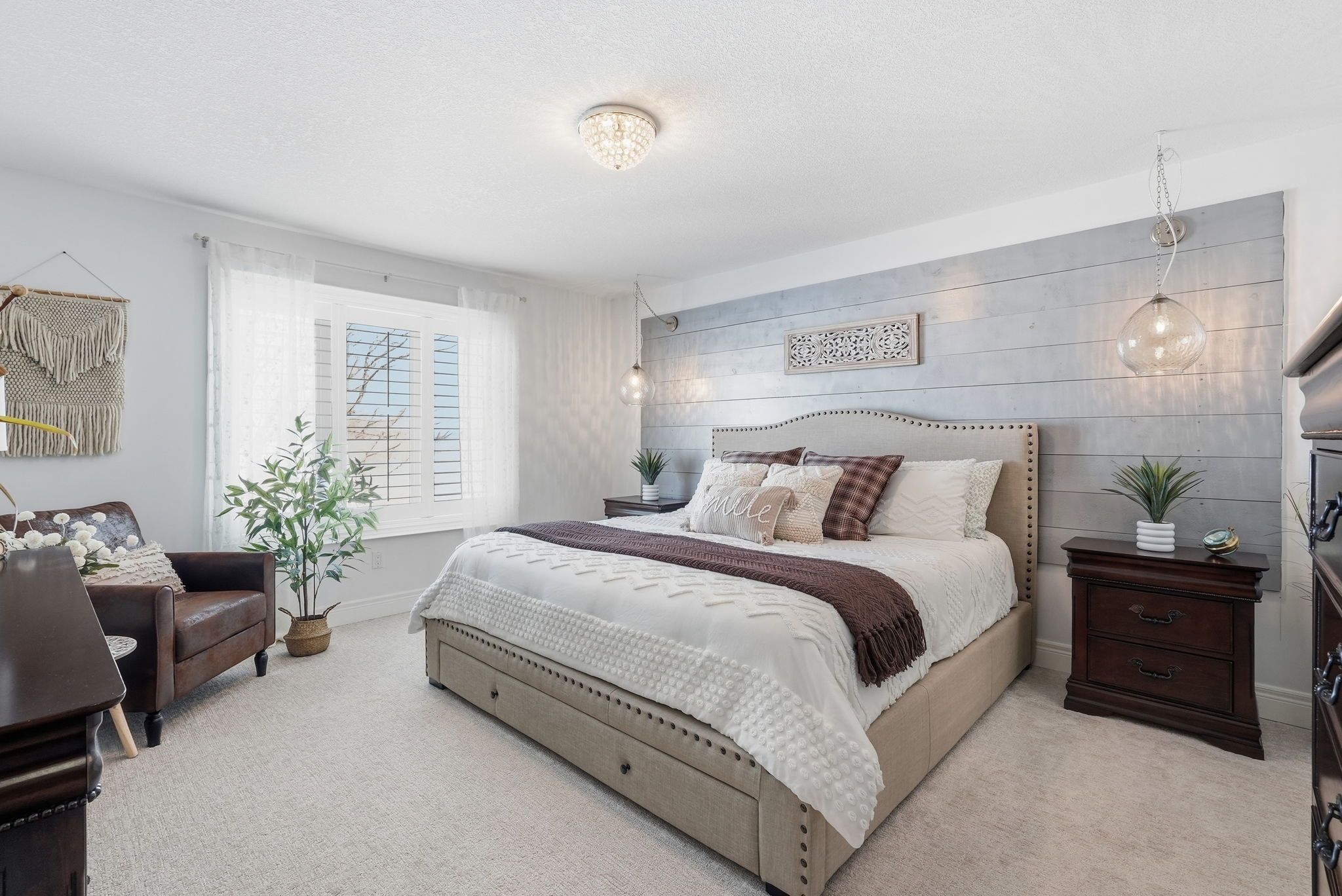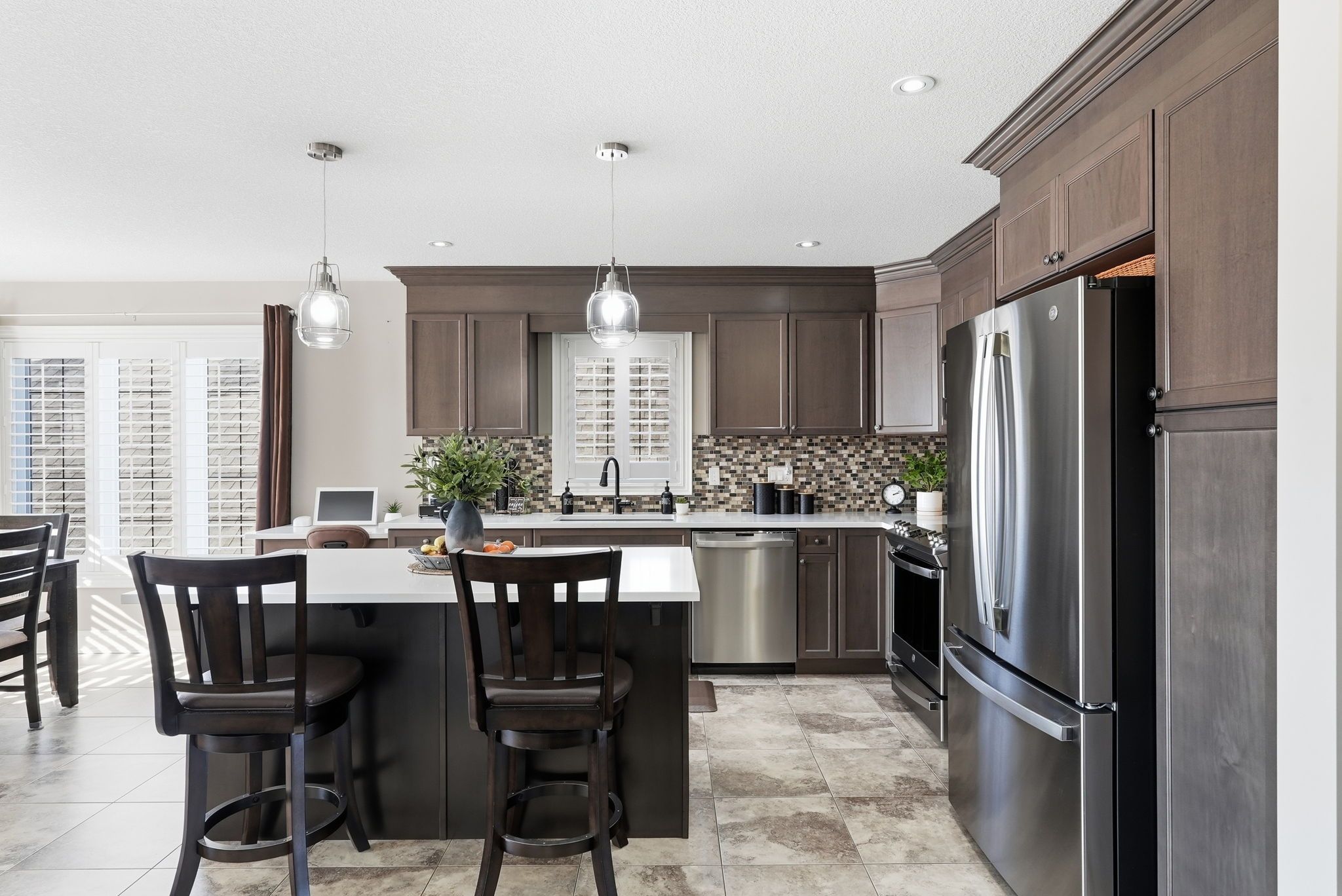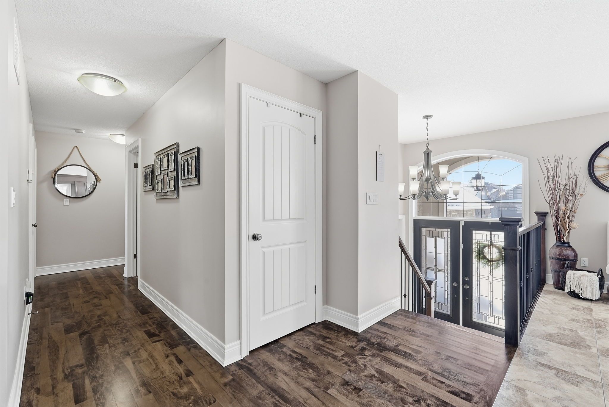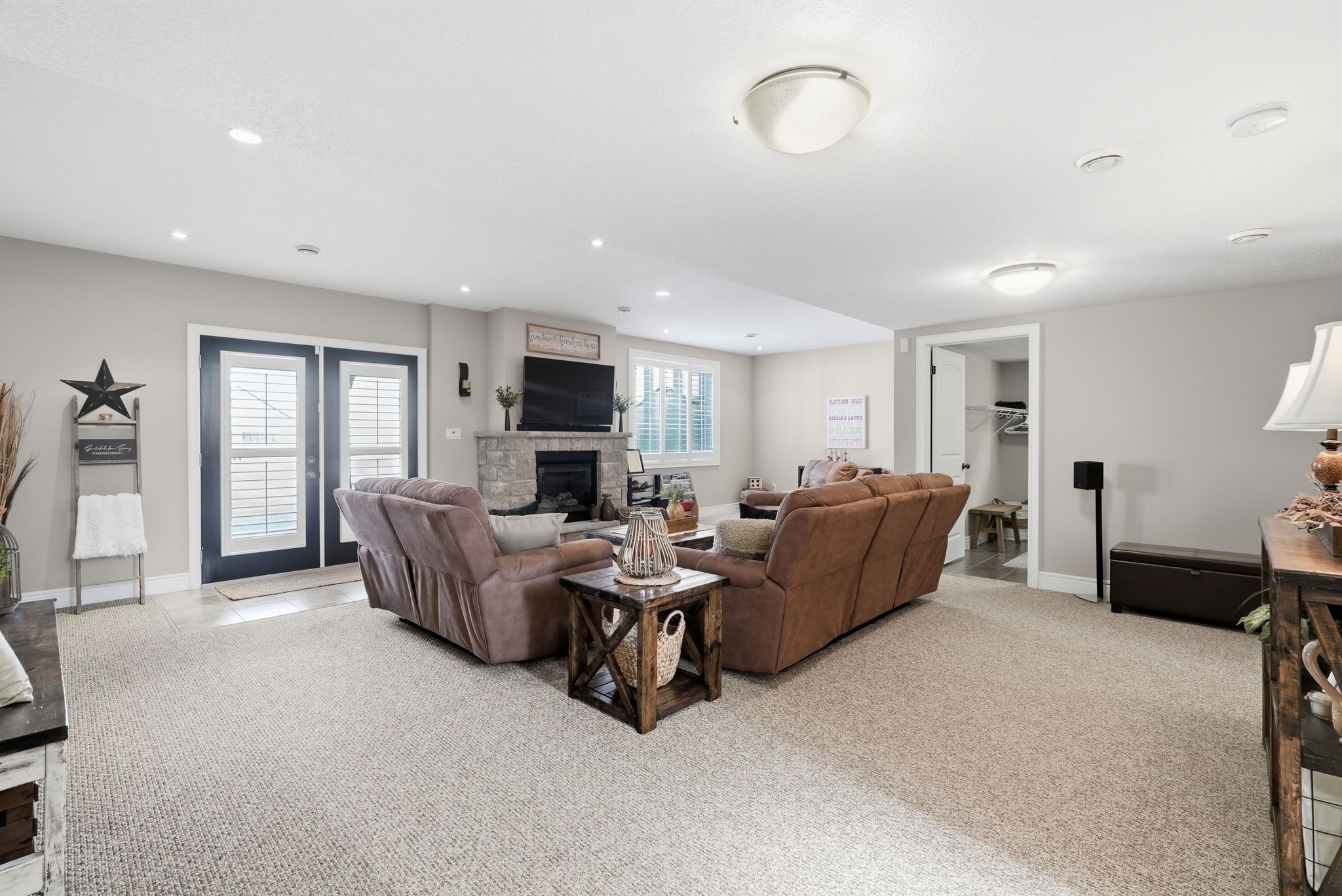 Tucked into a quiet, family-friendly crescent, this beautifully maintained raised bungalow offers the perfect blend of privacy and peaceful country views. Backing onto open farm fields, you'll wake up to picture-perfect sunrises and wide-open skies right from your own backyard. The thoughtfully designed main level features two spacious bedrooms and two full bathrooms, including a spa-like ensuite that creates a true retreat within the primary suite. Entertaining is easy, with a spacious eat-in kitchen with quartz countertops (2024). Just off the living room, a covered back deck provides the ideal setting for morning coffee or relaxed evenings overlooking the fields. The fully finished walk-out basement adds exceptional living space with two additional bedrooms, a third full bath, and a generous recreation room warmed by a cozy gas fireplace - creating an inviting atmosphere for family movie nights or relaxed evenings in. Step outside to the hot tub and enjoy the privacy and tranquility that only a field-side lot can offer. Complete with a double car garage, this home combines comfort, functionality, and scenic surroundings in one inviting package. Recent updates include refinished maple hardwood flooring on main level (2025), hot water tank (2024), carpets (2023 & 2025), washer and dryer (2021), dishwasher and fridge (2024), stove (2021)