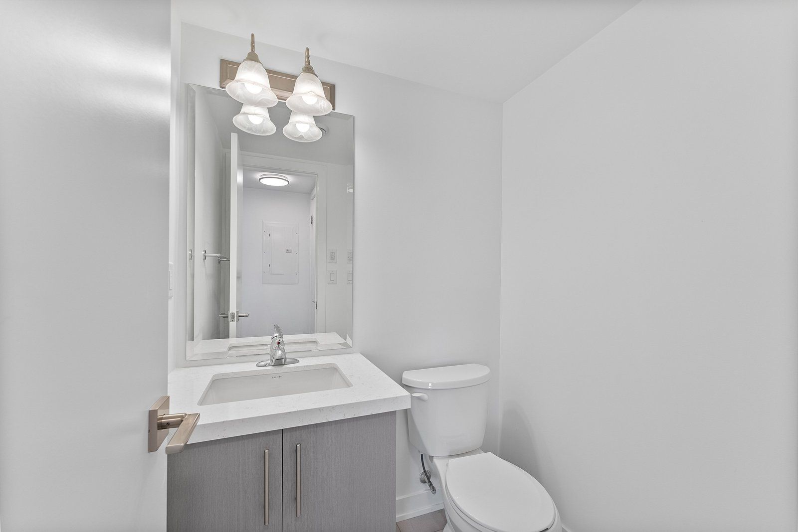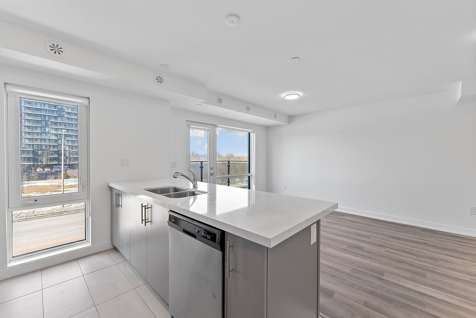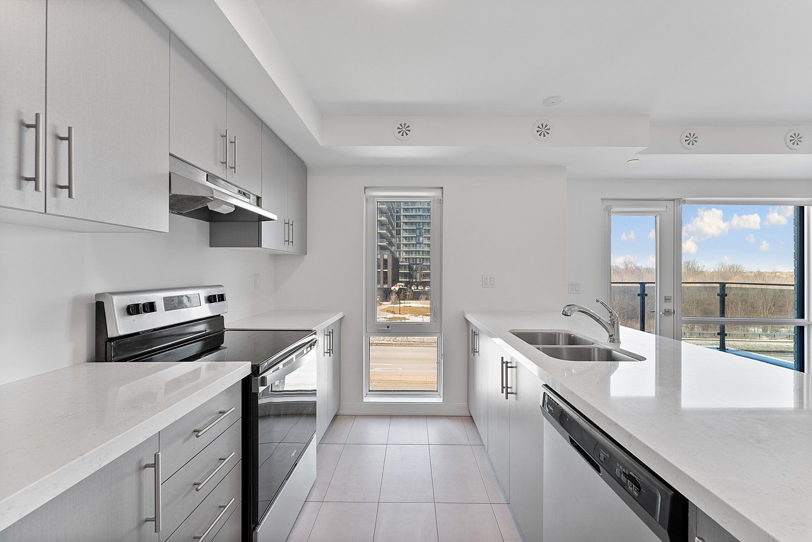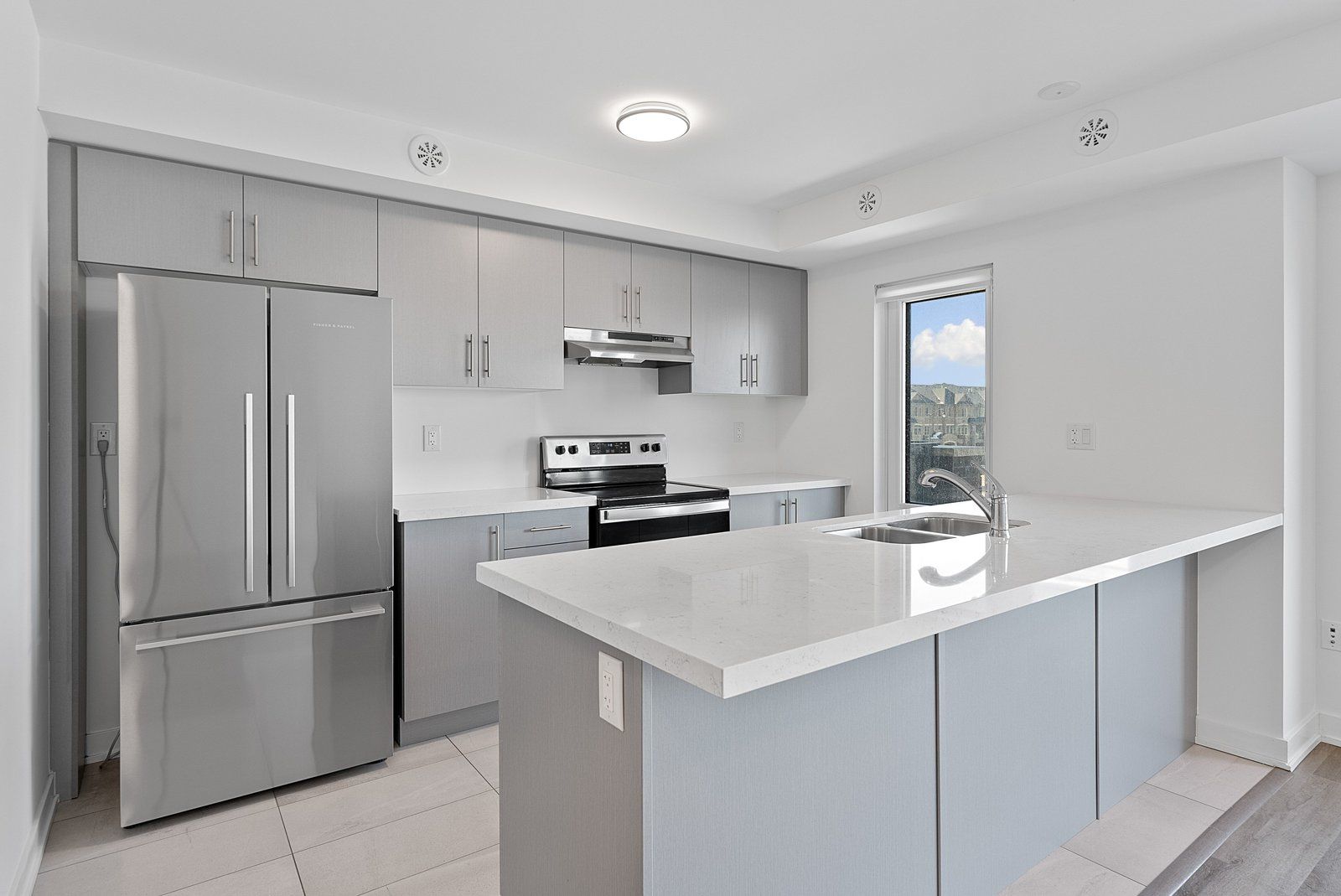• Contemporary kitchen with quartz countertops and stainless steel appliances.