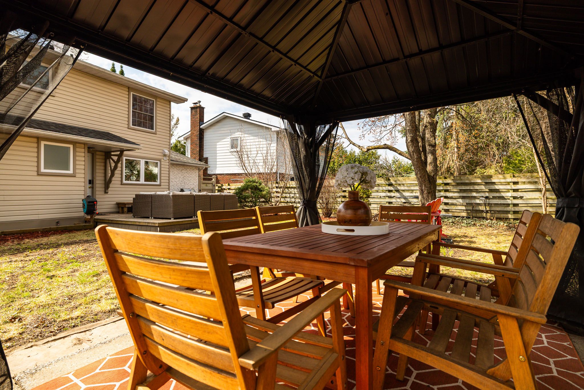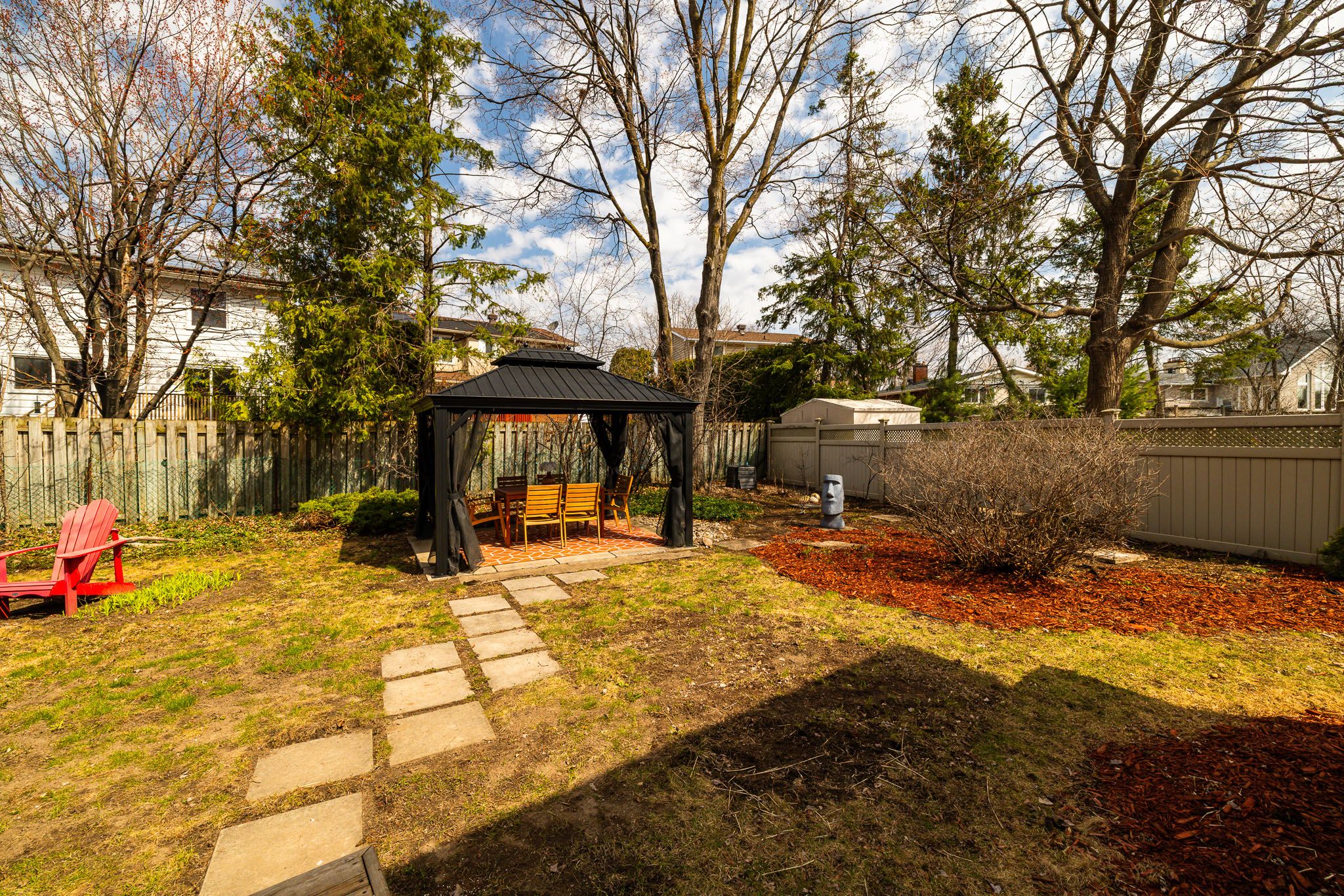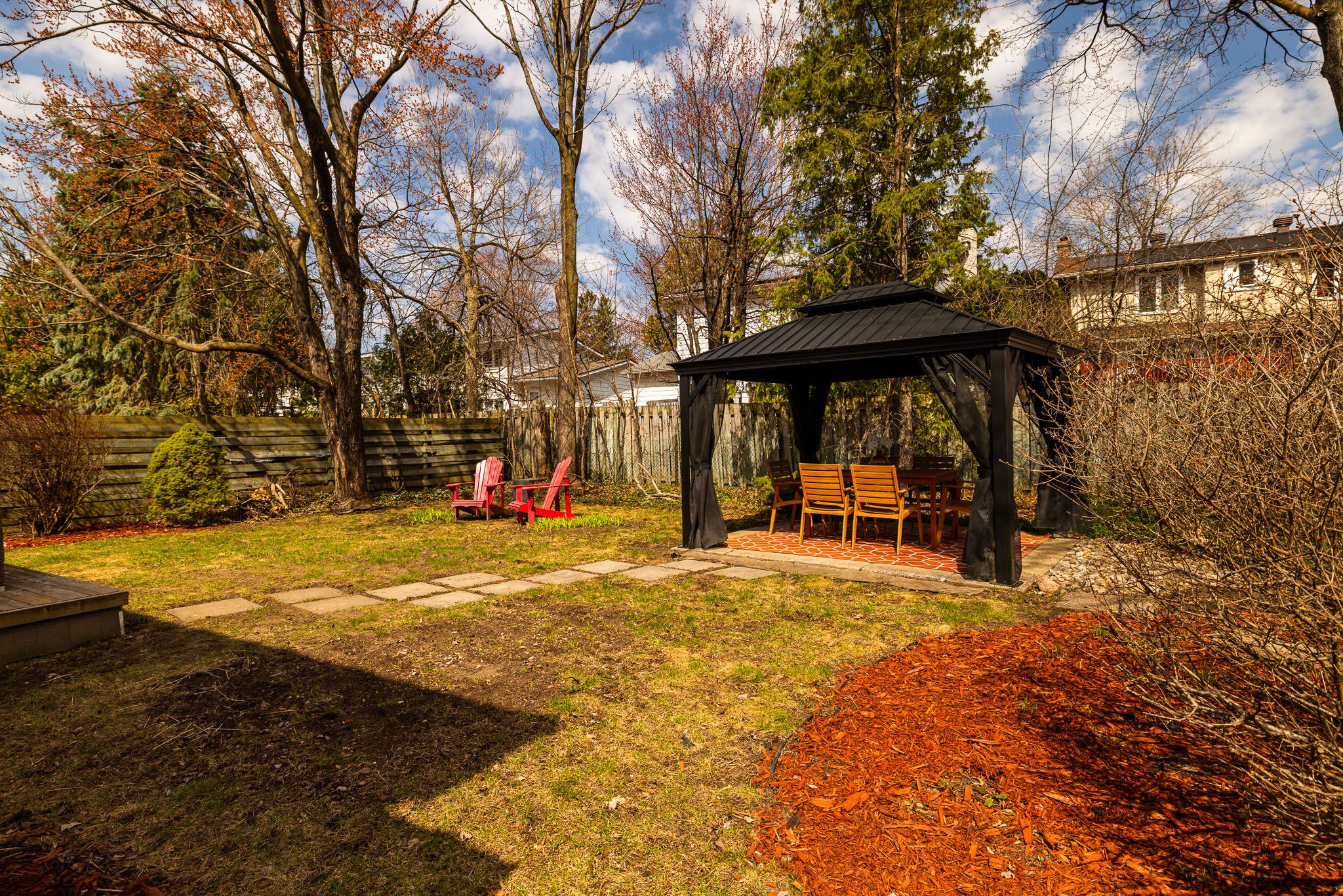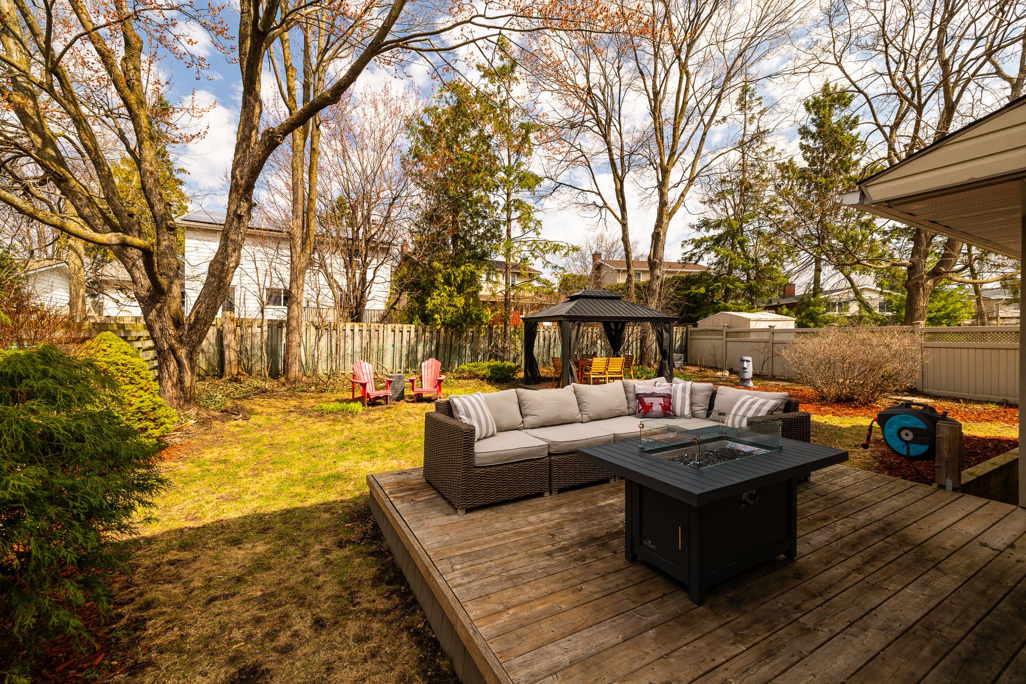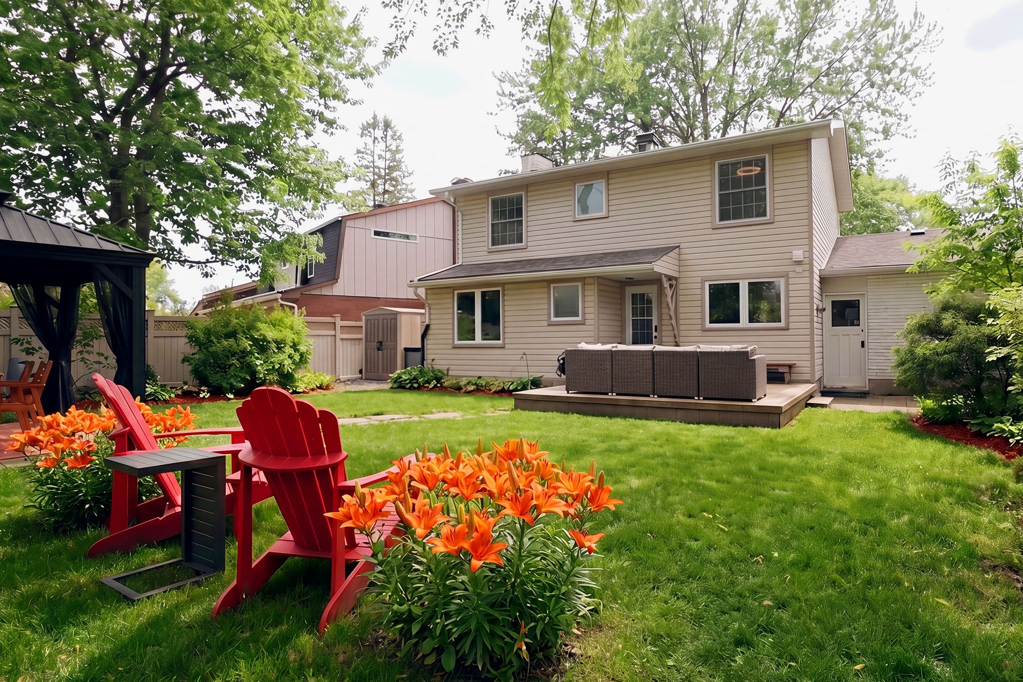 • Large landscaped backyard with deck and gazebo for outdoor enjoyment.