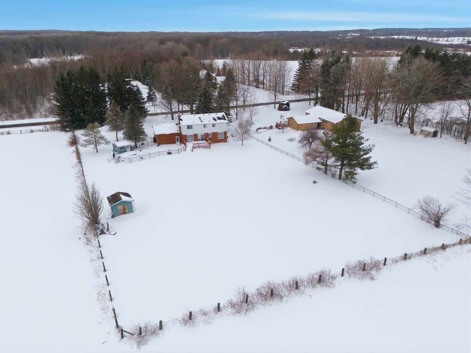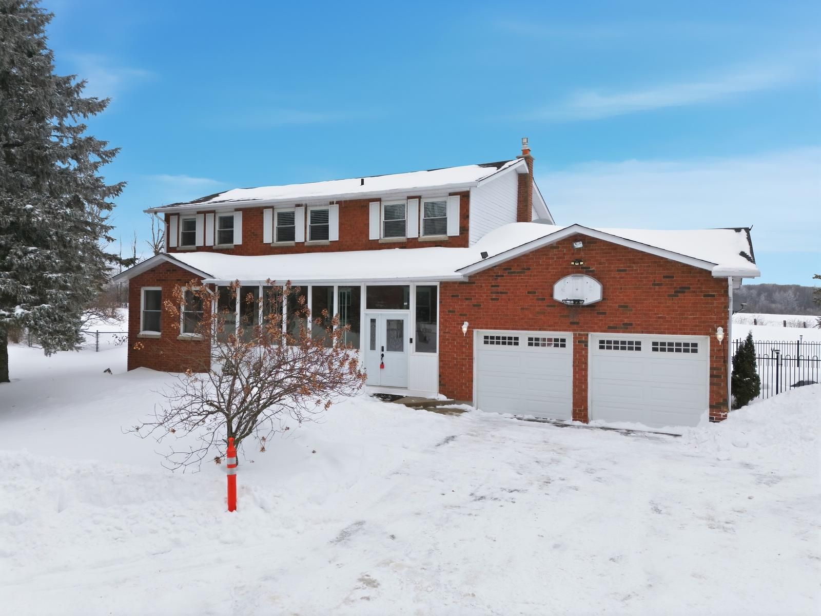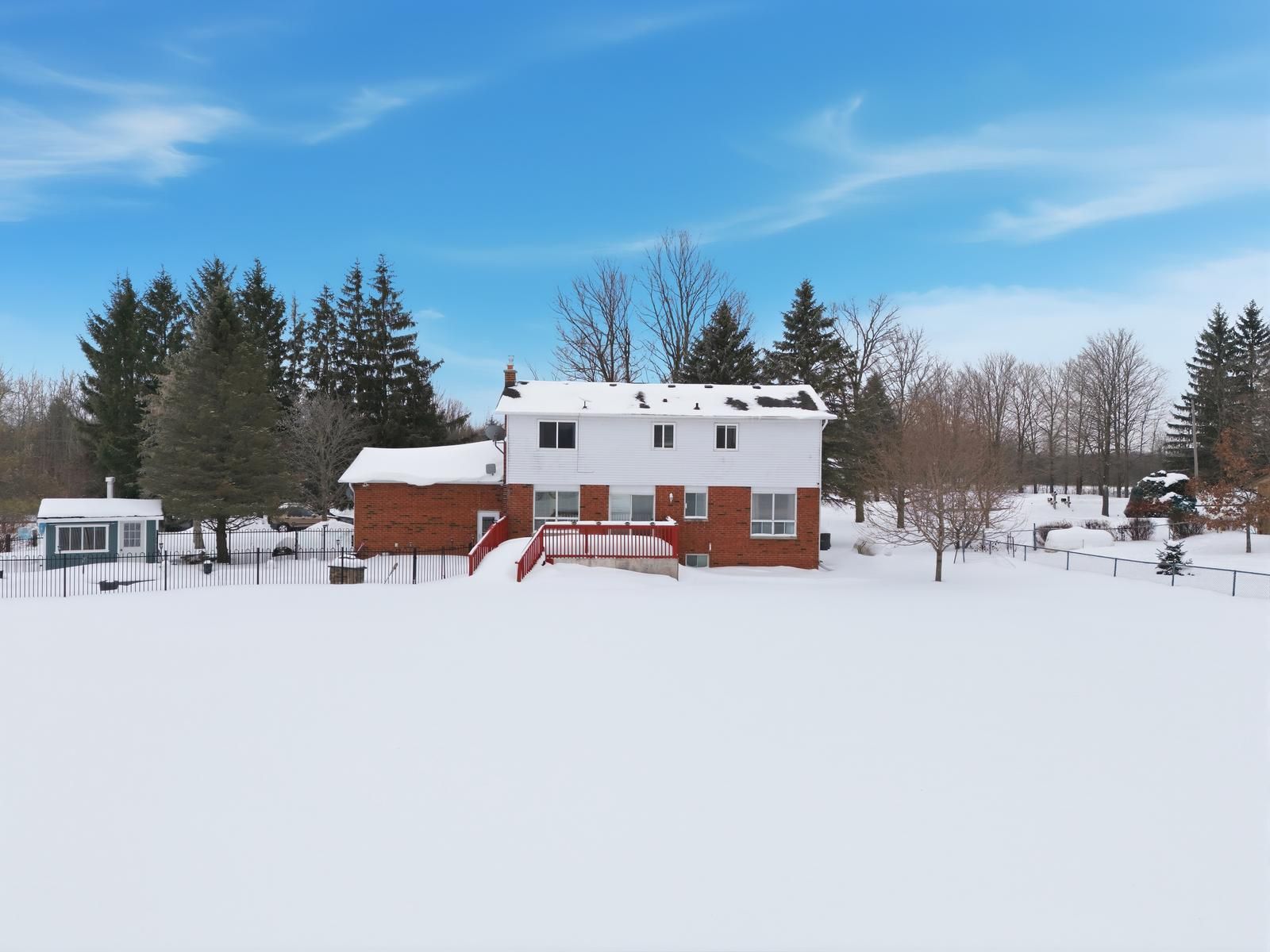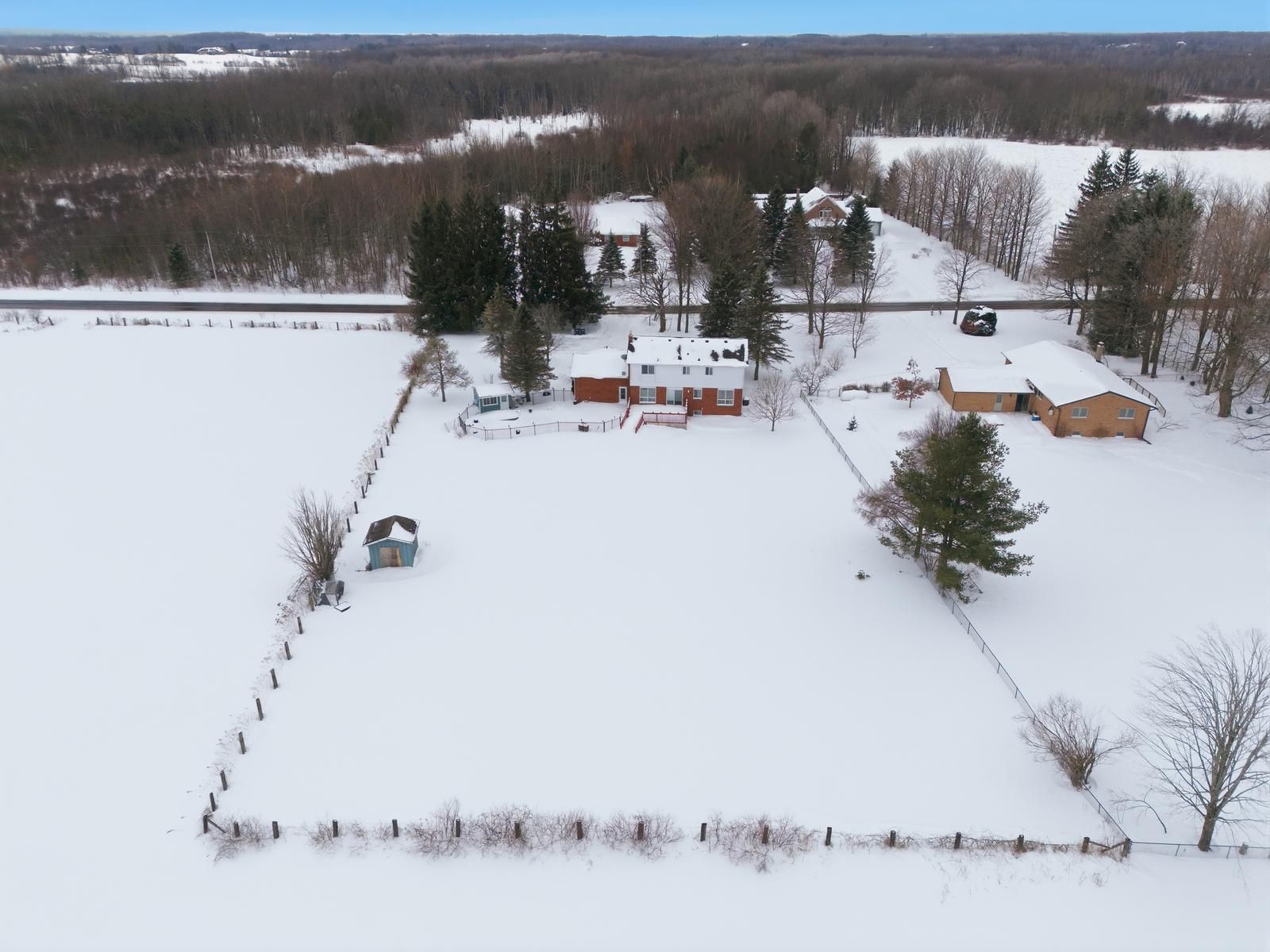 Welcome to this 2-storey family home on 1 acre with open views. This 4-bedroom property offers 2,200 sq ft above grade with a functional separate living, family & dining room layout. The bright kitchen flows into the family room with a gas fireplace. Hardwood flooring runs through the main living areas & the enclosed front porch adds additional usable space. The finished basement extends the home with a second gas fireplace and bar area. Outdoors, enjoy a saline inground pool, landscaping, oversized deck on the flat rectangular lot. Major updates include roof (2019), a/c (2022), water softener (2022),a newly paved driveway (2022) with parking for many vehicles, new staircase carpet (2026), updated kitchen (2026), removed bedroom carpet (2026).
