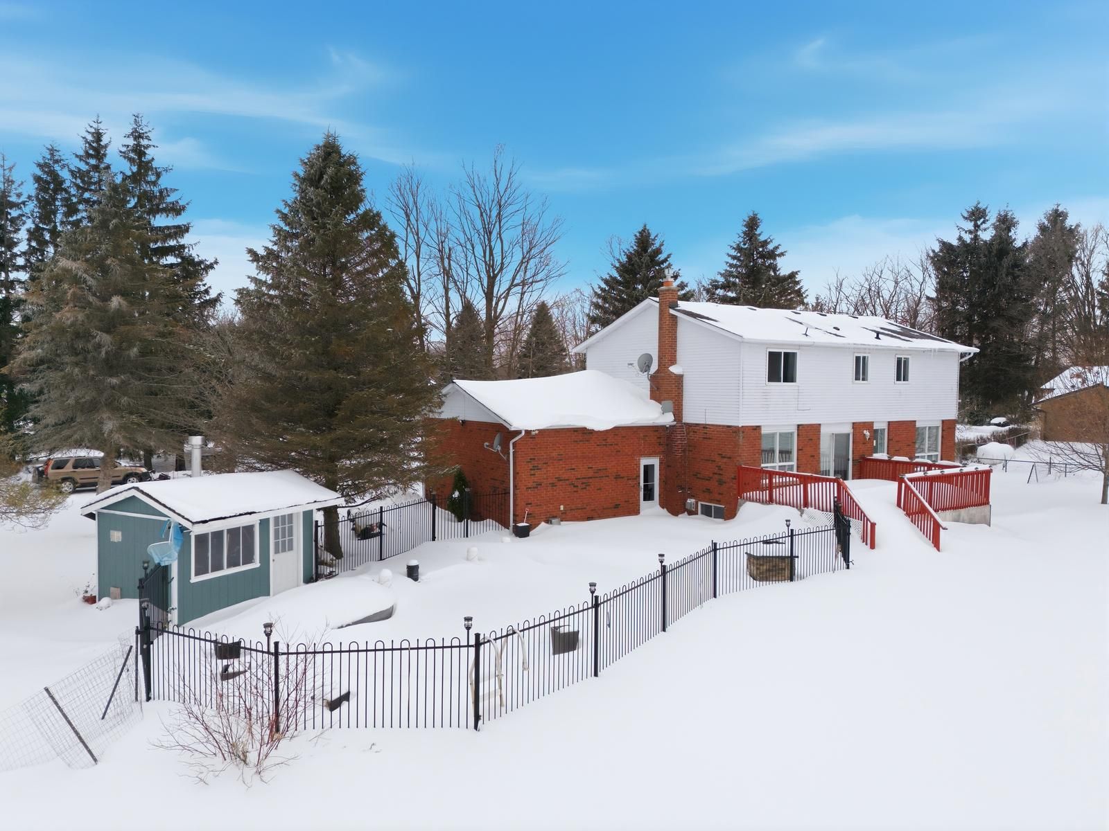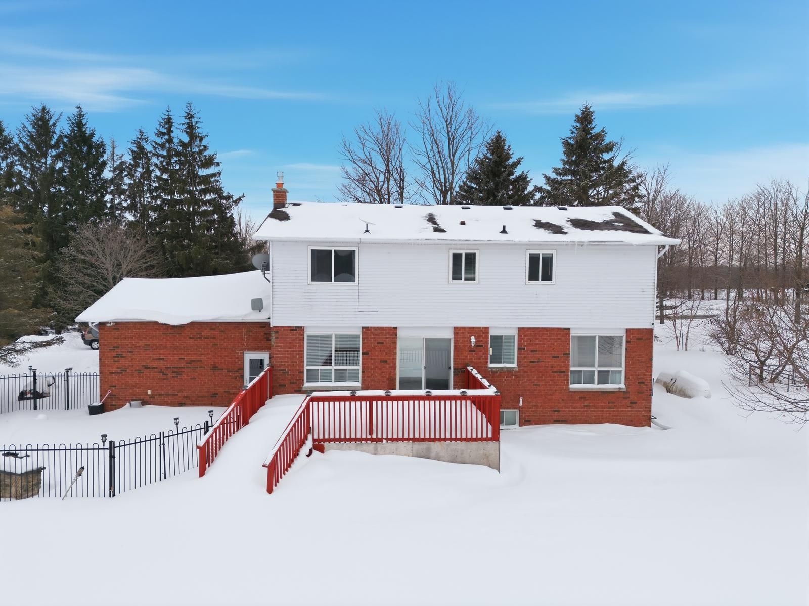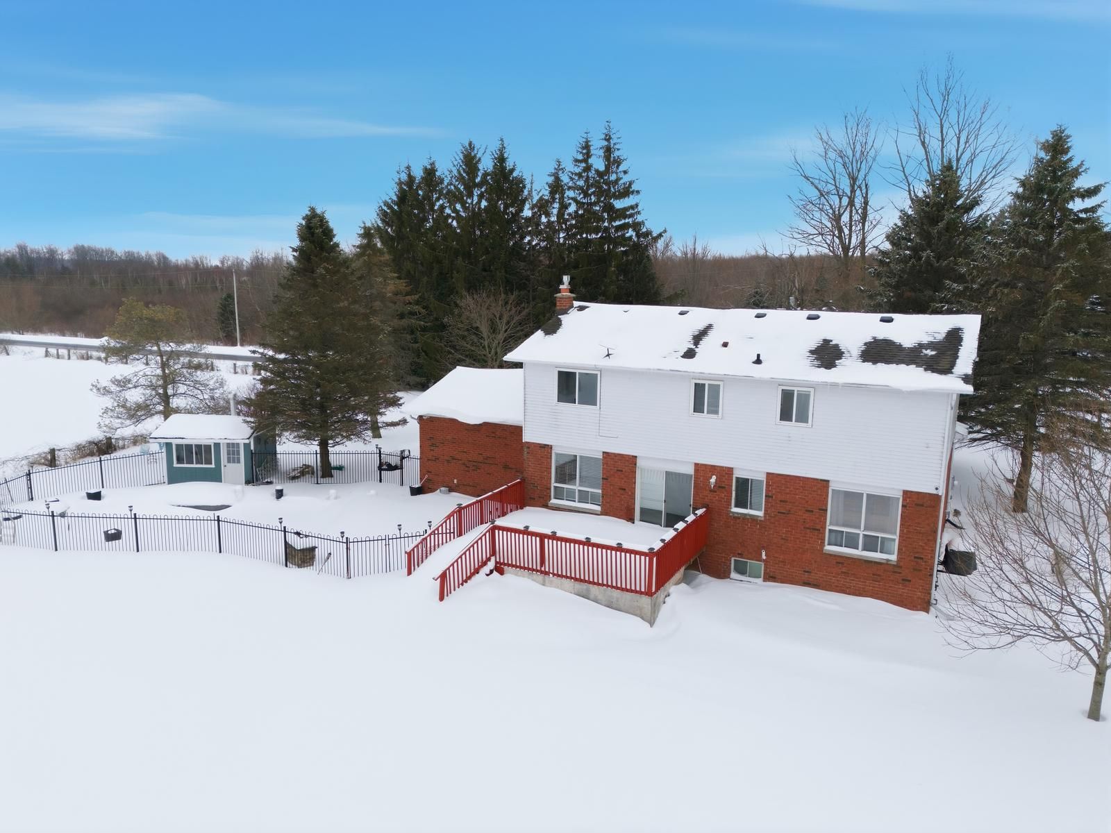 Welcome to this 2-storey family home on 1 acre with open views. This 4-bedroom property offers 2,200 sq ft above grade with a functional separate living, family & dining room layout. The bright kitchen flows into the family room with a gas fireplace. Hardwood flooring runs through the main living areas & the enclosed front porch adds additional usable space. The finished basement extends the home with a second gas fireplace and bar area. Outdoors, enjoy a saline inground pool, landscaping, oversized deck on the flat rectangular lot. Major updates include roof (2019), a/c (2022), water softener (2022),a newly paved driveway (2022) with parking for many vehicles, new staircase carpet (2026), updated kitchen (2026), removed bedroom carpet (2026).
