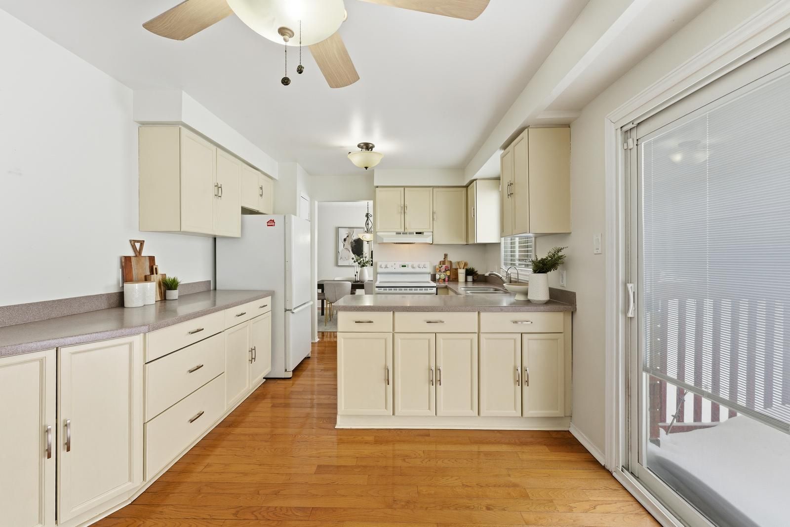 • Bright kitchen flows into family room featuring a gas fireplace.